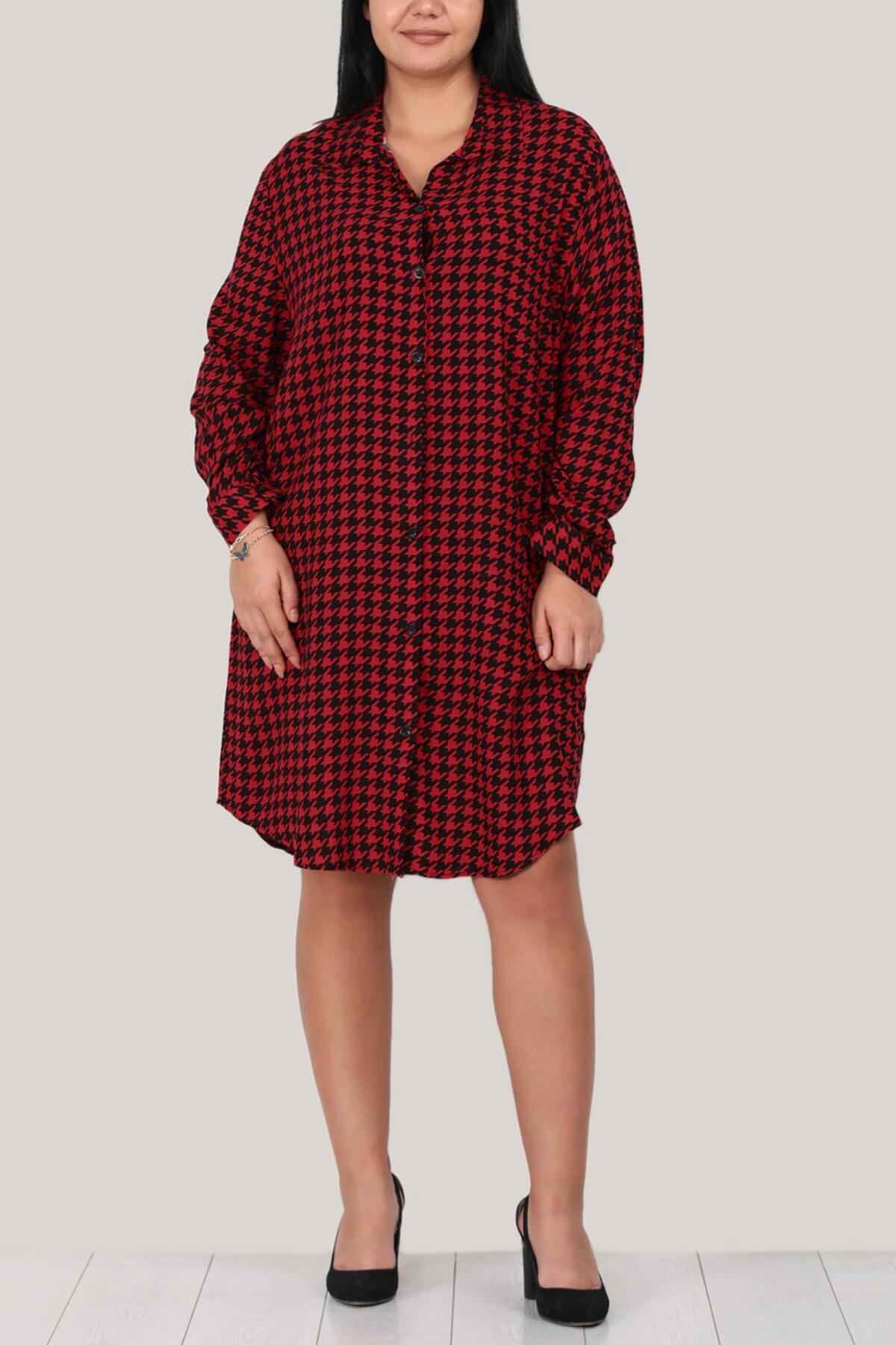 Büyük Beden Kısa Gömlek Elbise Kırmızı