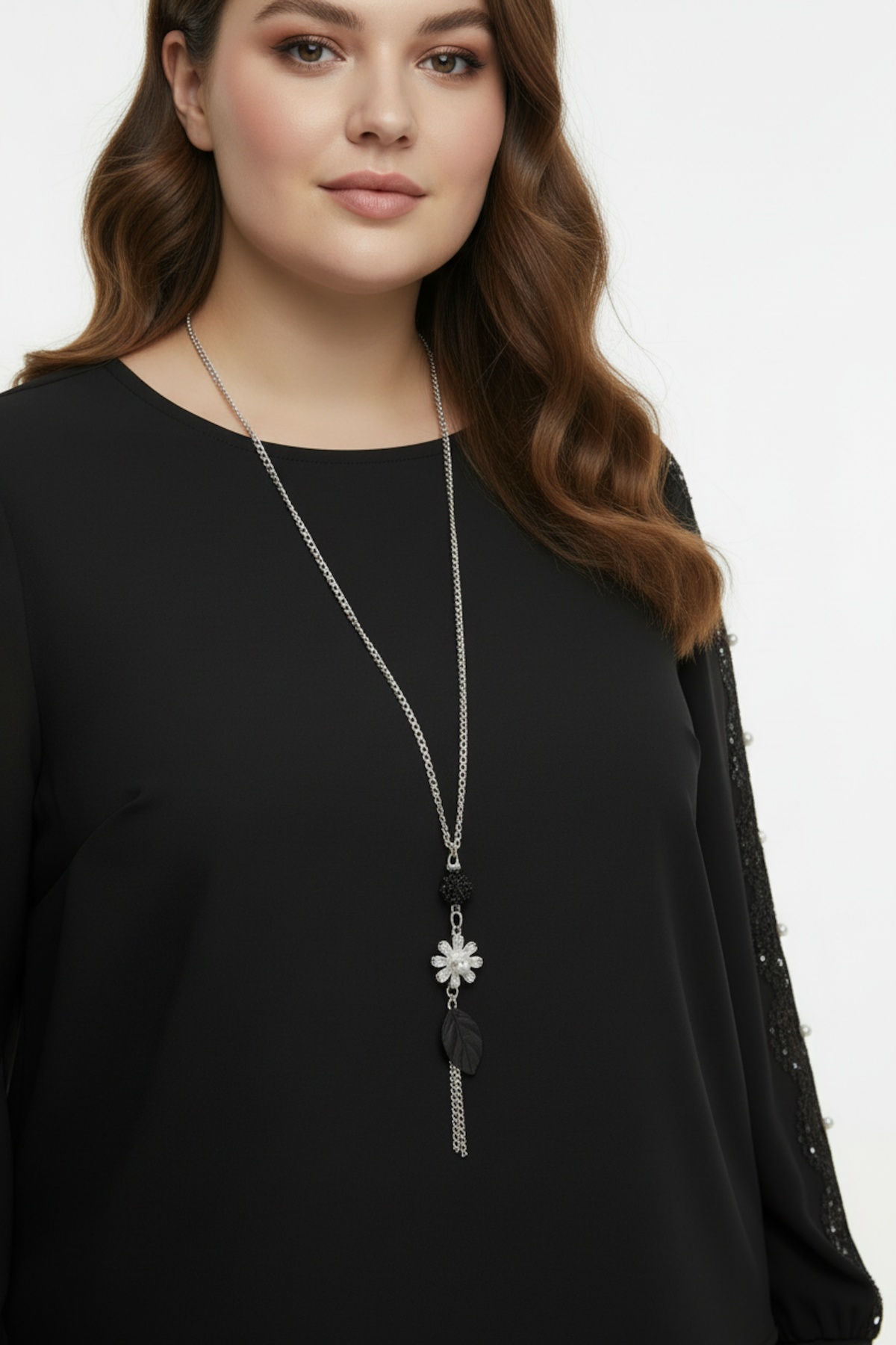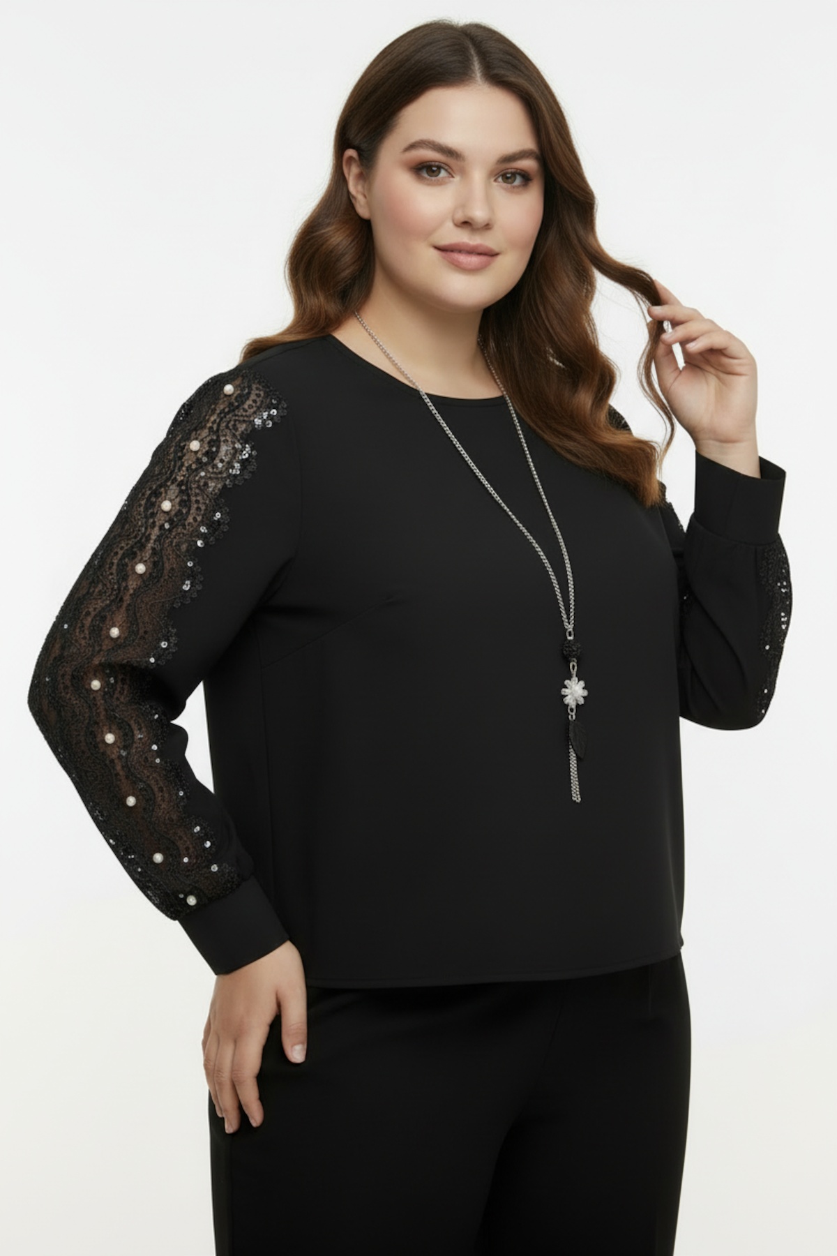 Zarafeti ve şıklığı bir araya getiren bu saks mavi bluz, gardırobunuzun vazgeçilmez parçası olacak! Kollarında özenle işlenmiş dantel detayları, mavi payetler, inciler ve pırlanta taşlarla süslenmiş bu bluz, hem günlük kullanımda hem de özel davetlerde rahatlıkla tercih edebileceğiniz çok yönlü bir tasarım. Yuvarlak yaka ve zarif kolyesiyle tamamlanan bu ürün, büyük beden konforunu şıklıkla buluşturuyor. Saks mavinin canlı tonu ve lüks detayları ile stilinize sofistike bir dokunuş katın.