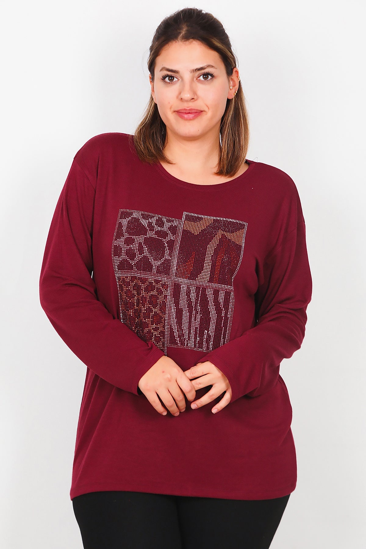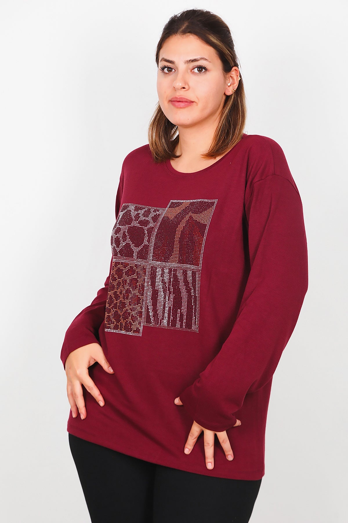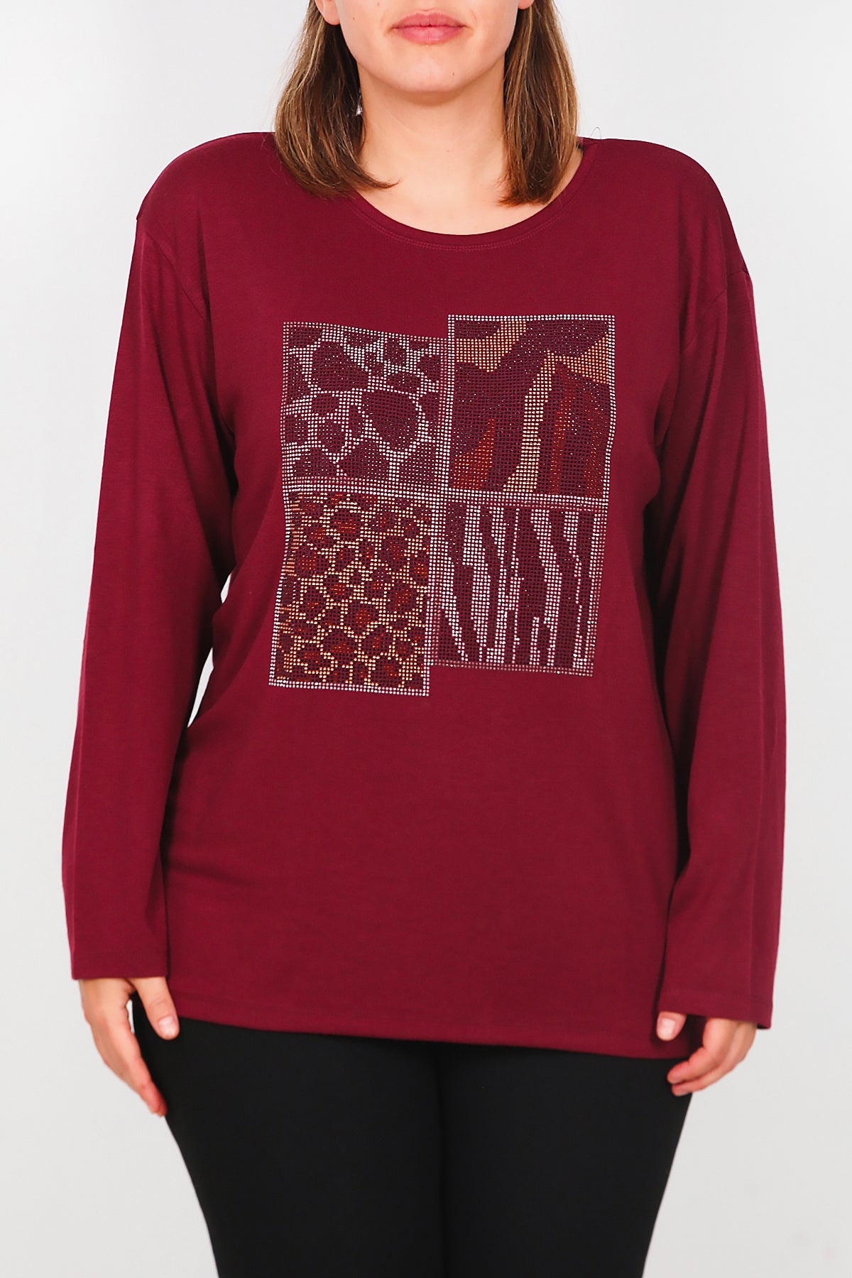 Büyük Beden Leopar Taşlı Uzun Kol Bluz Bordo