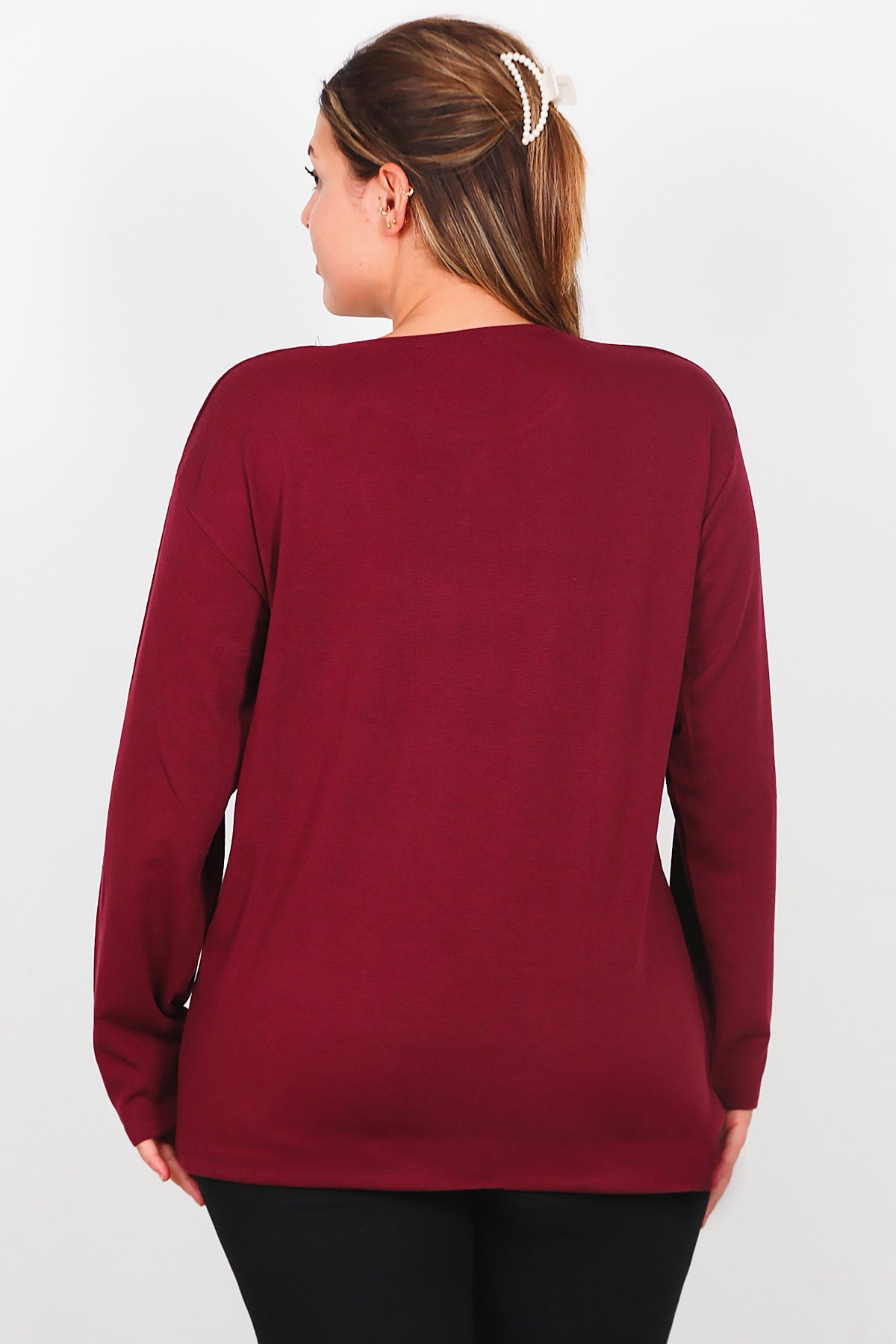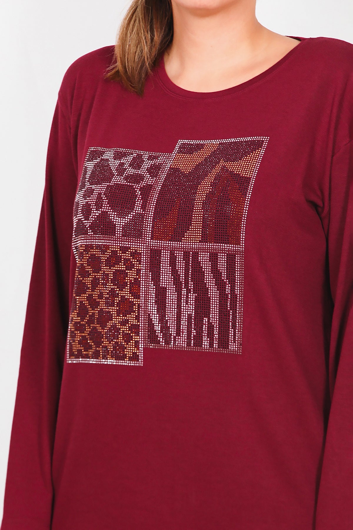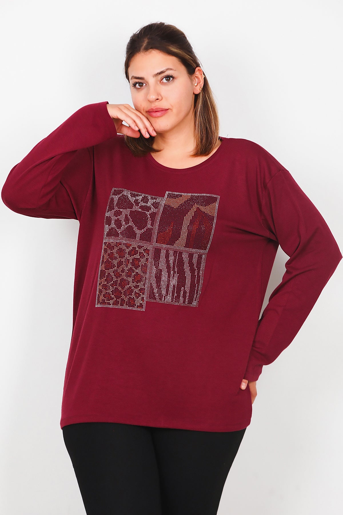 Büyük Beden Leopar Taşlı Uzun Kol Bluz Bordo