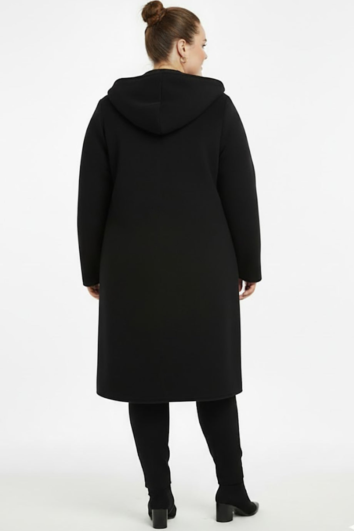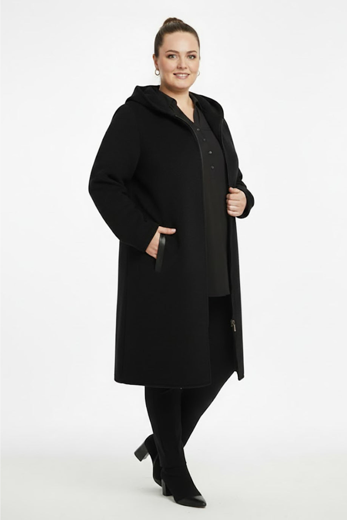 Büyük Beden Ön Fermuarlı Kapşonlu Kaban Siyah