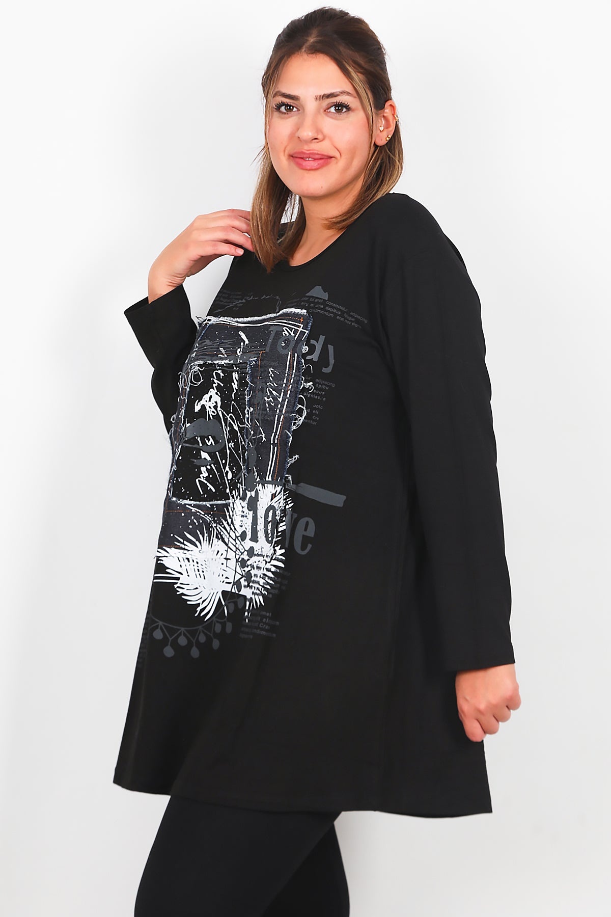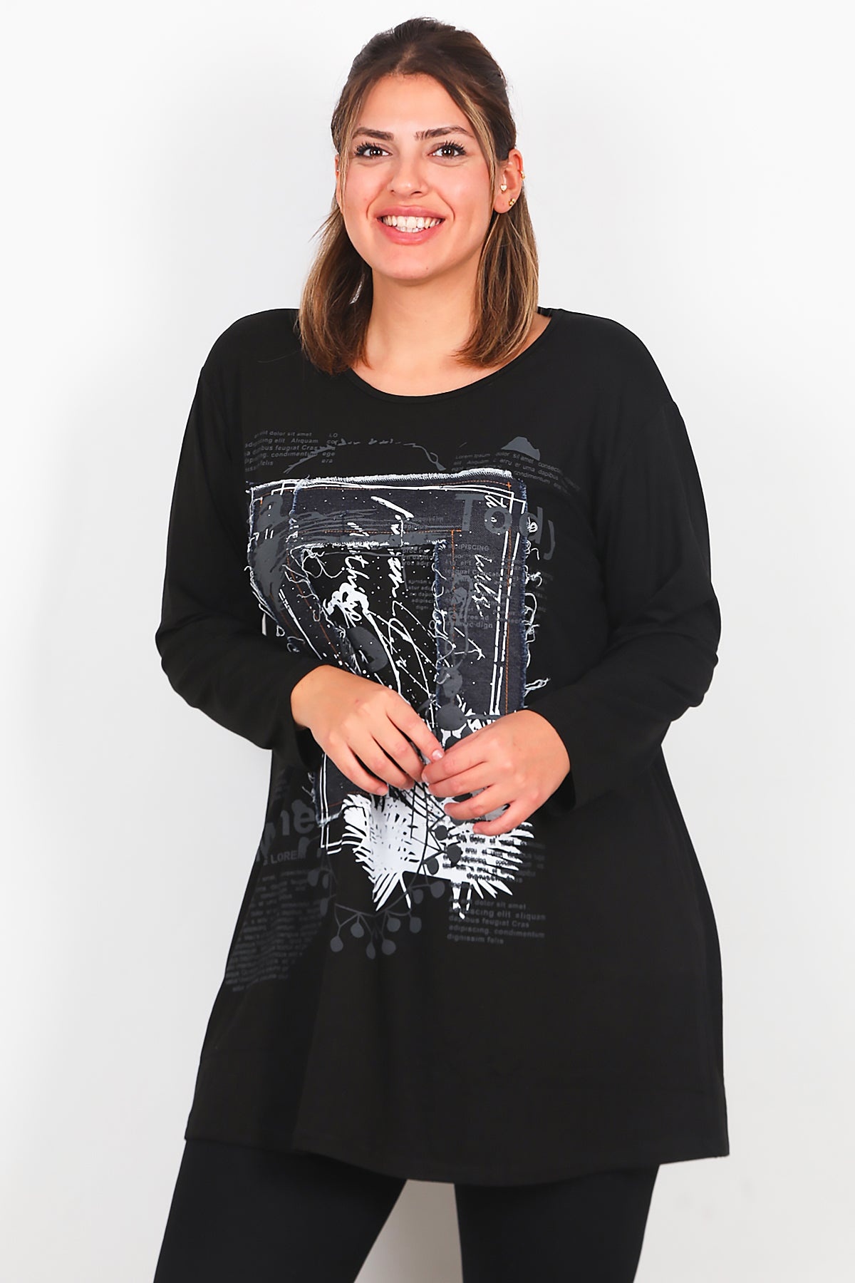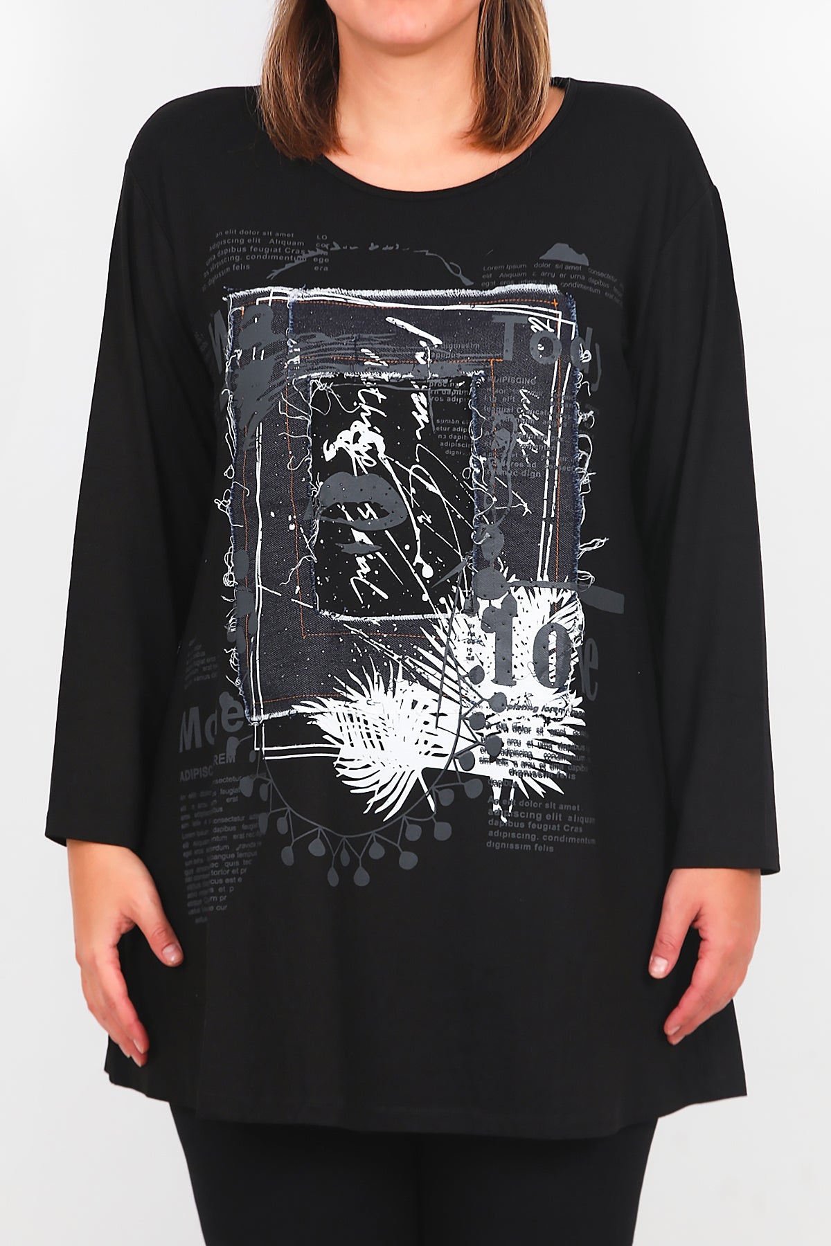 Büyük Beden Önü Kot Detay Uzun Kollu Bluz Siyah