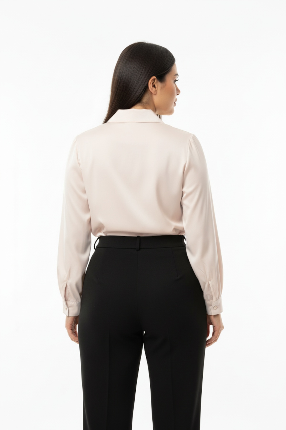 Zarif zincir detaylı V yakalı bluz, krem rengiyle klasik şıklığı modern dokunuşlarla birleştiriyor. Büyük beden kesimi ile konforlu kullanım sunan bu bluz, hem ofis hem de özel günler için ideal bir seçim.