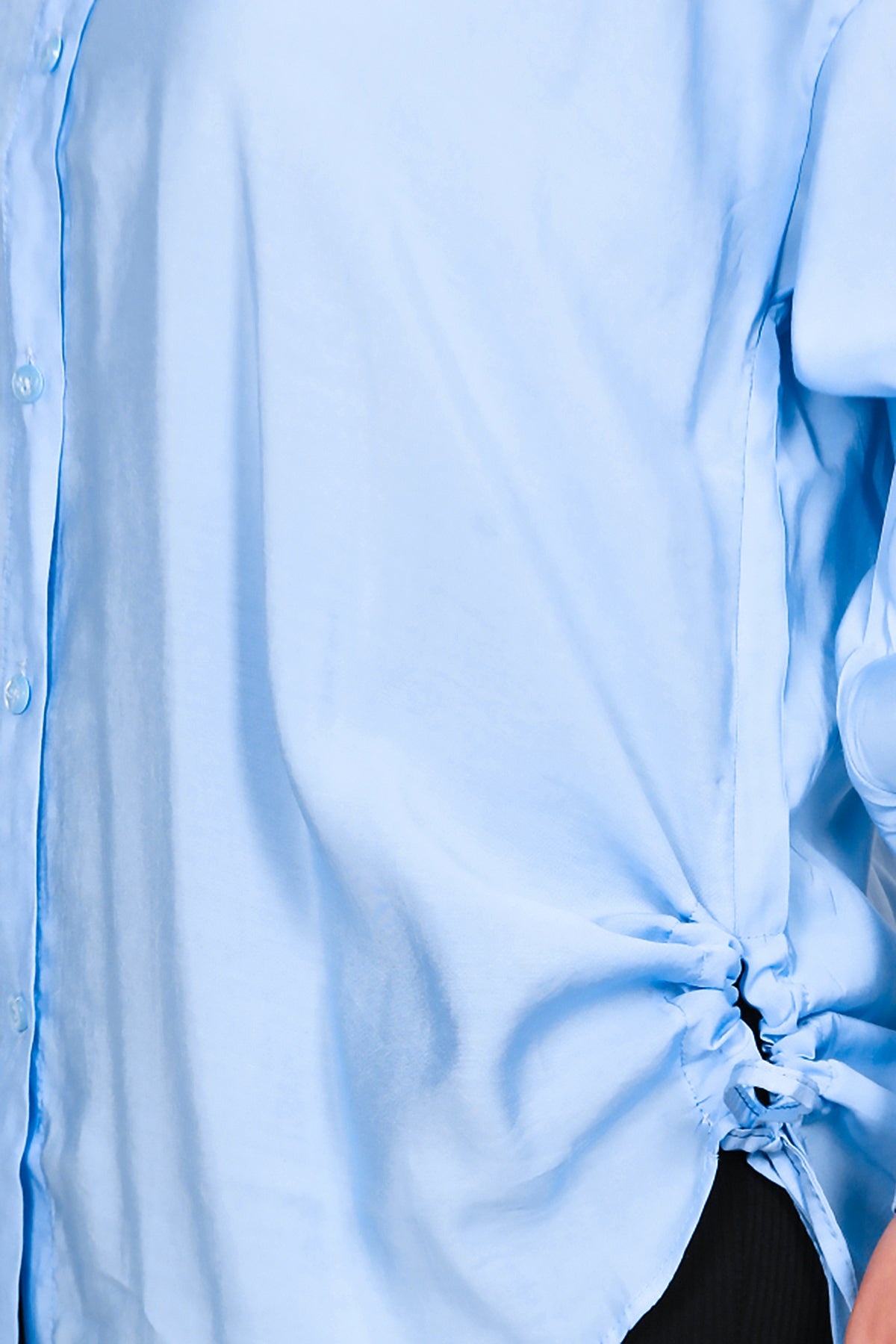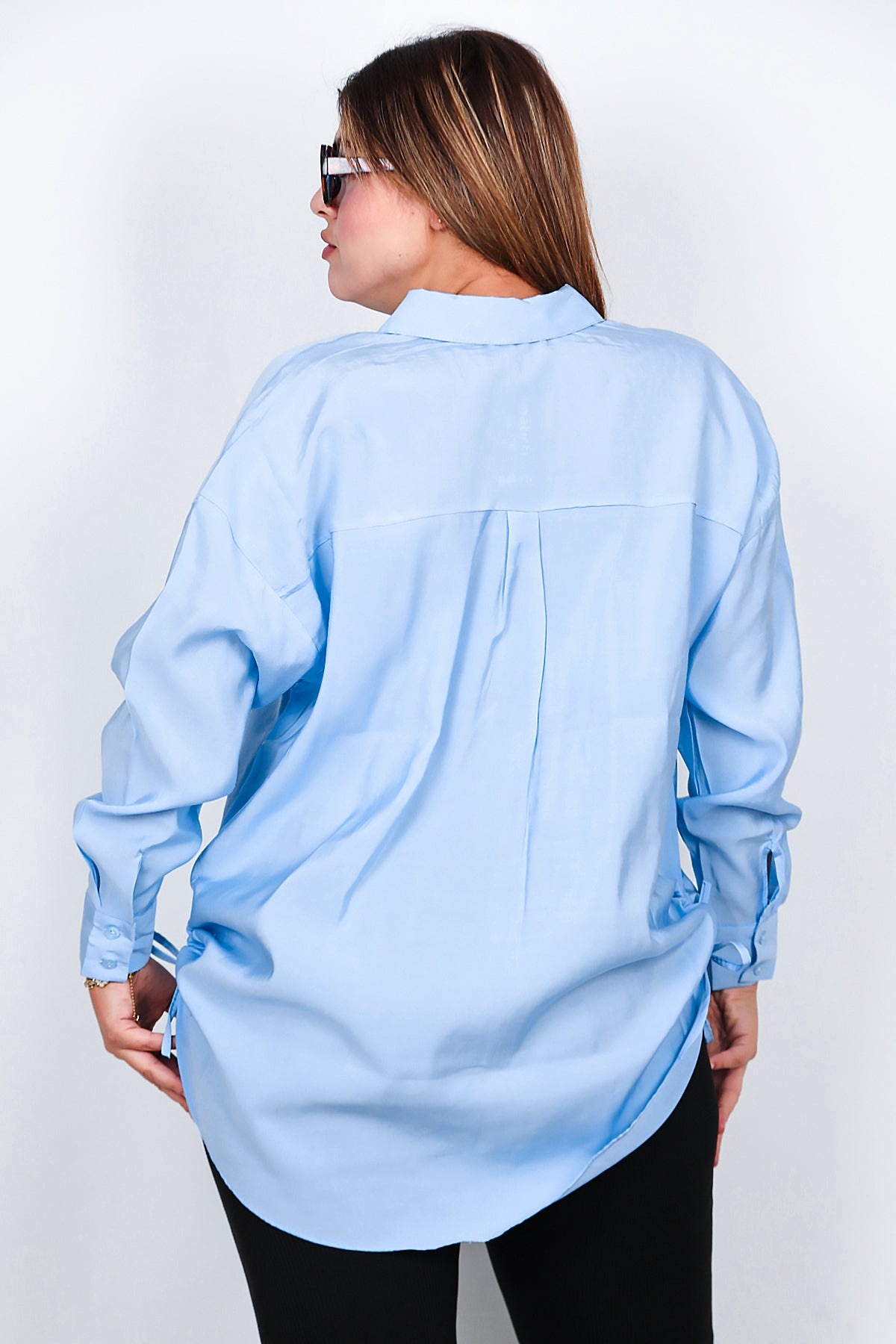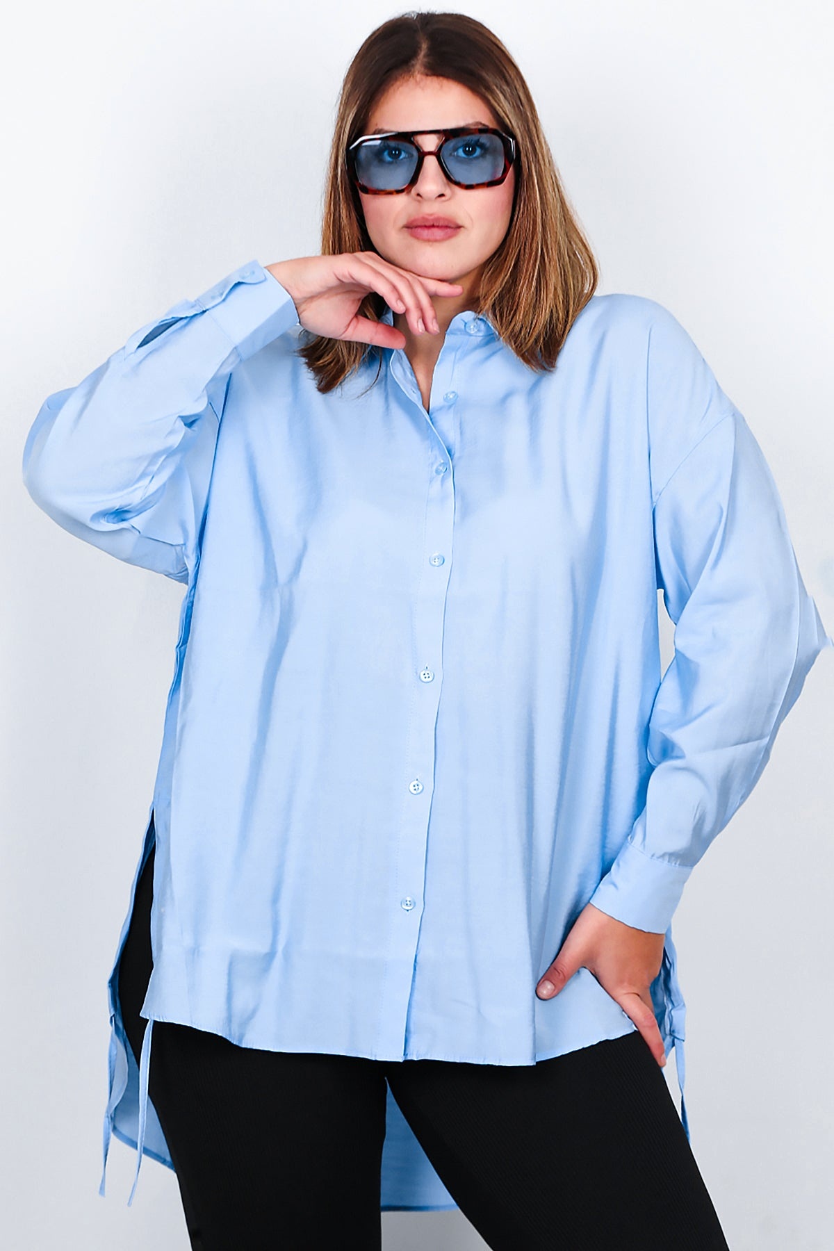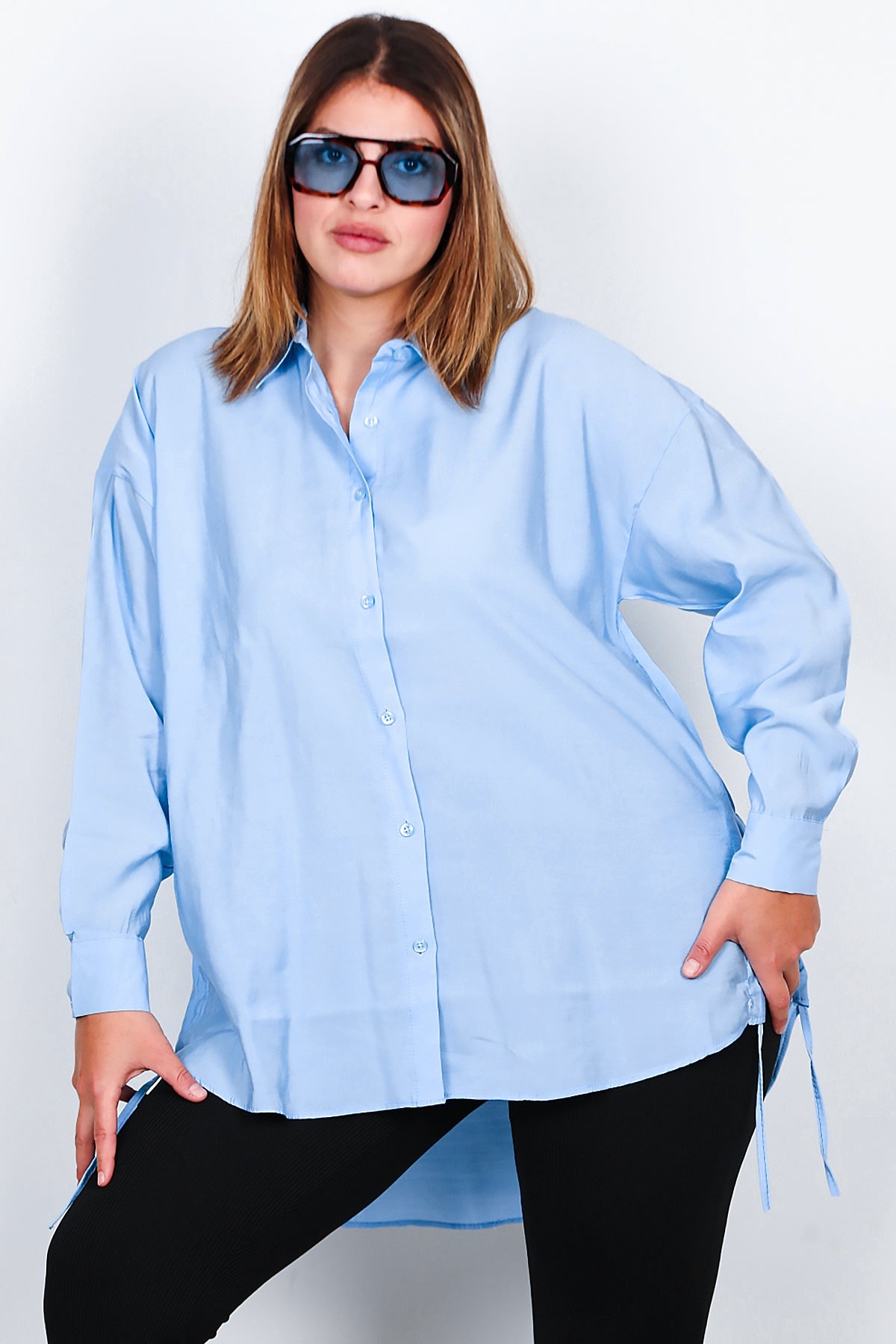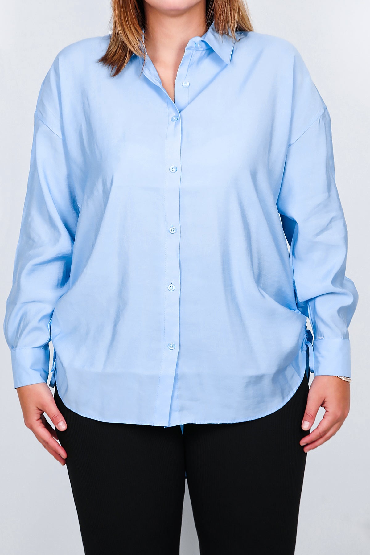 Büyük Beden Owersize Yan Bağcıklı Gömlek Buz Mavisi
