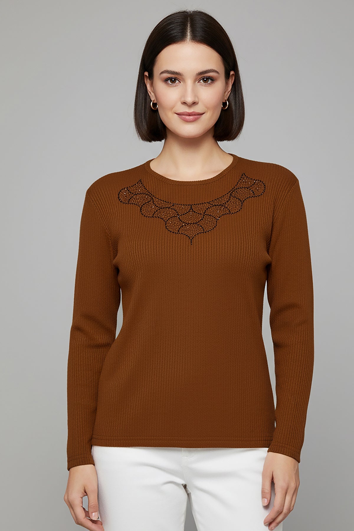 Büyük Beden Taş İşlemeli Bluz Kahverengi
