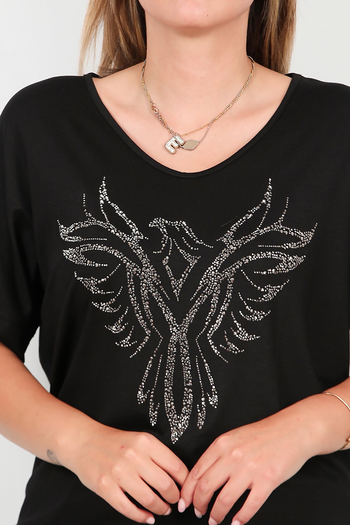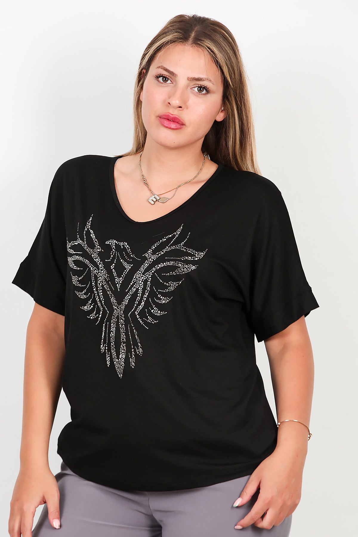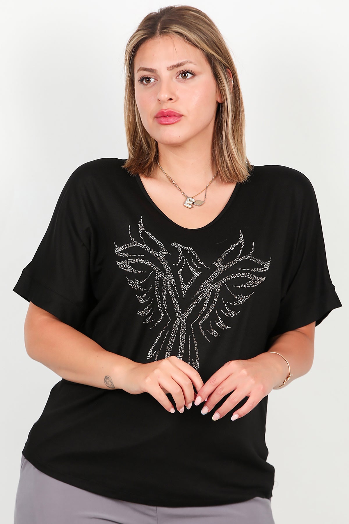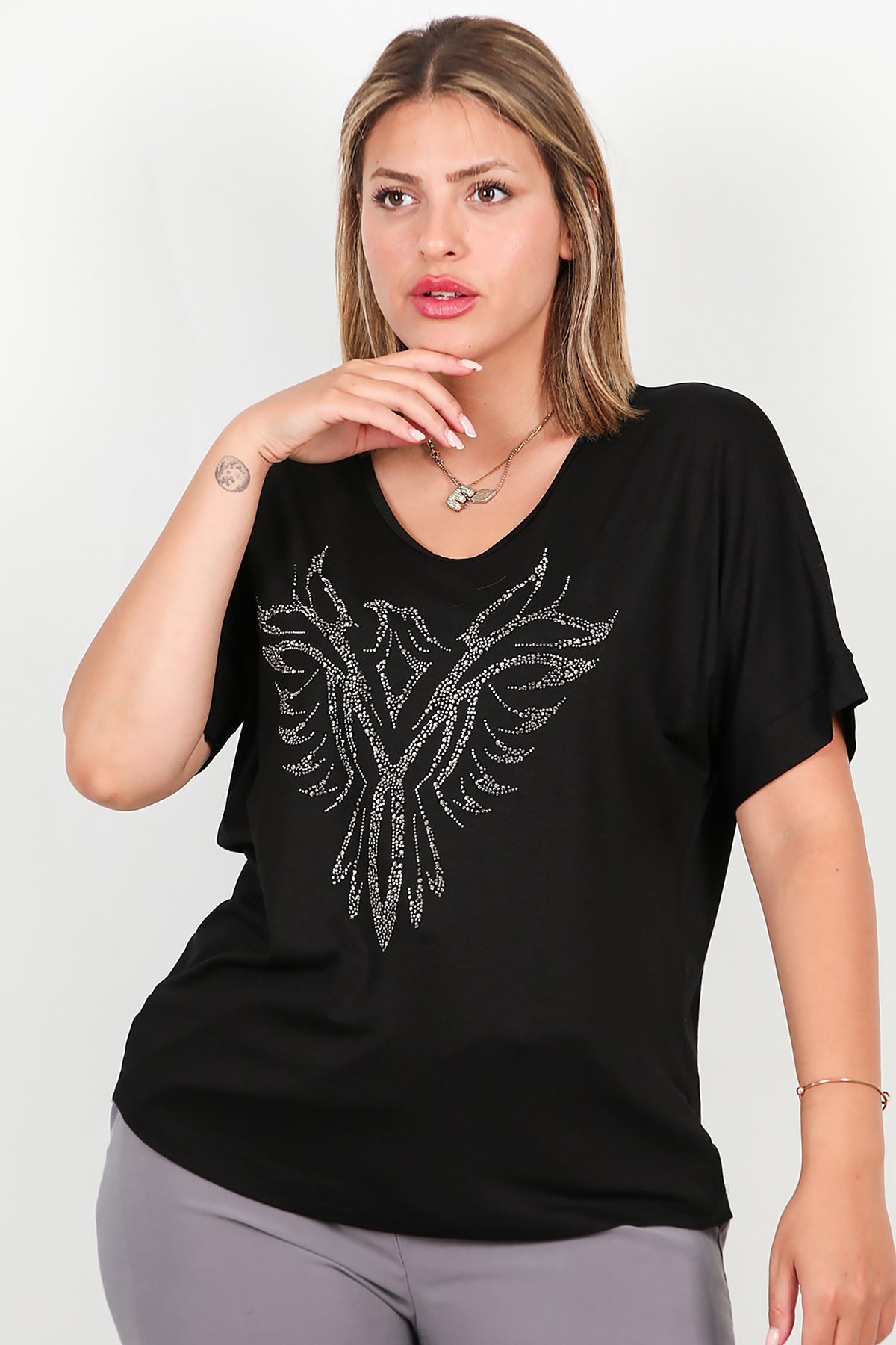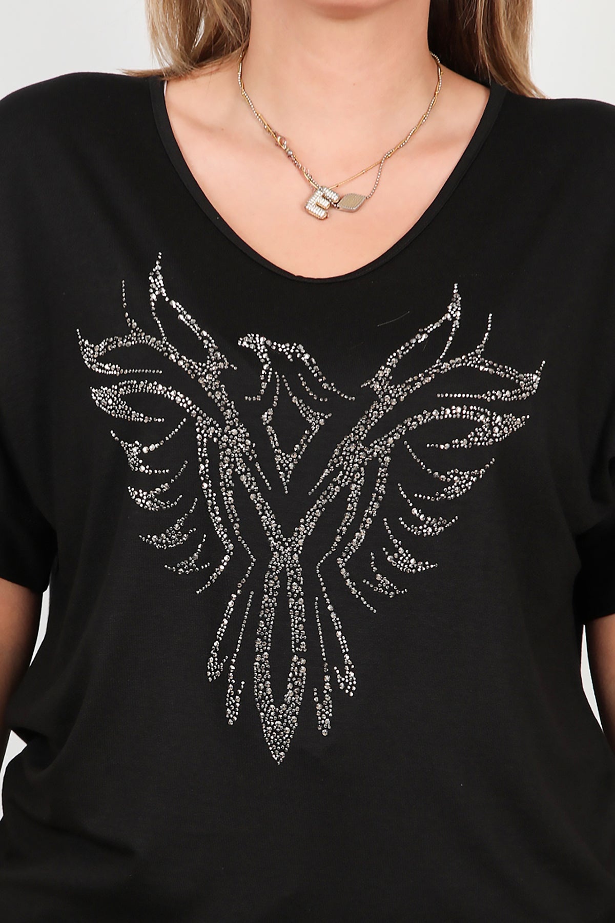 Büyük Beden Taş İşlemeli Bluz Siyah