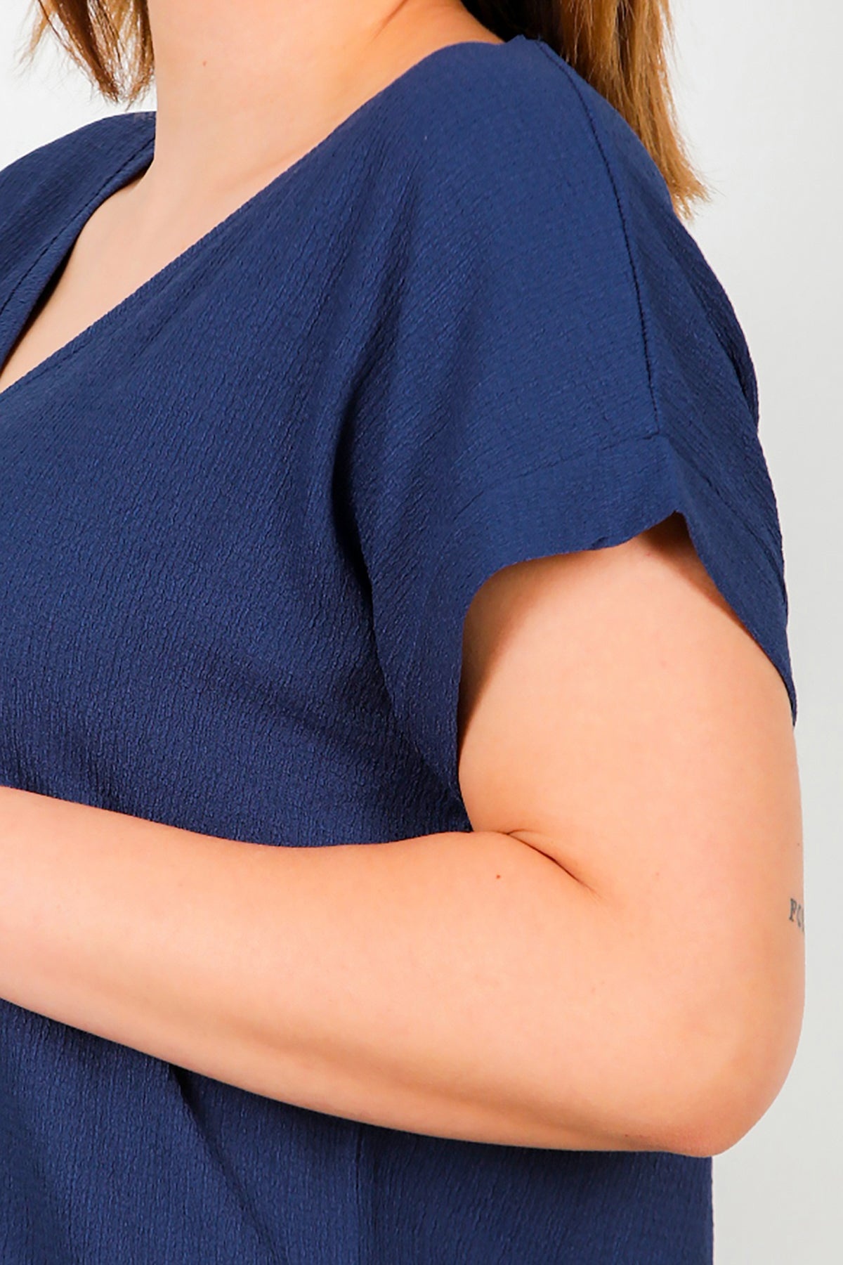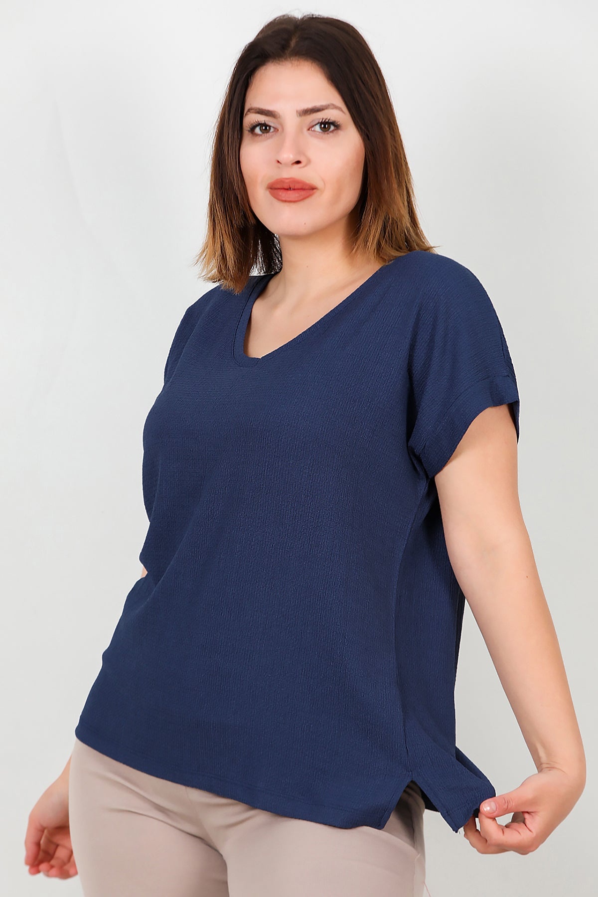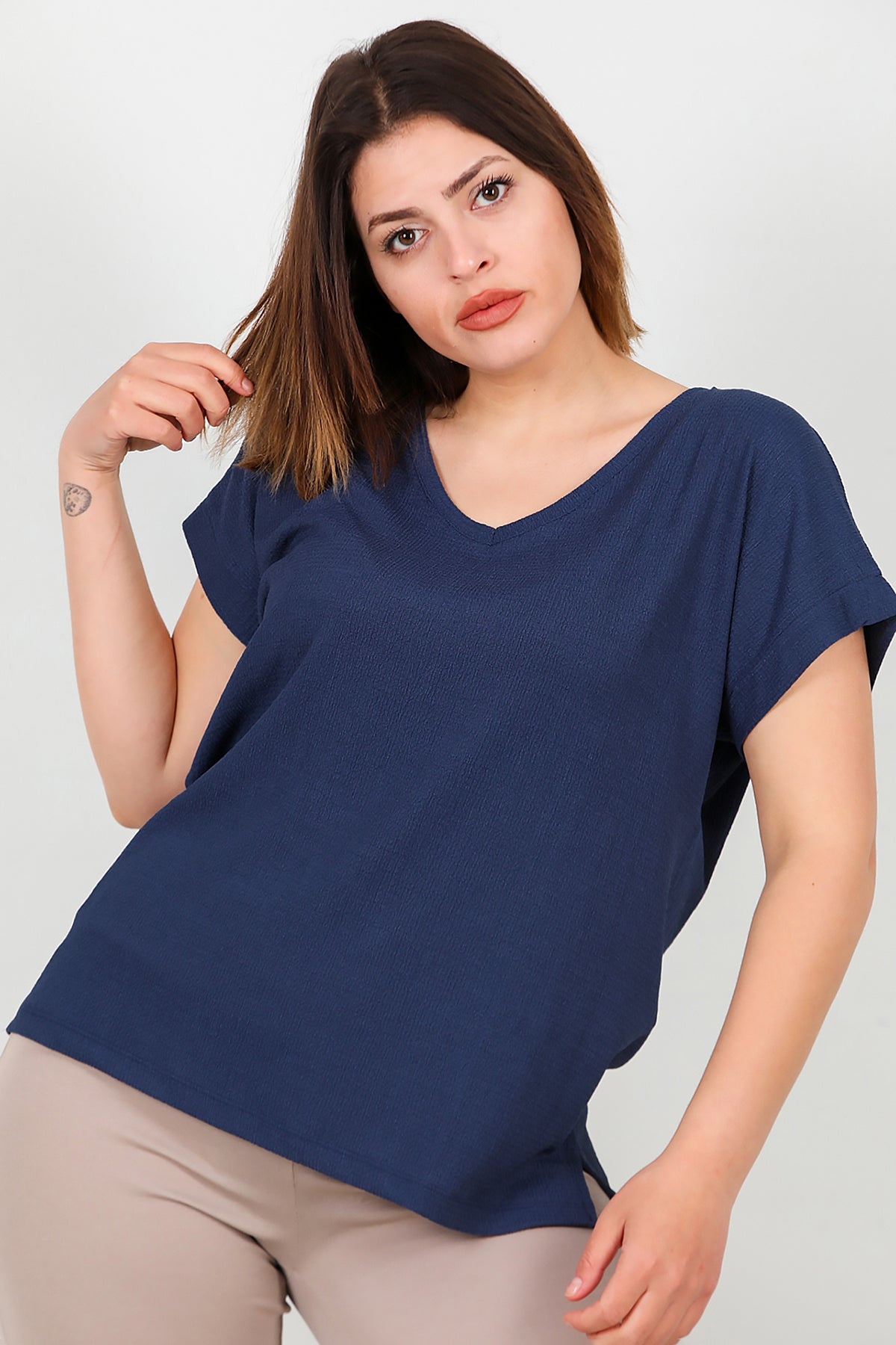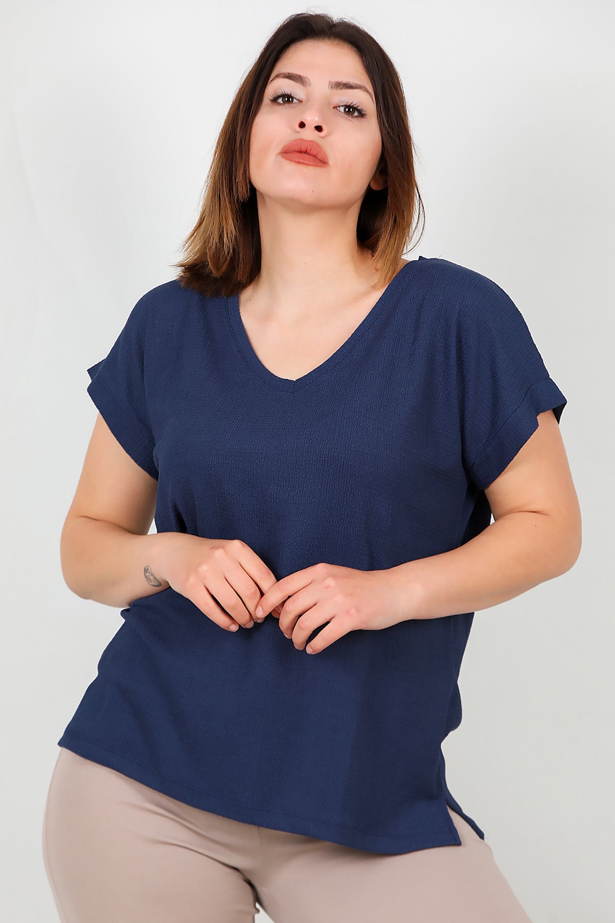 Büyük Beden V Yaka Bürümcük Bluz Lacivert