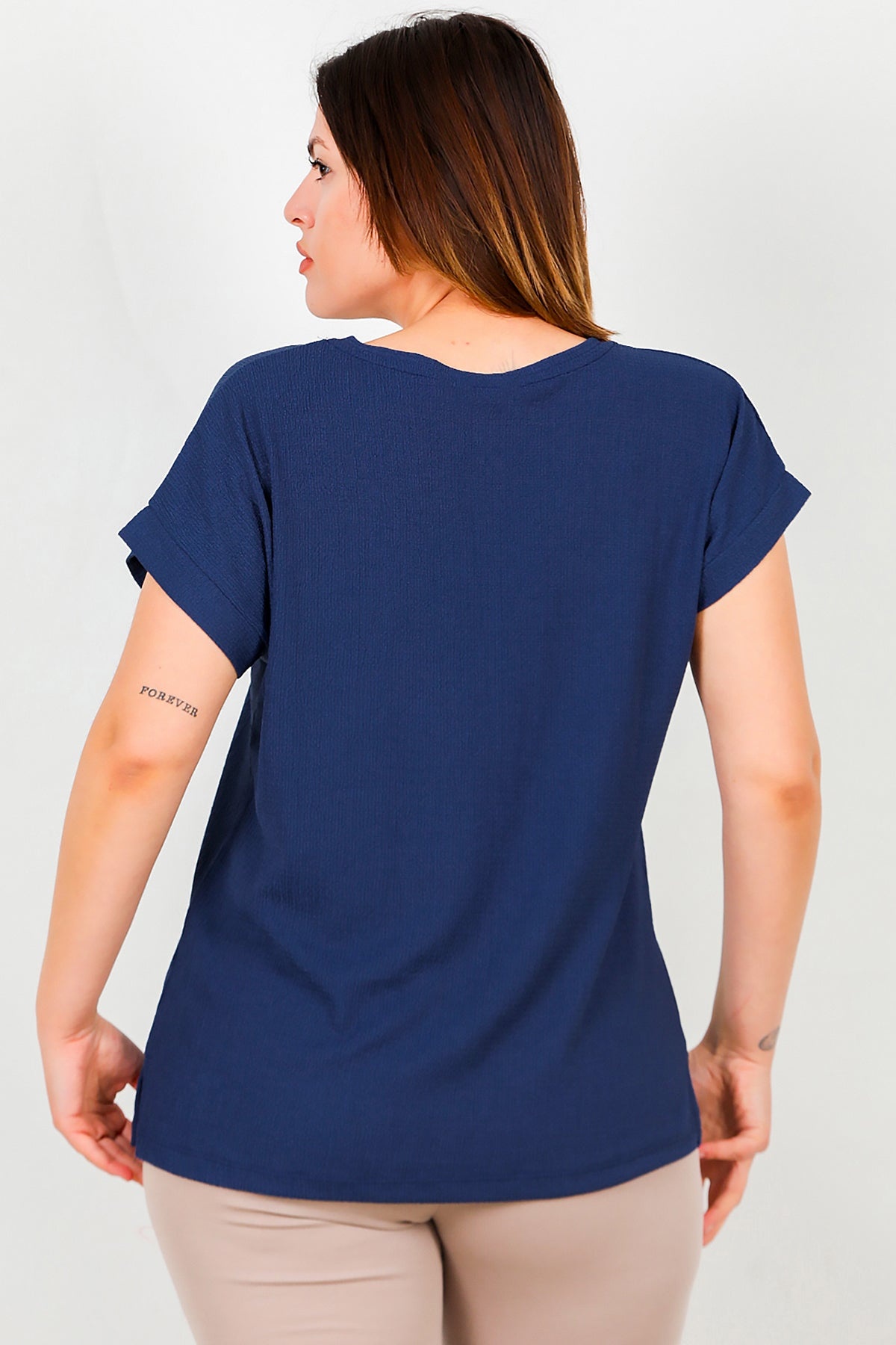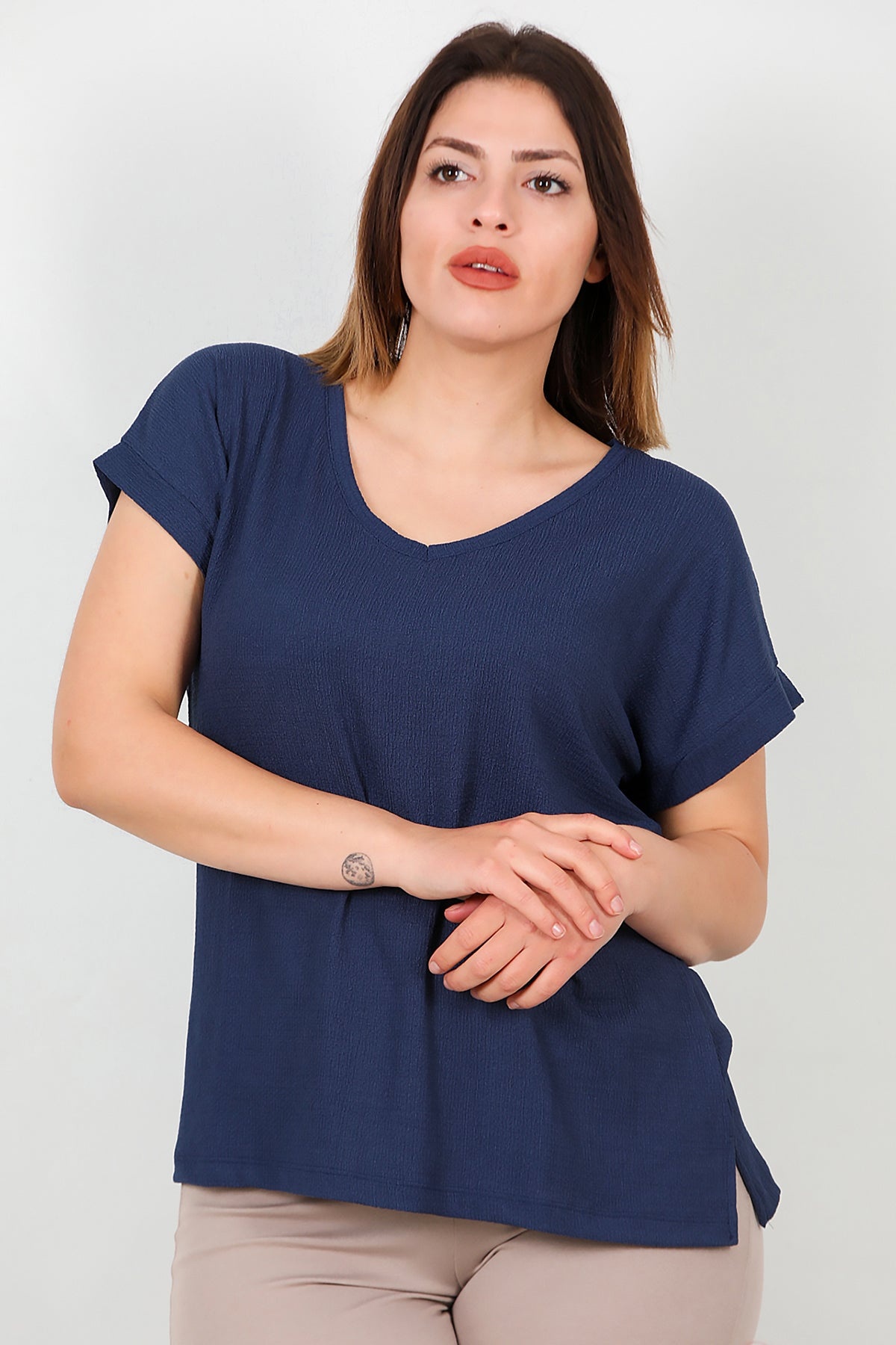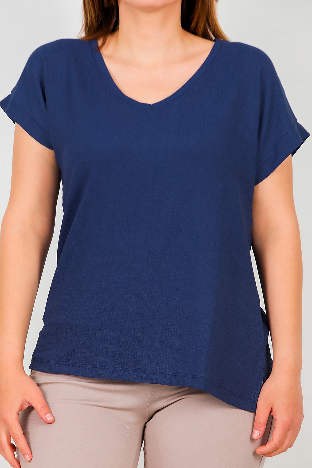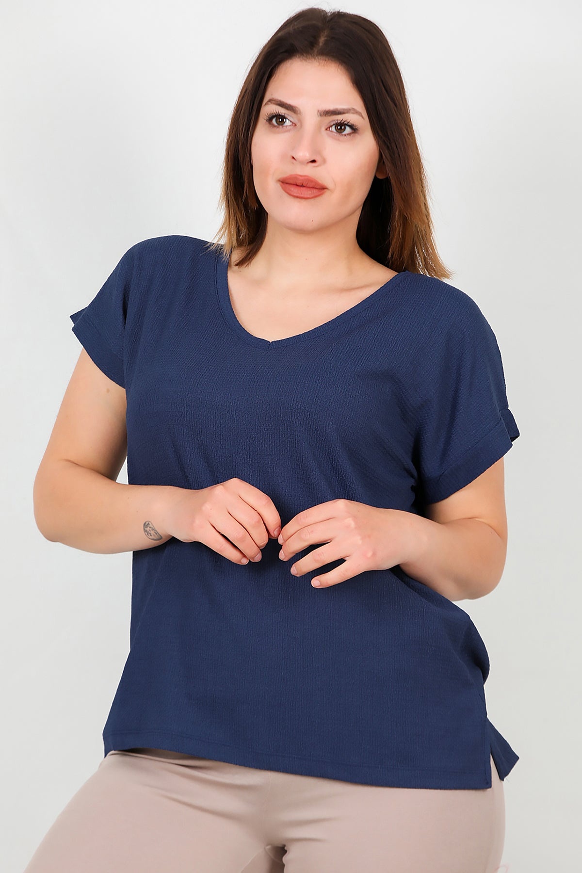 Büyük Beden V Yaka Bürümcük Bluz Lacivert