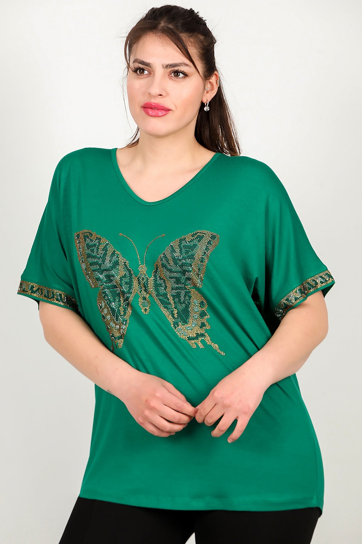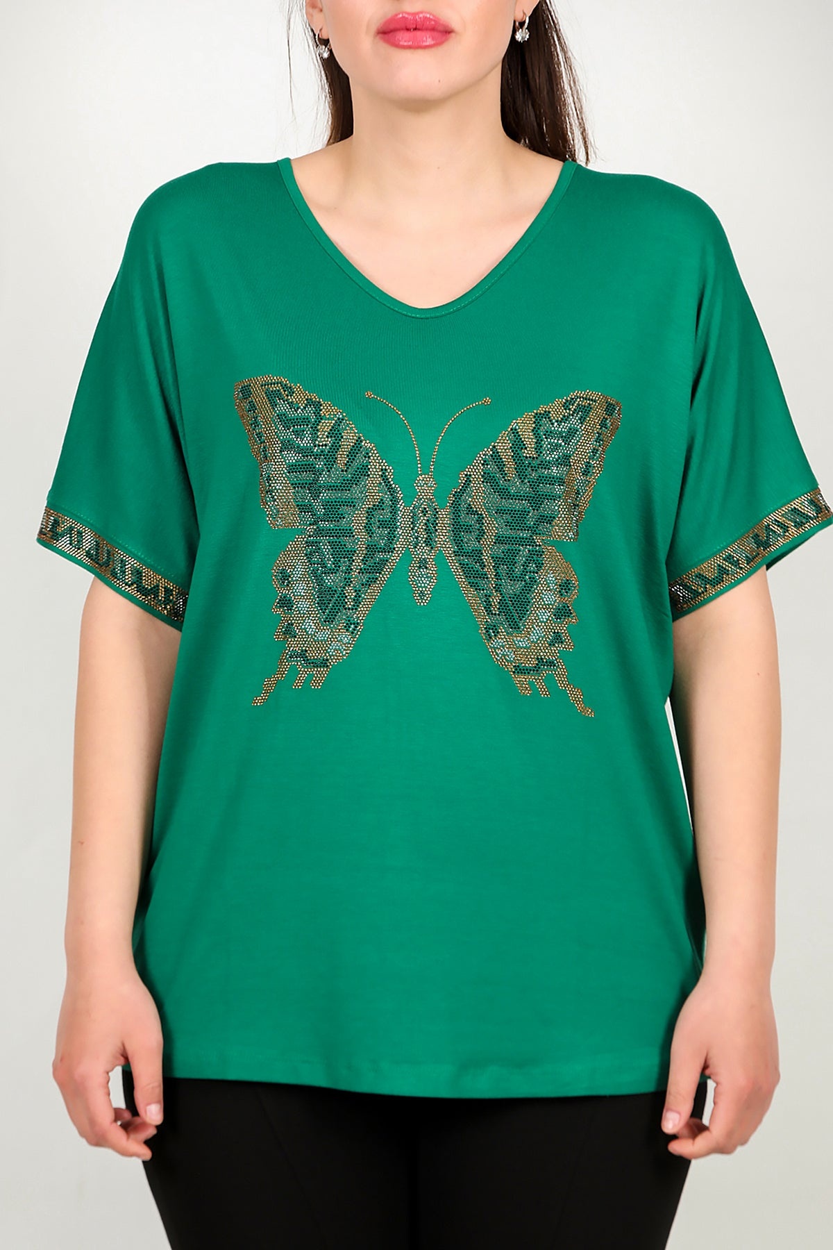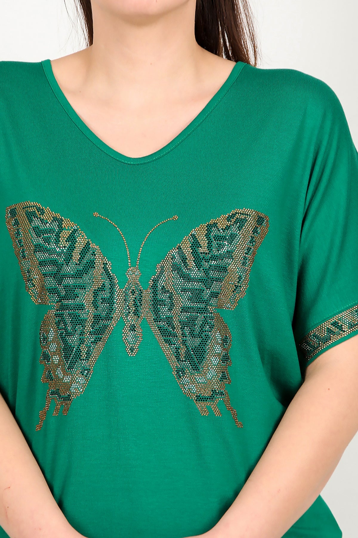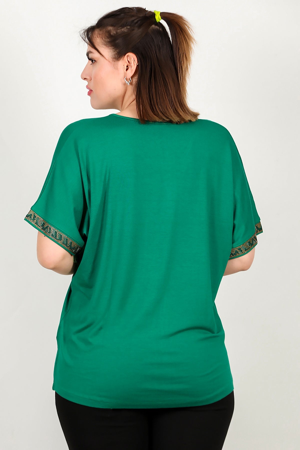 Büyük Beden V Yaka Taşlı Bluz Yeşil