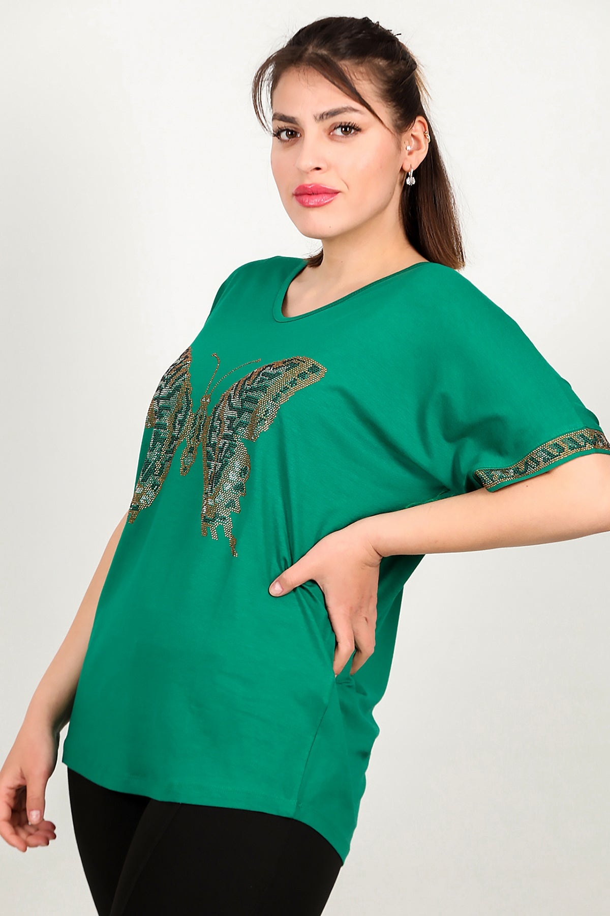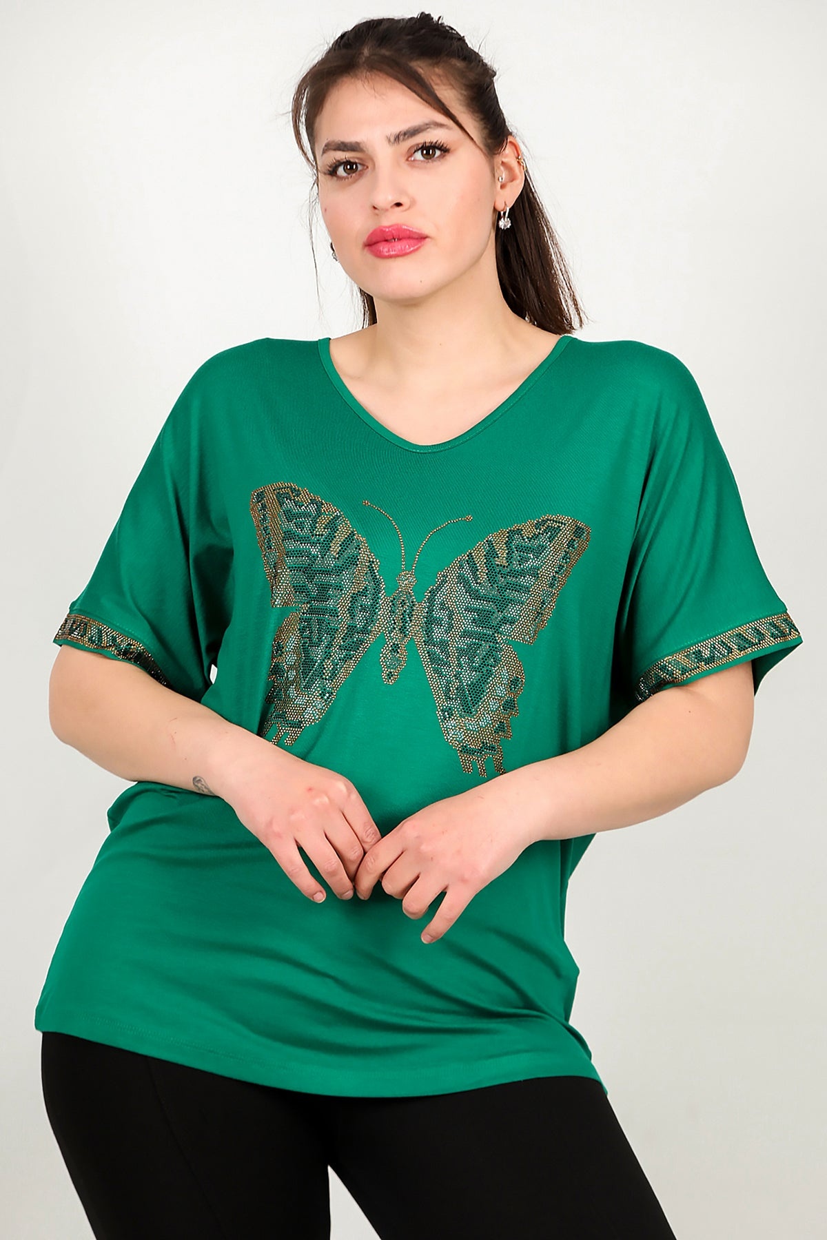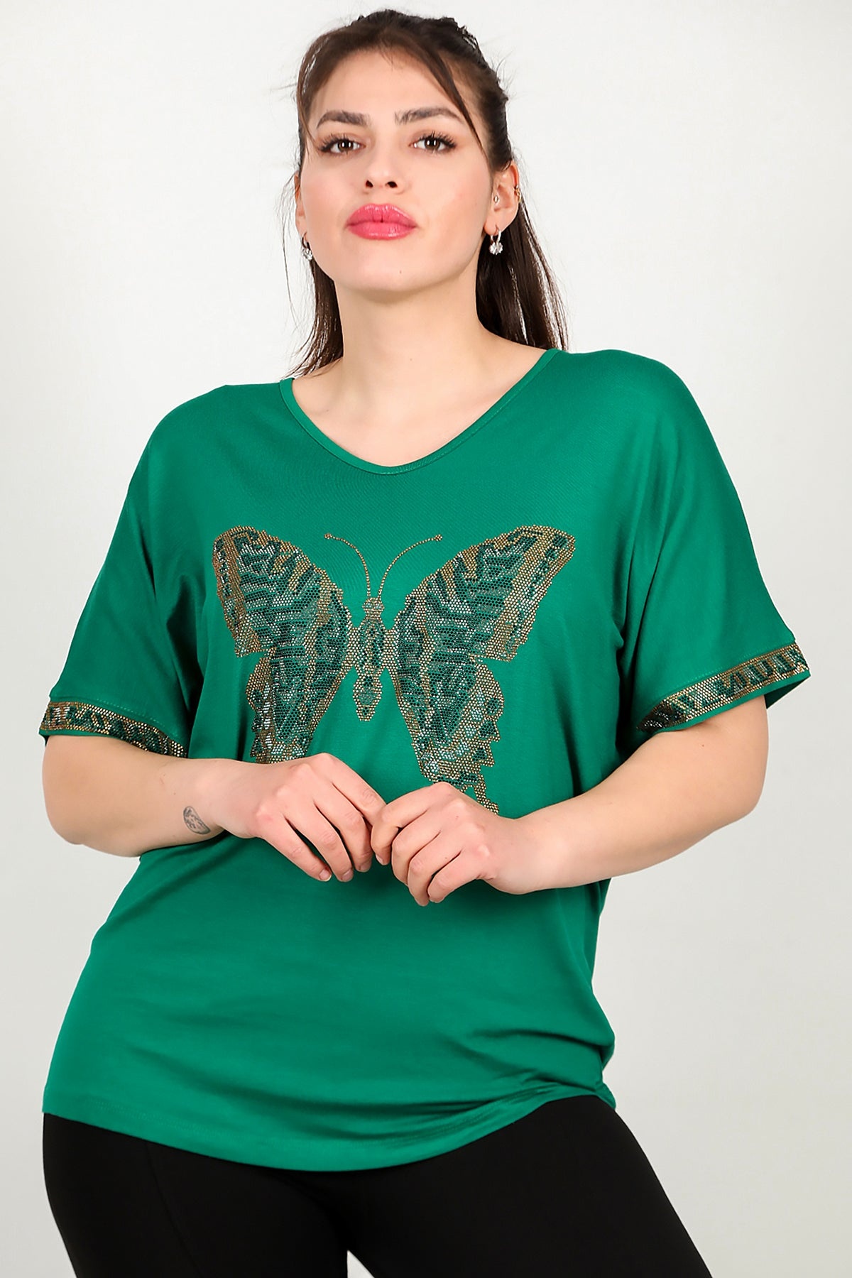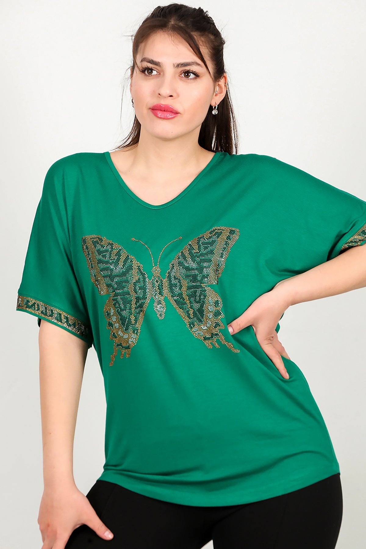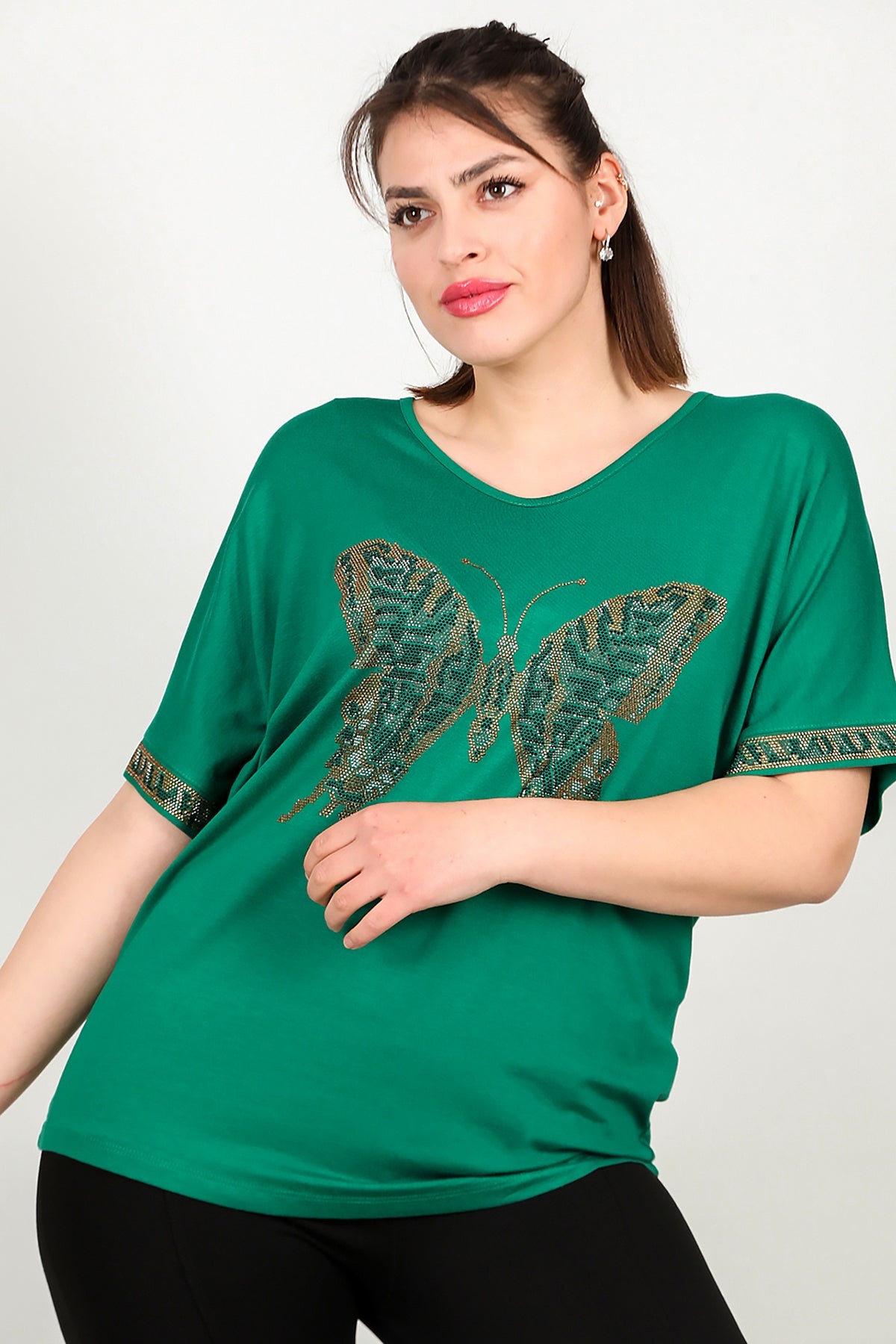 Büyük Beden V Yaka Taşlı Bluz Yeşil