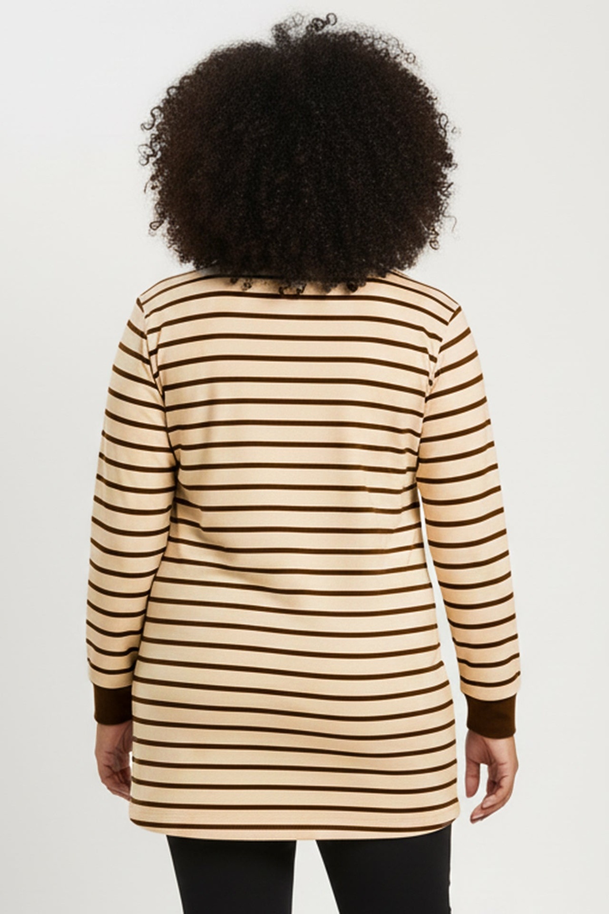 Büyük Beden Yan Yırtmaçlı Bisiklet Yaka Çizgili Tunik Krem