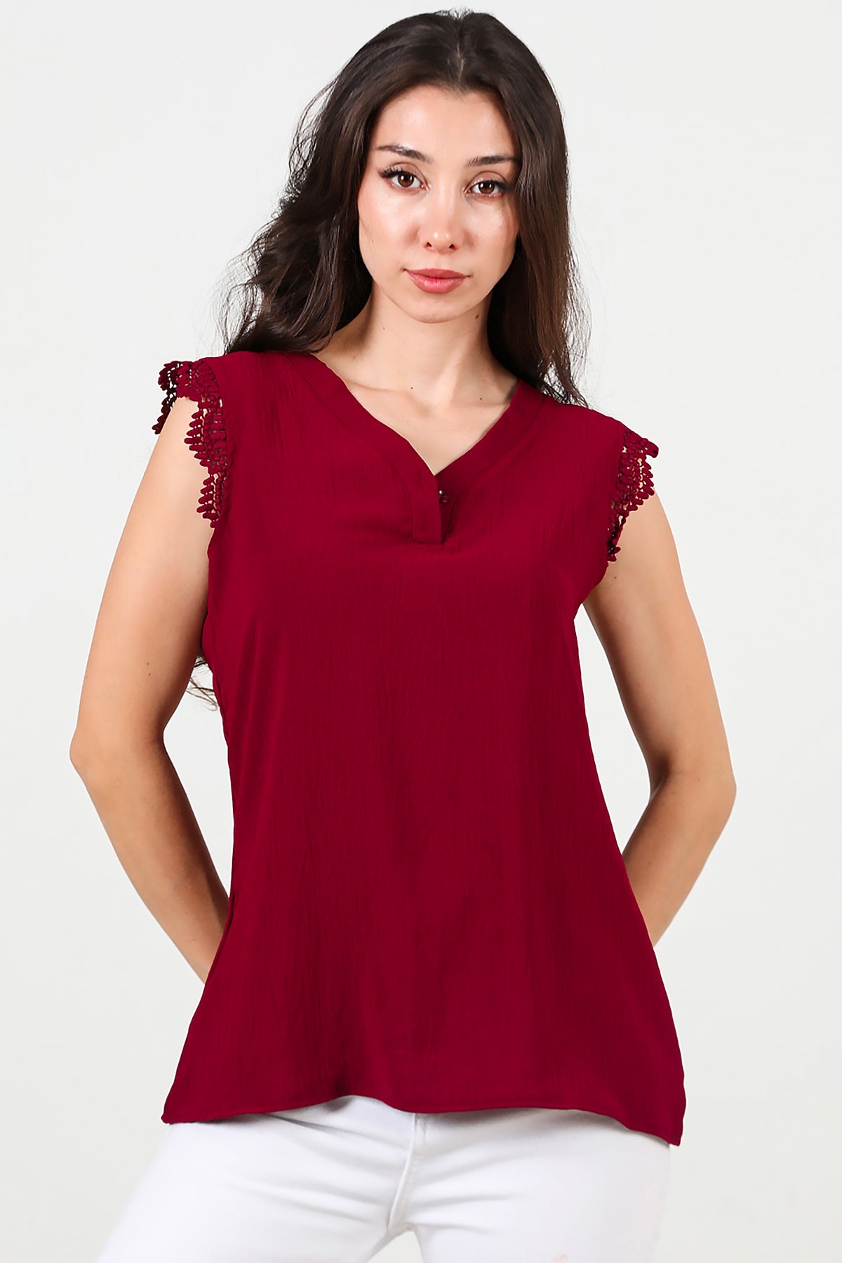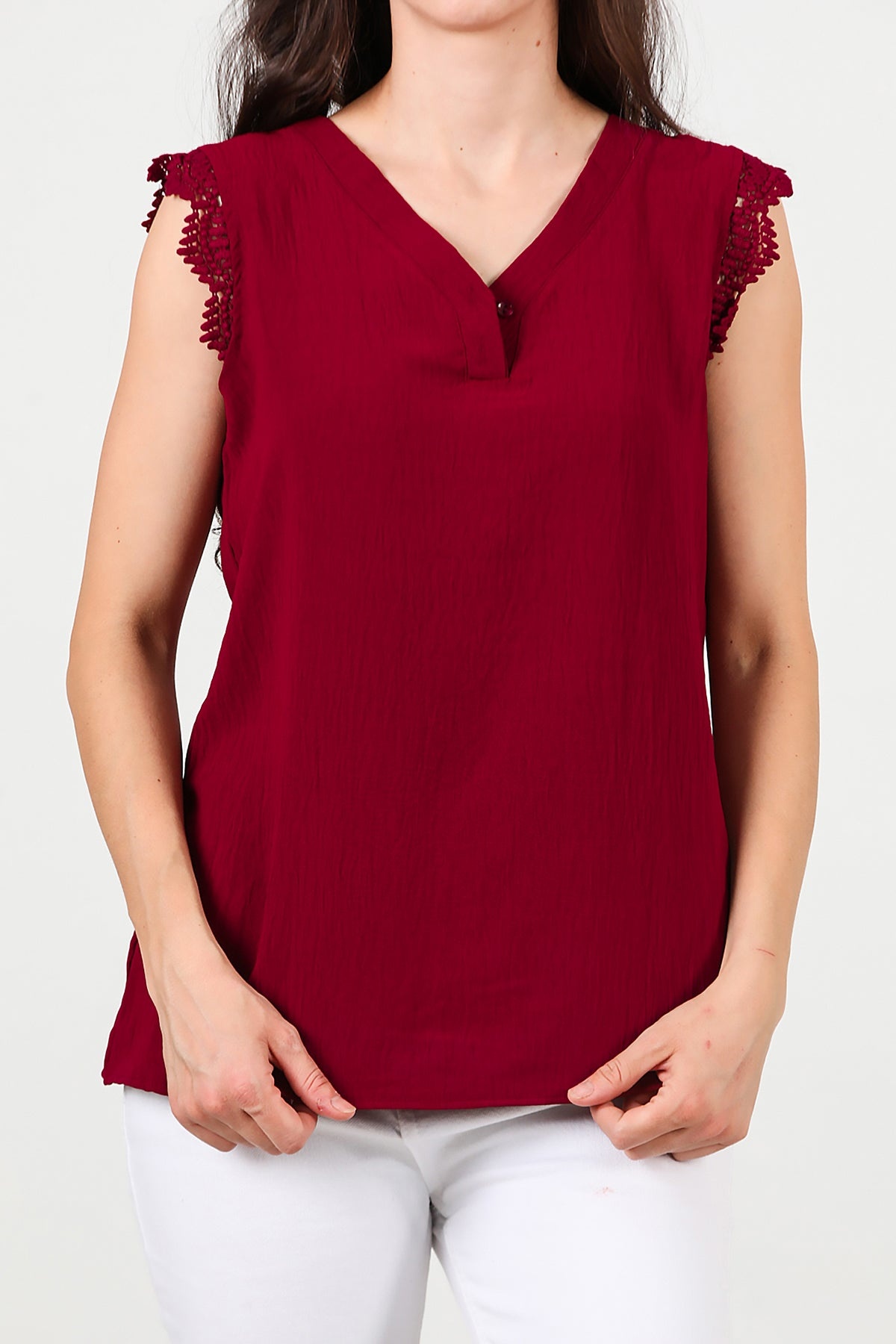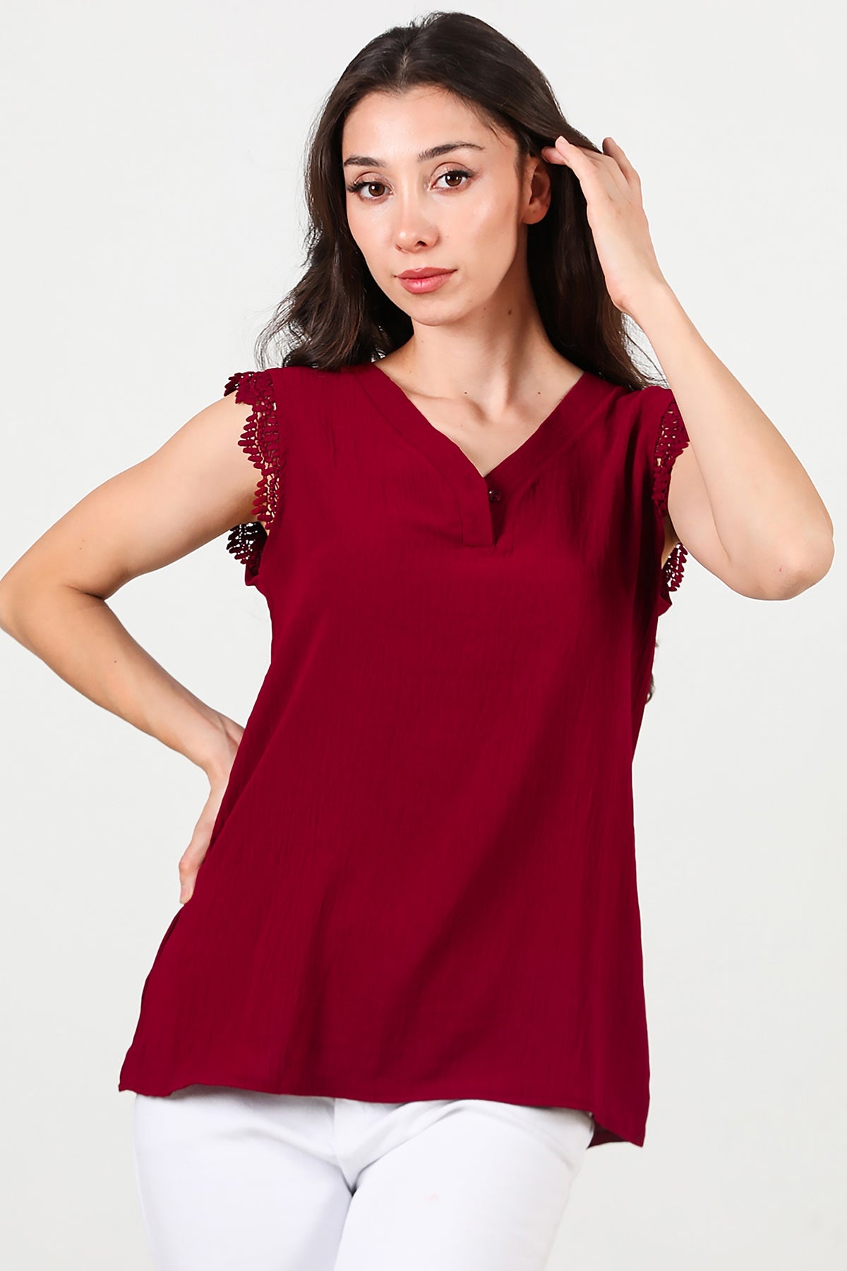 Kadın Kol Dantel Yaka Düğmeli Bluz Bordo