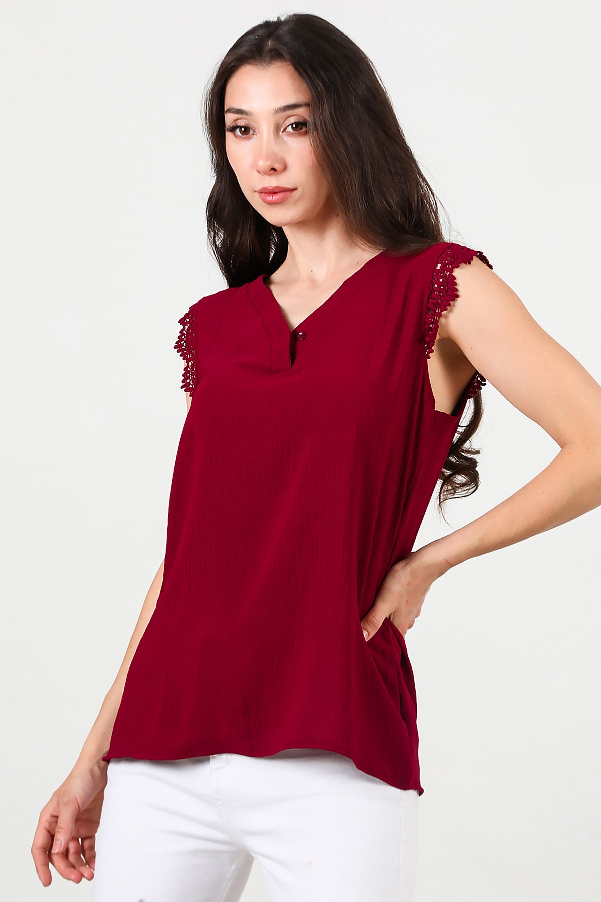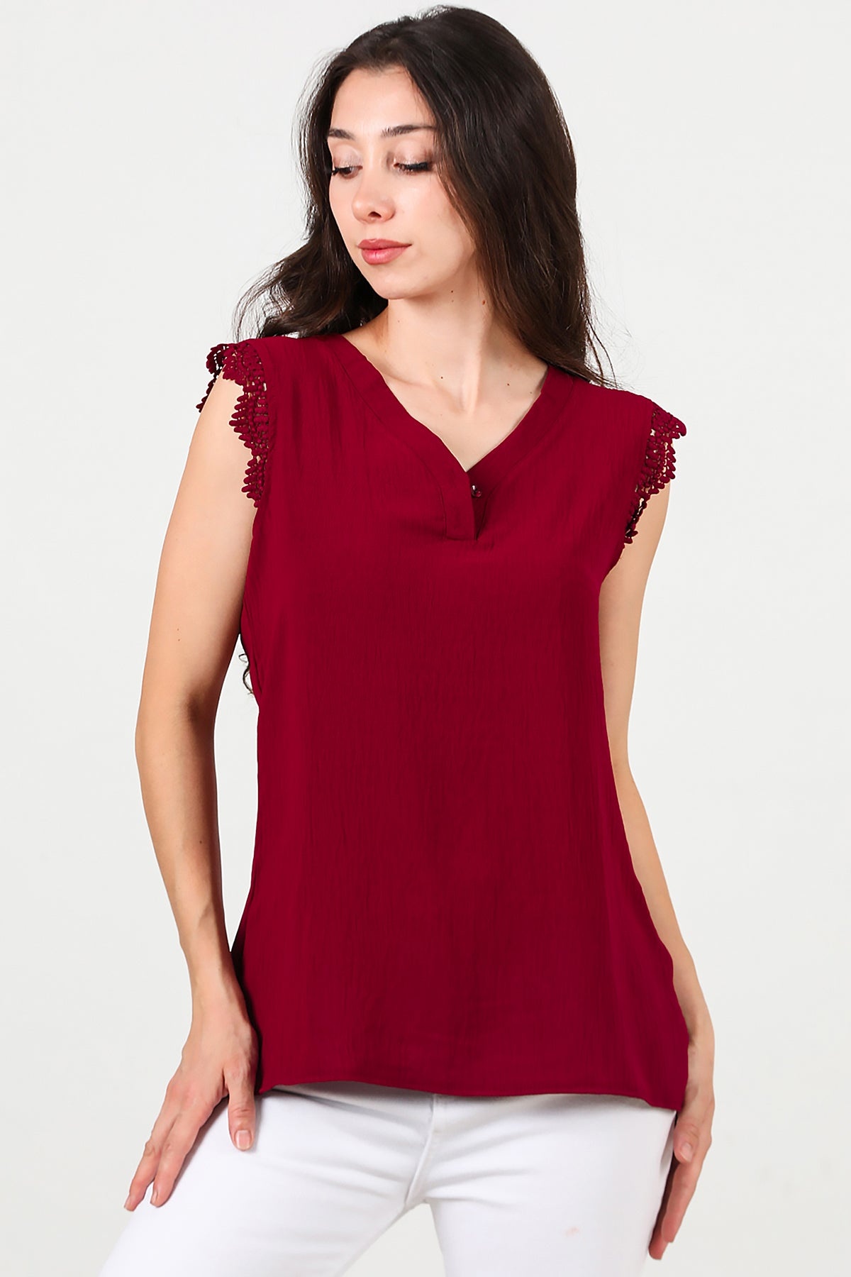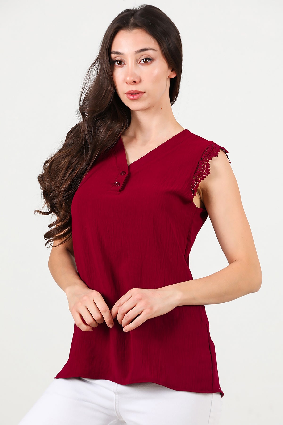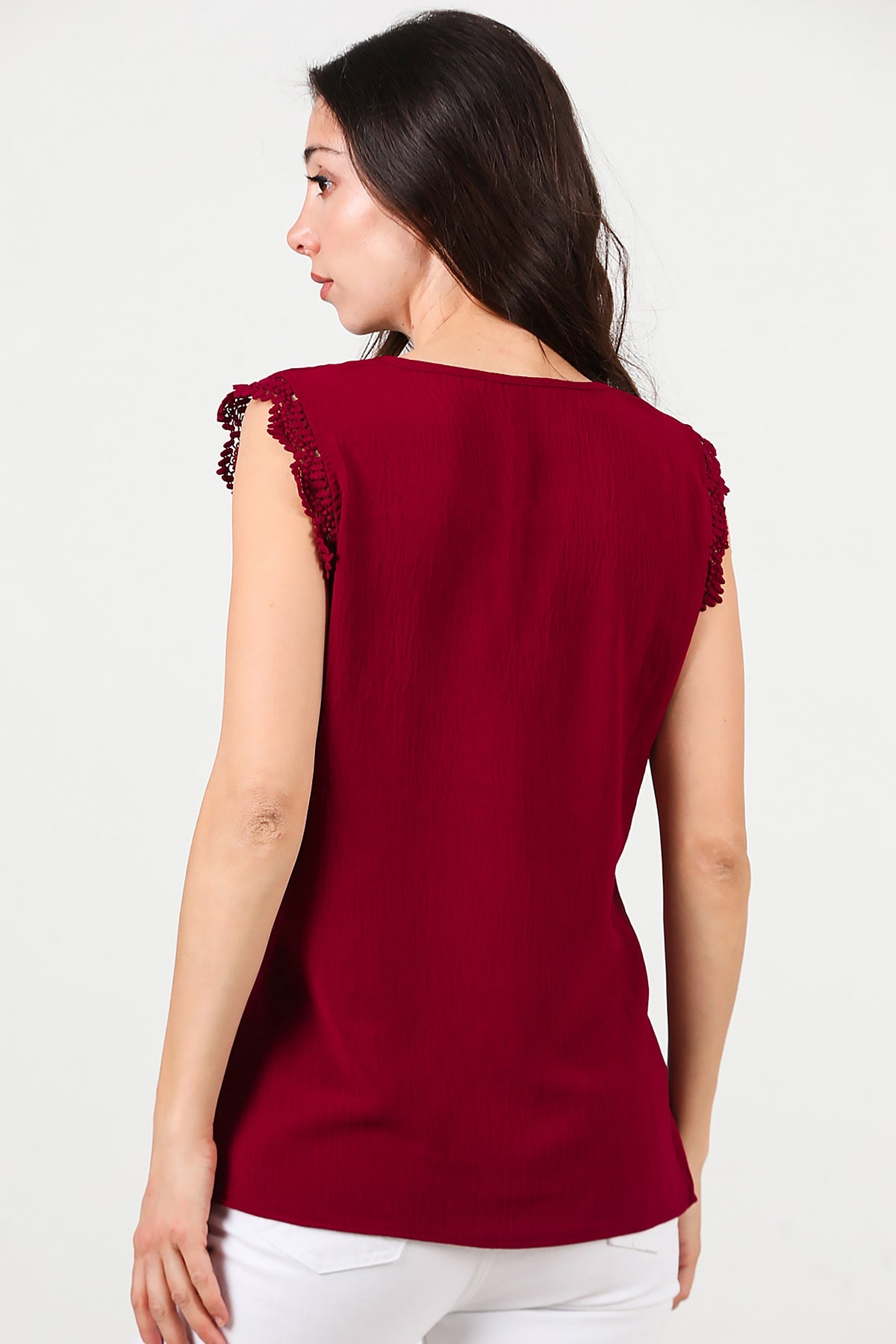 Kadın Kol Dantel Yaka Düğmeli Bluz Bordo
