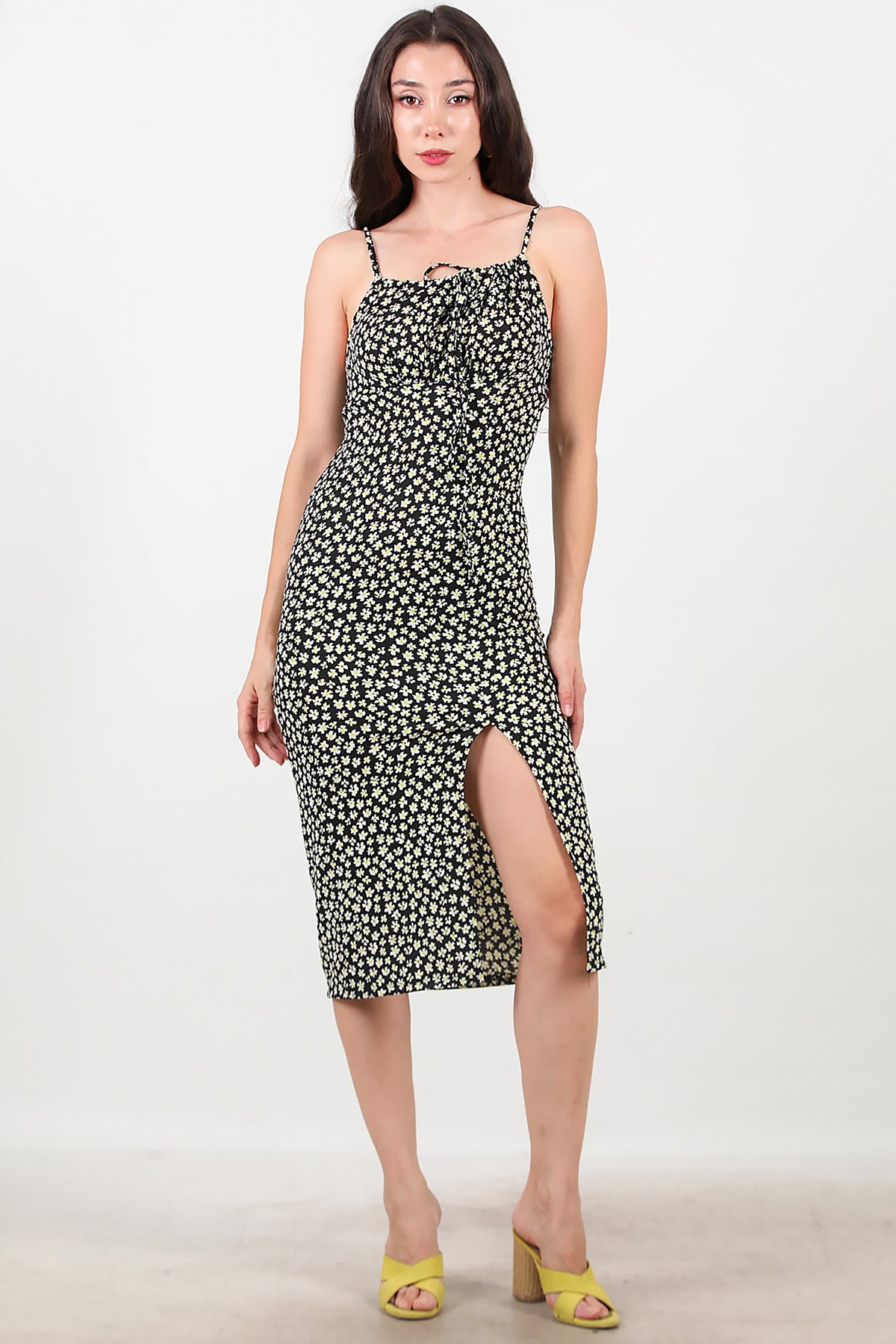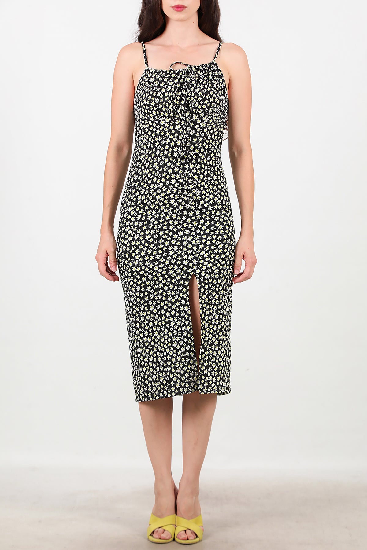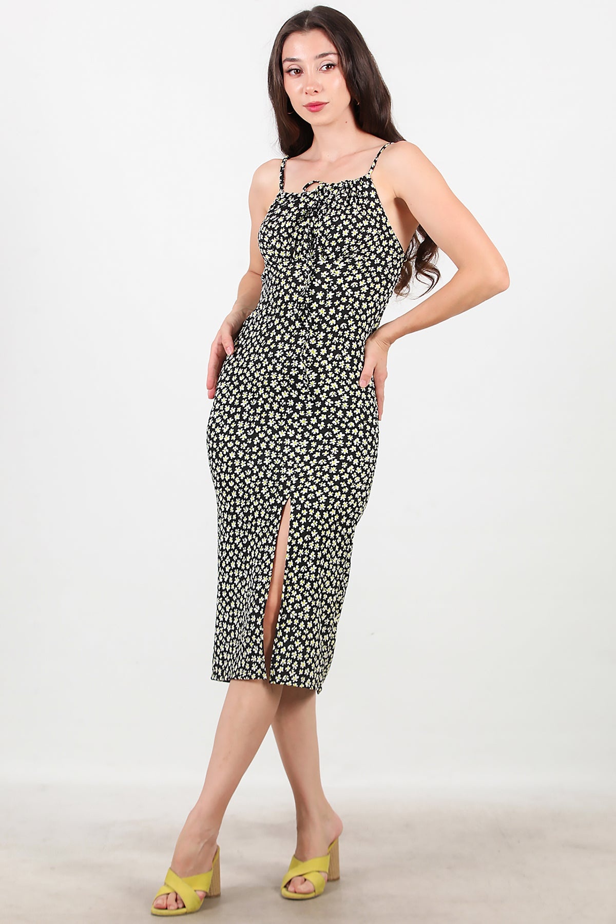 Kadın Desenli İp Askılı Yırtmaçlı Elbise Siyah