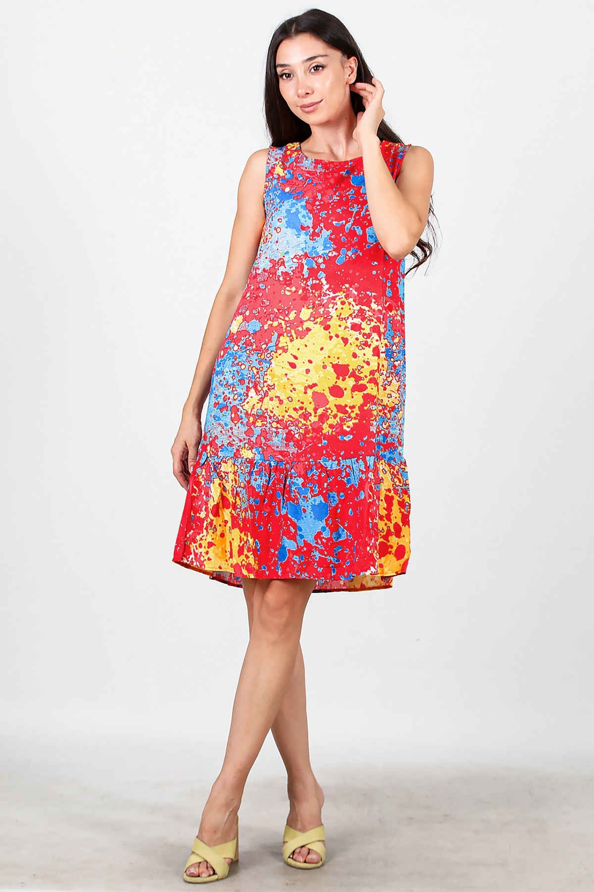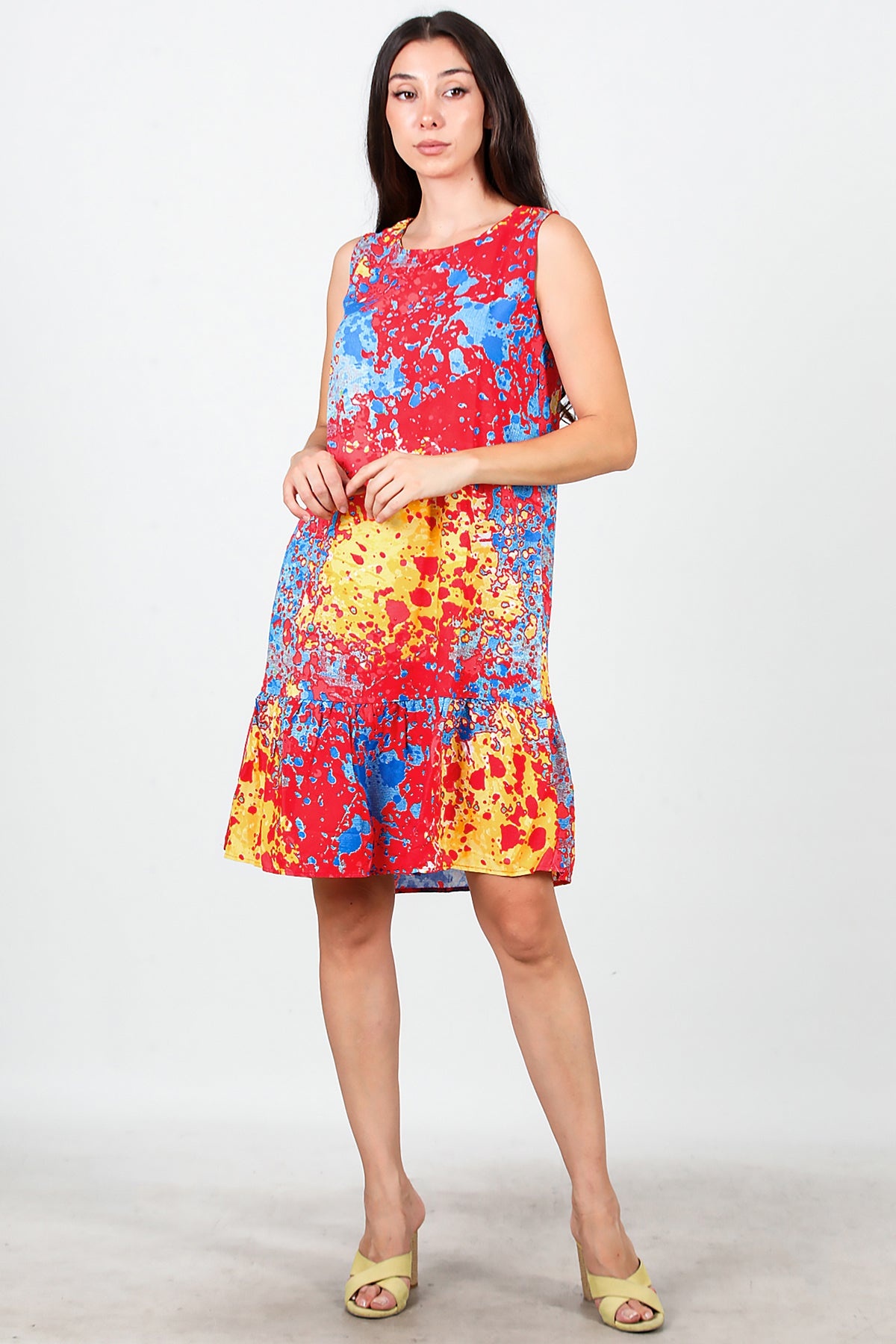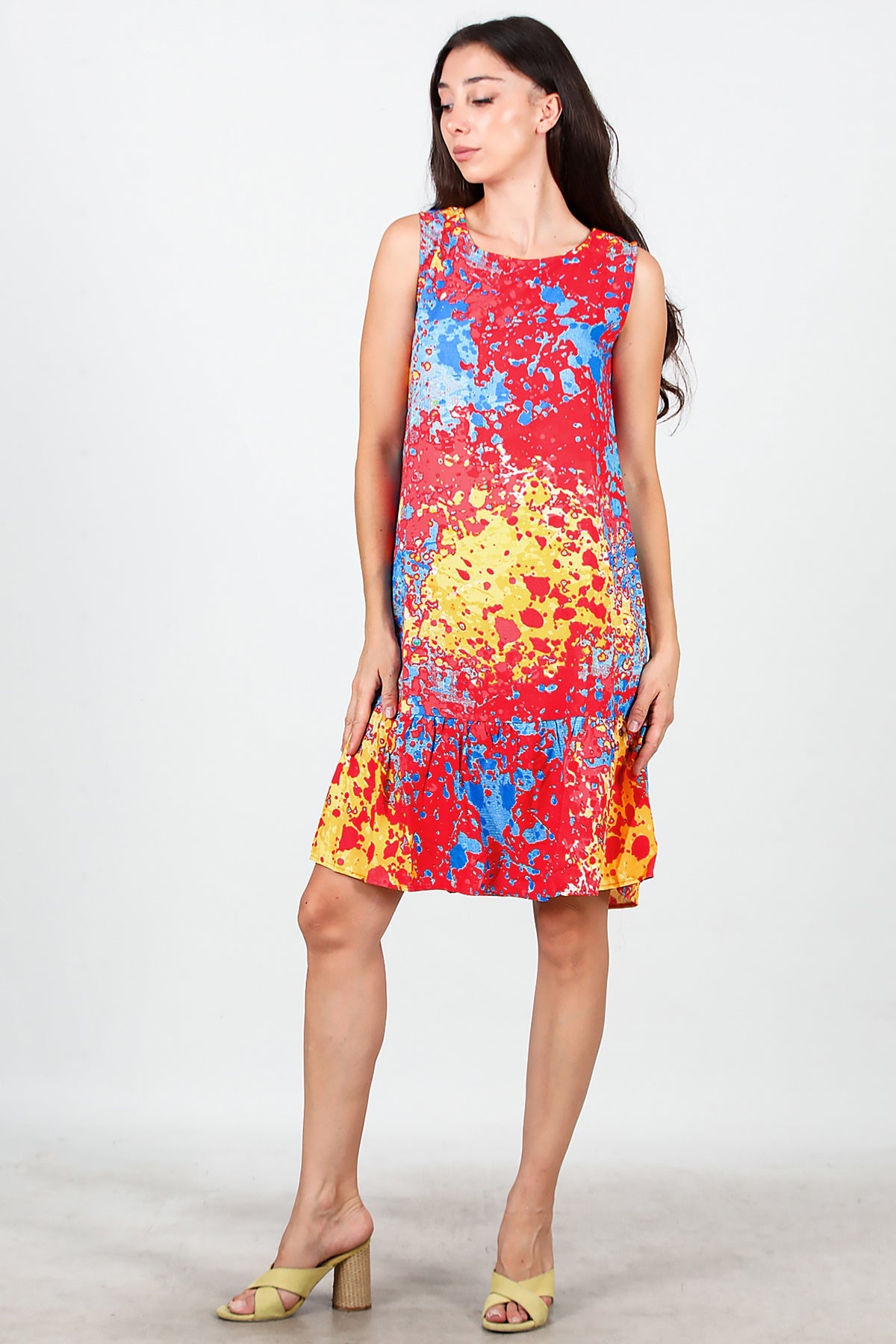Kadın Desenli Viskon Kolsuz Elbise Kırmızı
