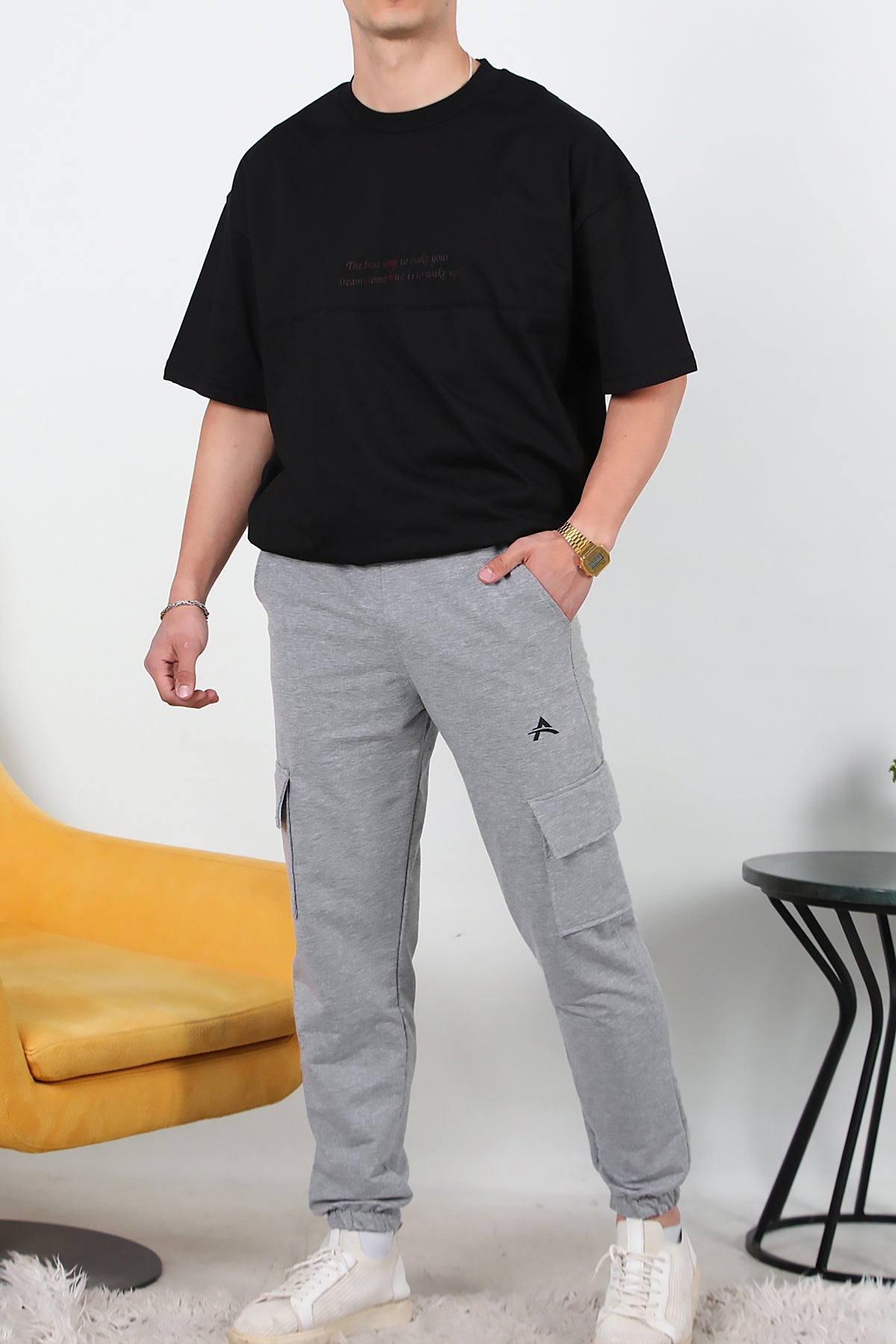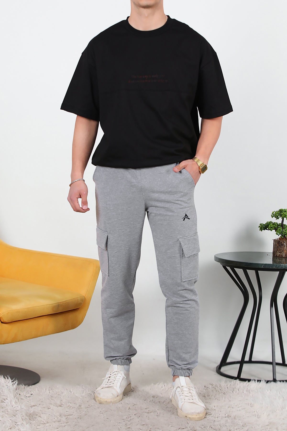 Erkek İki İplik Kargo Cep Paça Lastikli Eşofman Koyu Gri