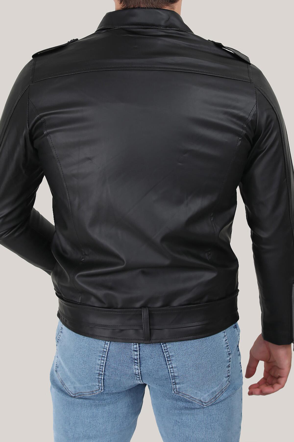 Erkek Gömlek Yaka Deri Mont Siyah