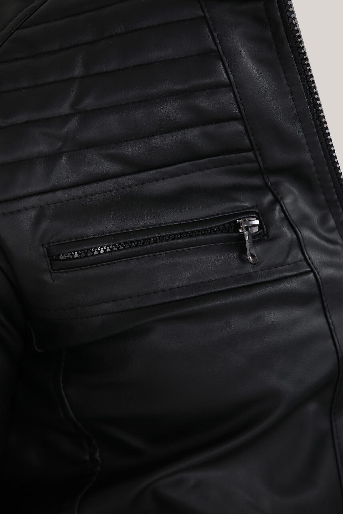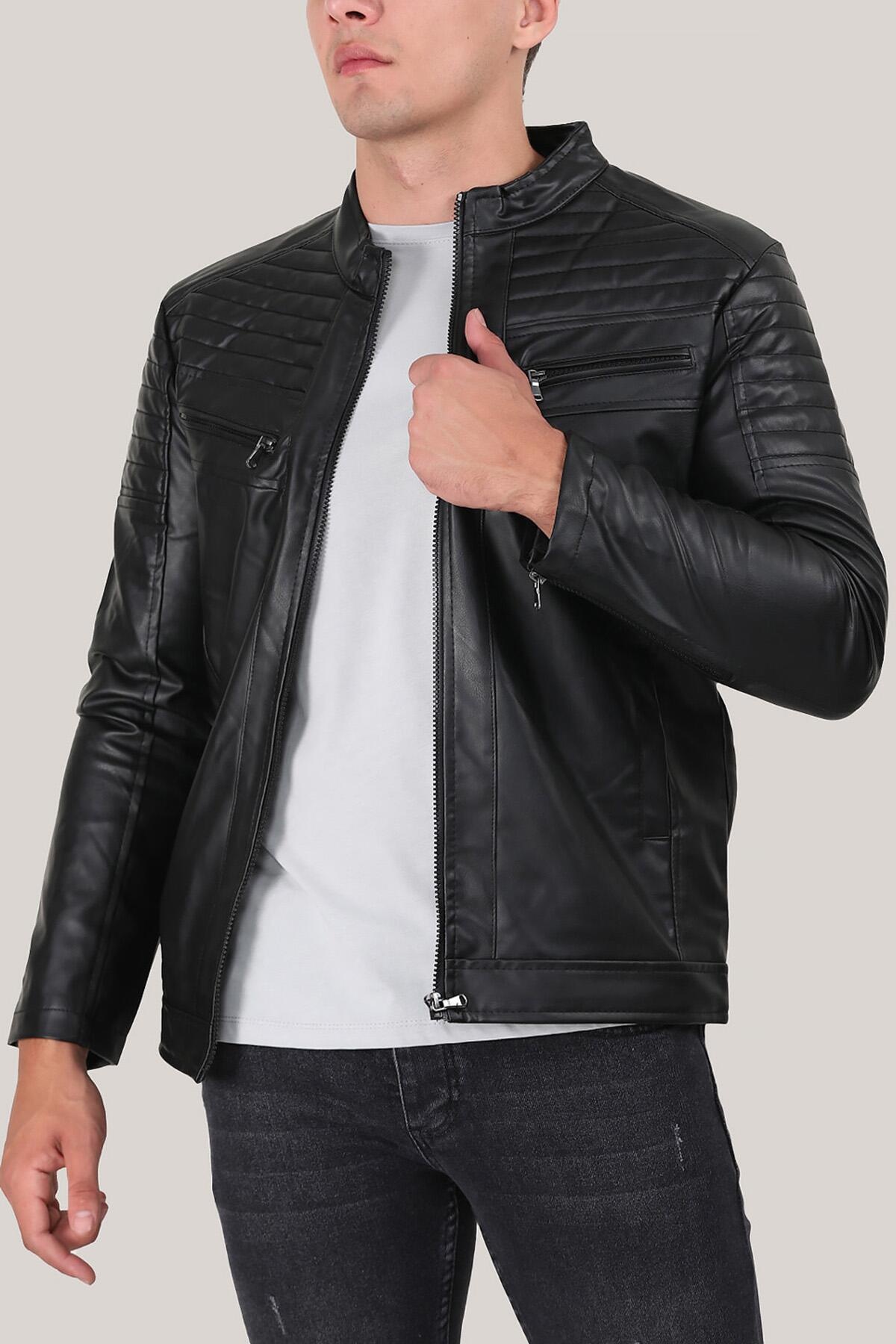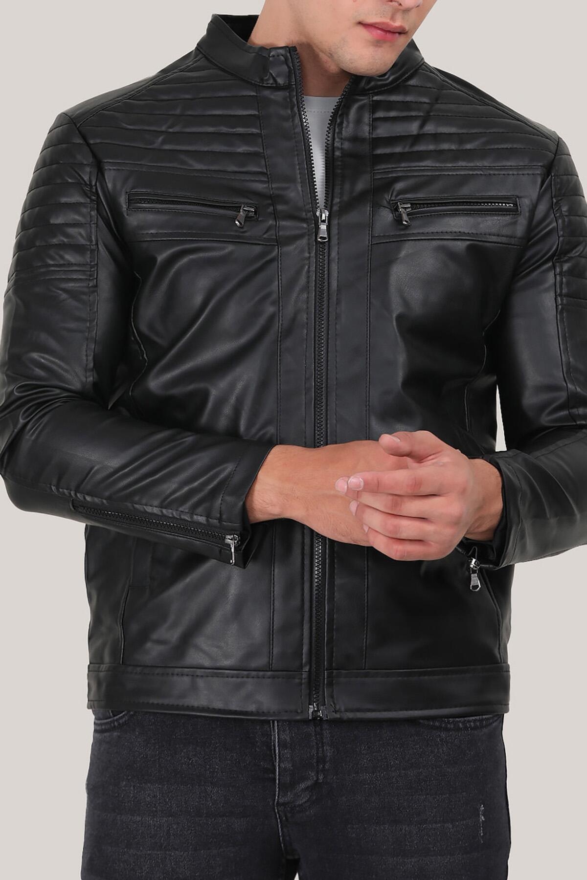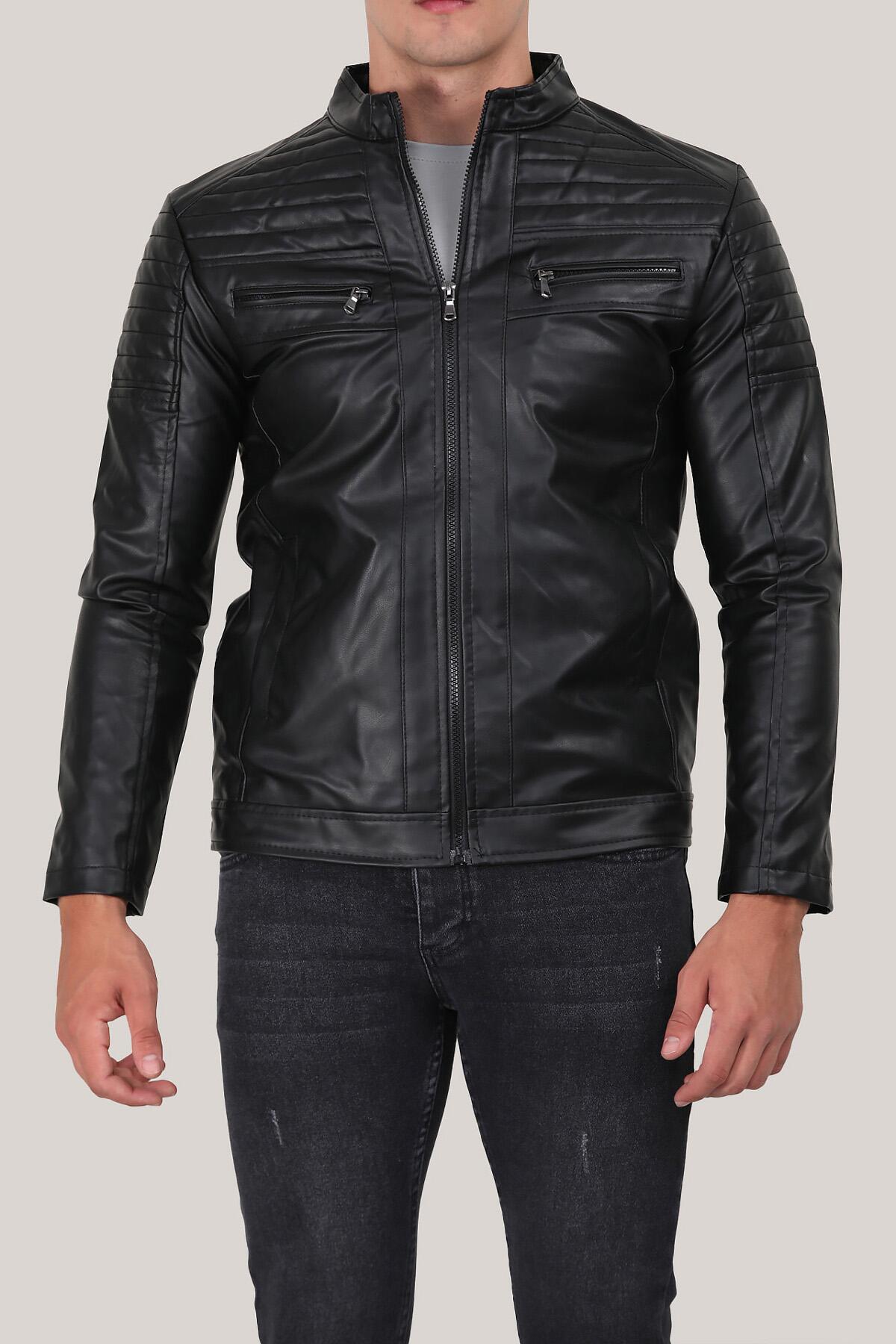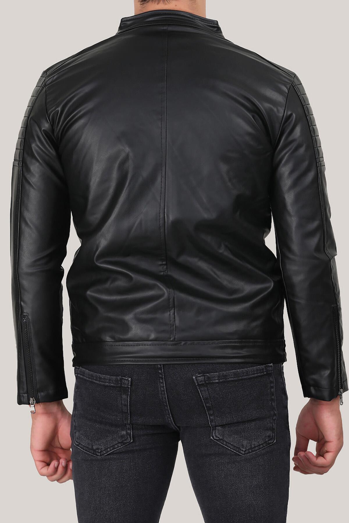 Erkek Hakim Yaka Deri Mont Siyah