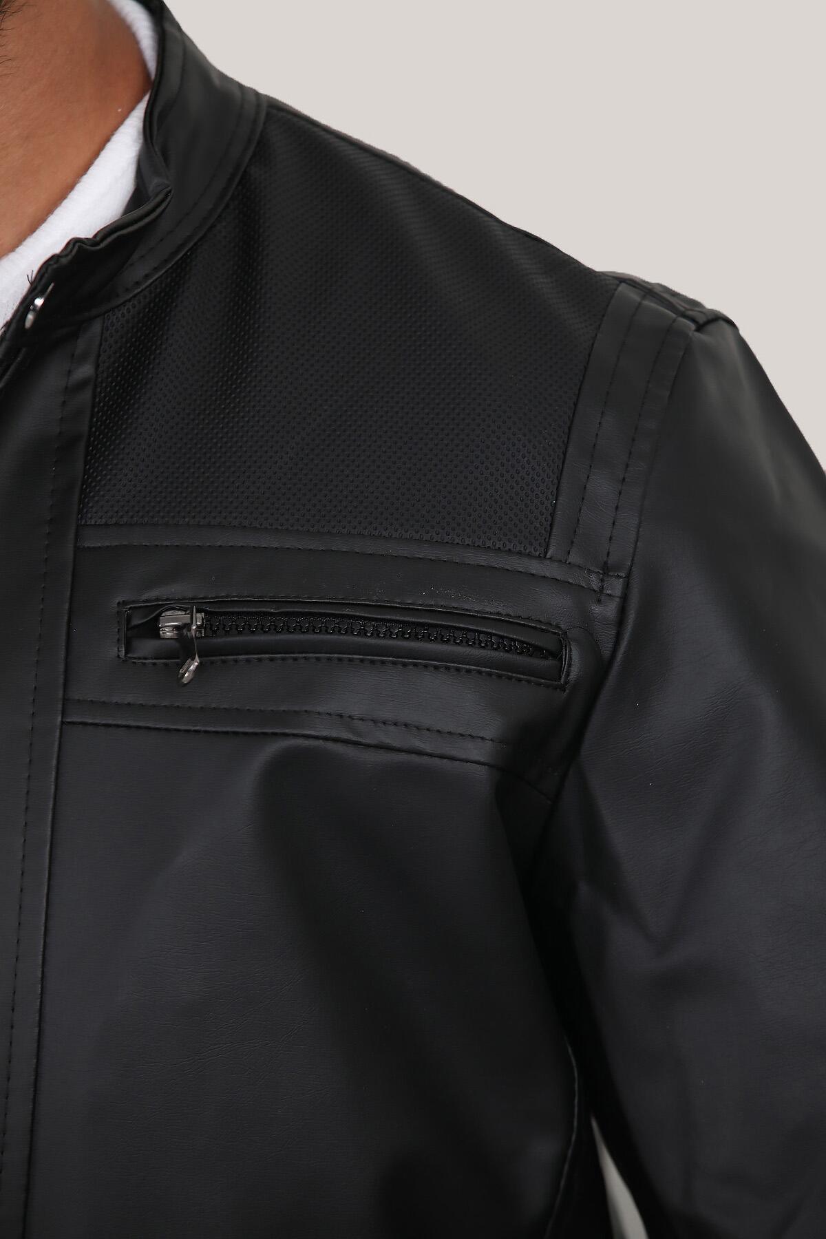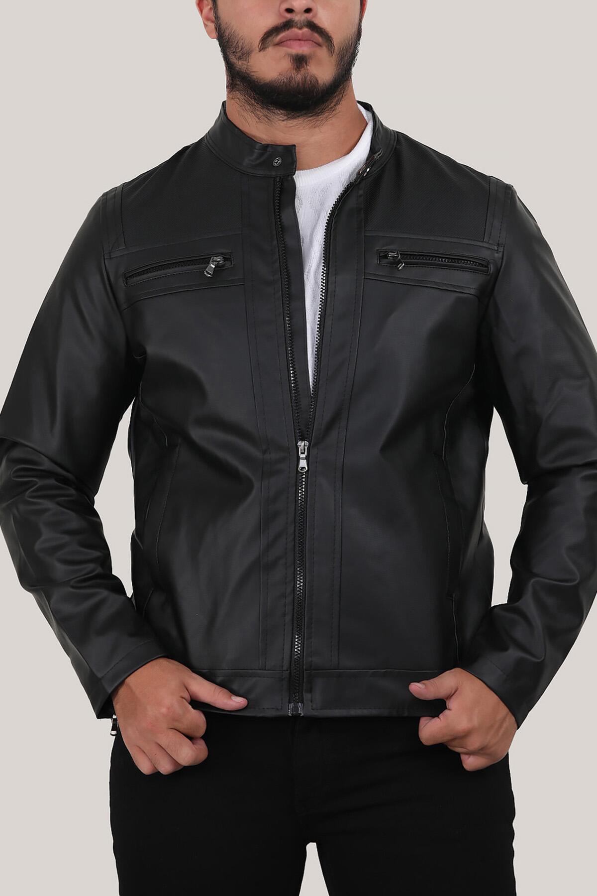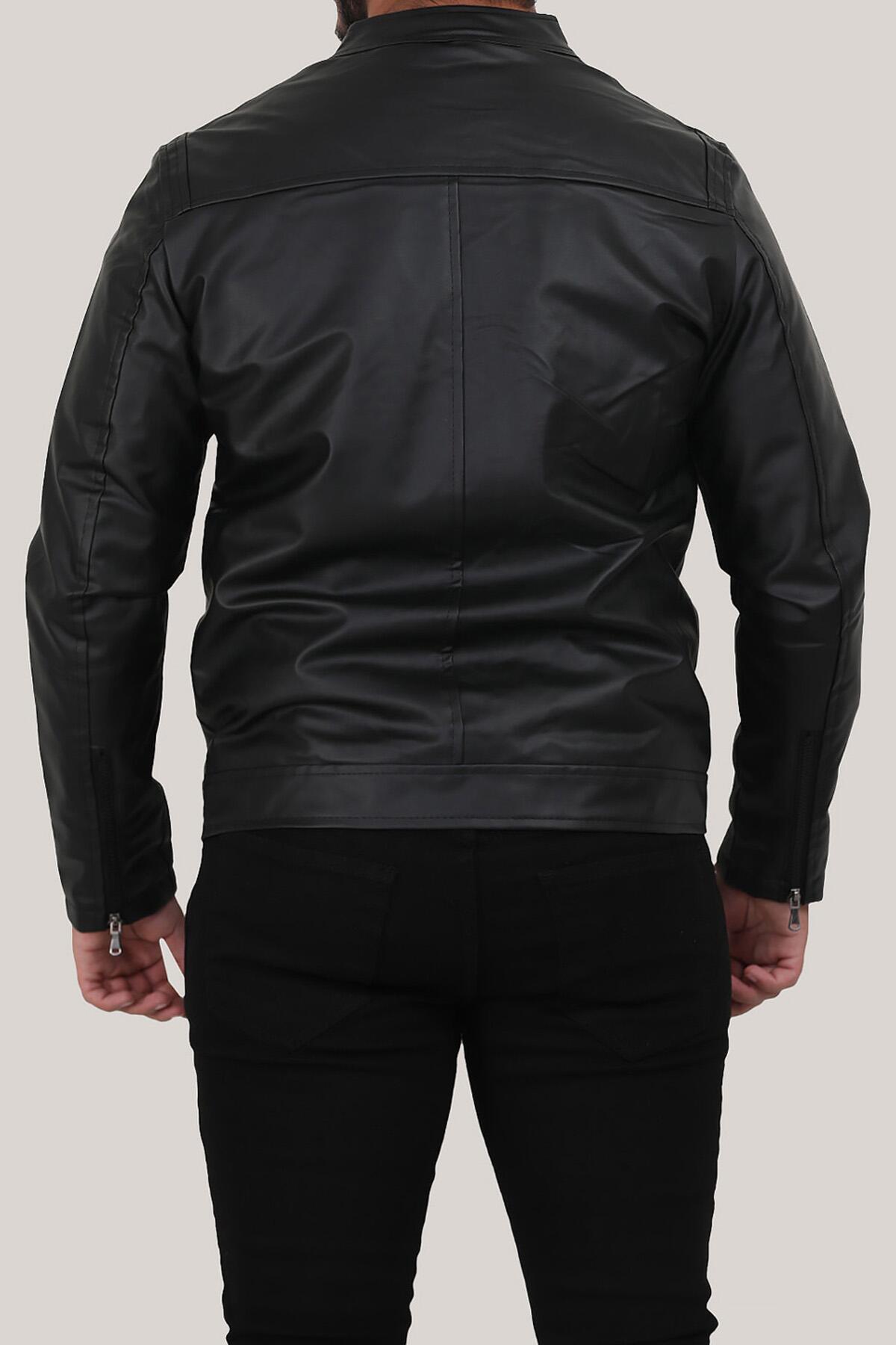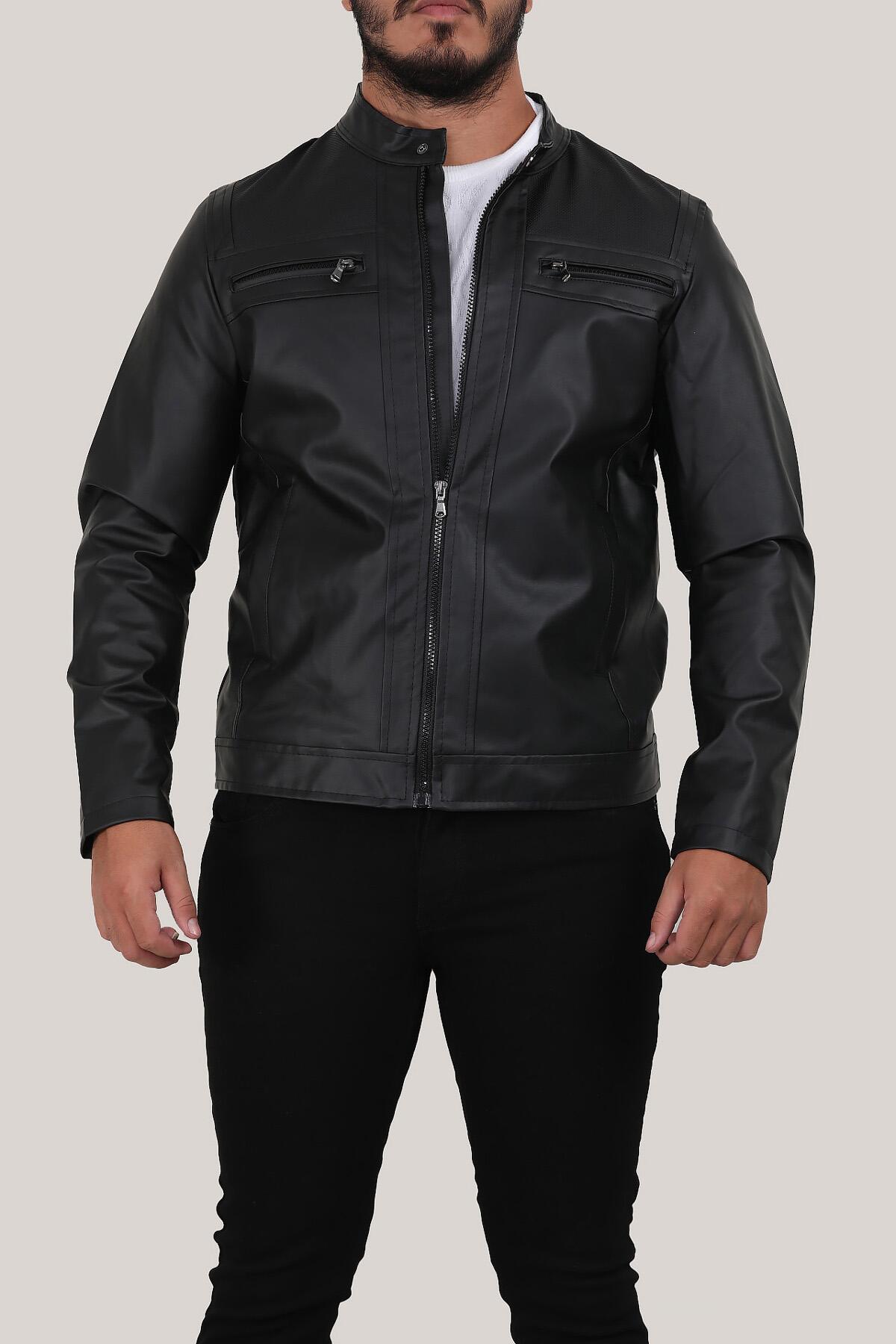 Erkek Hakim Yaka Deri Mont Siyah