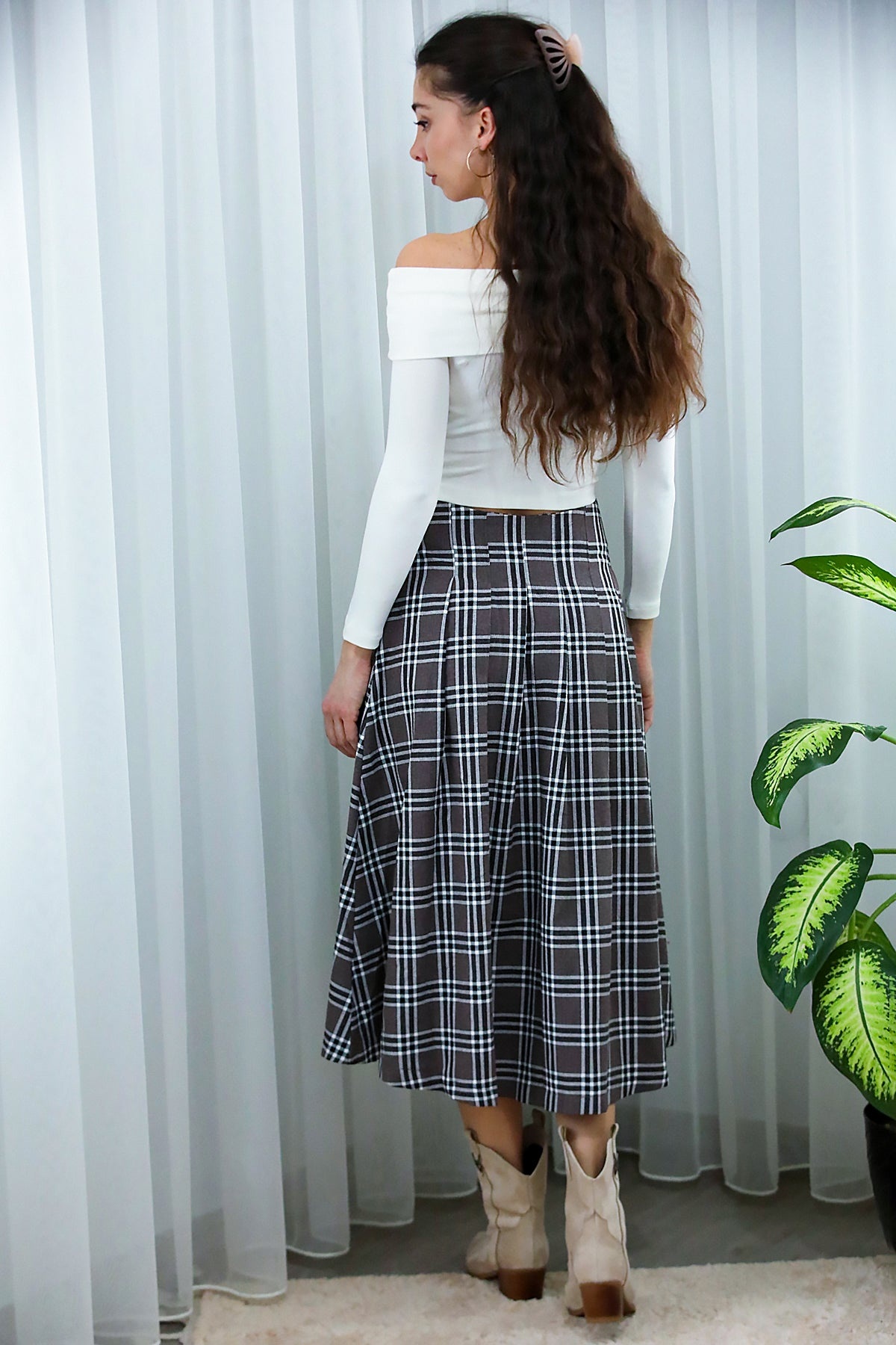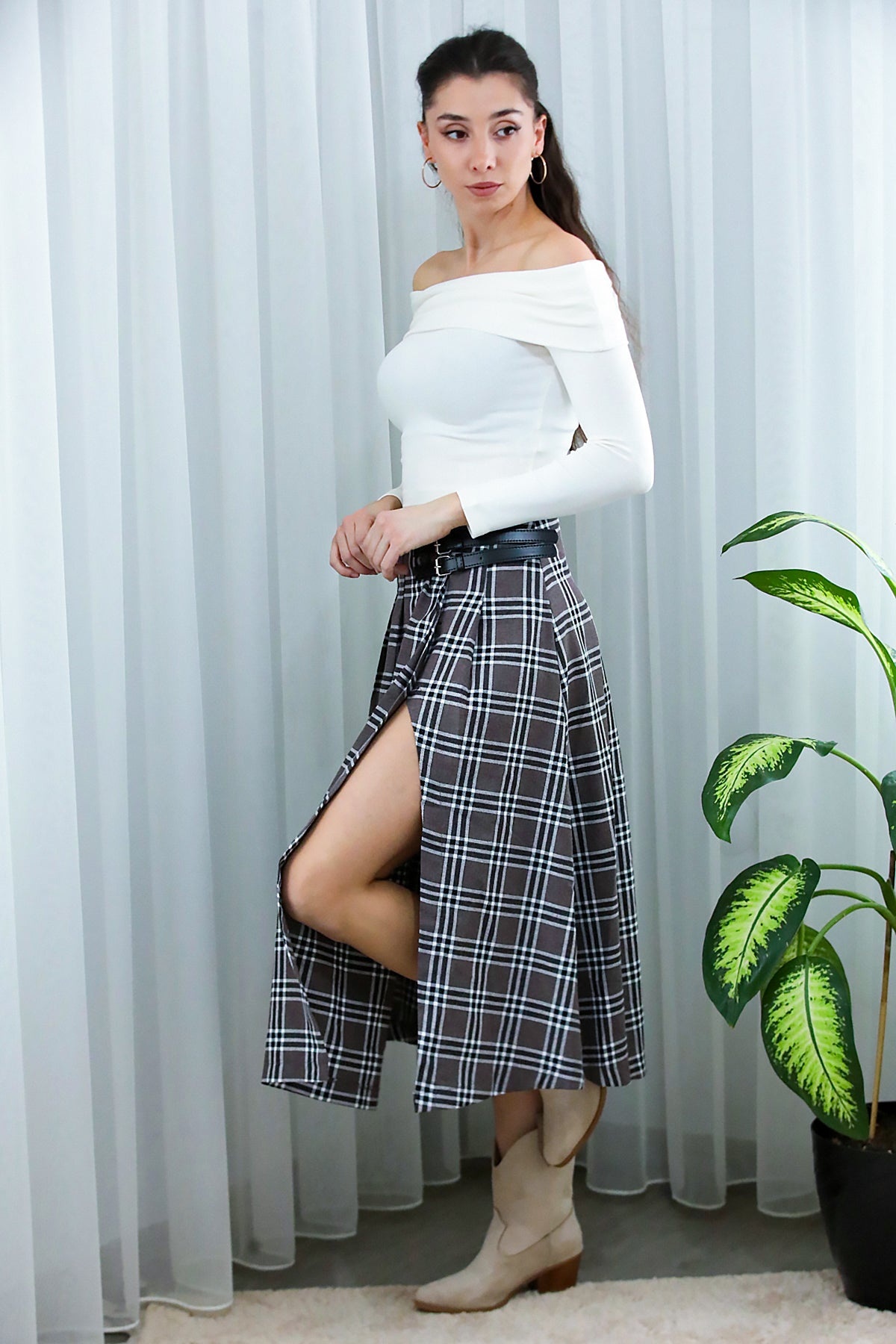 Kadın Kemer Detaylı Yırtmaçlı Ekose Etek Kahverengi