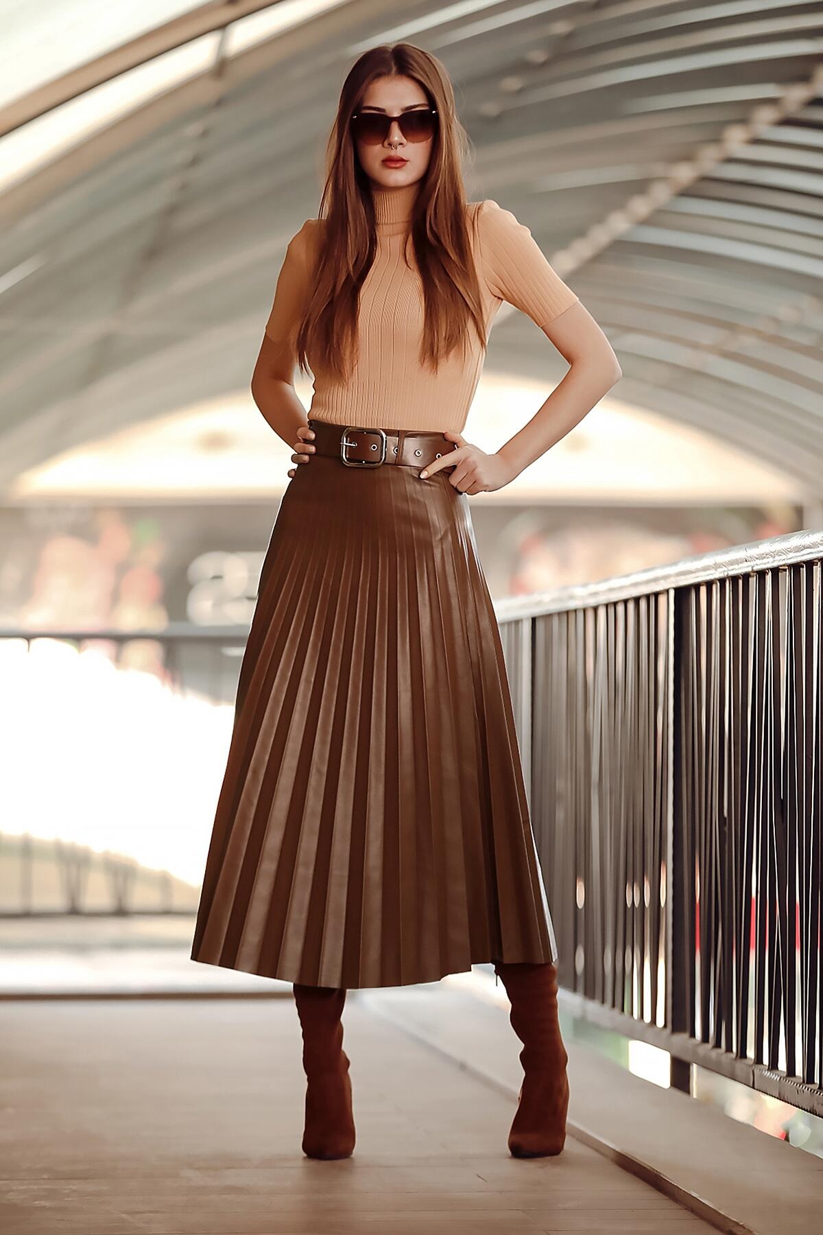 Kadın Midi Boy Kemerli Piliseli Deri Etek Taba