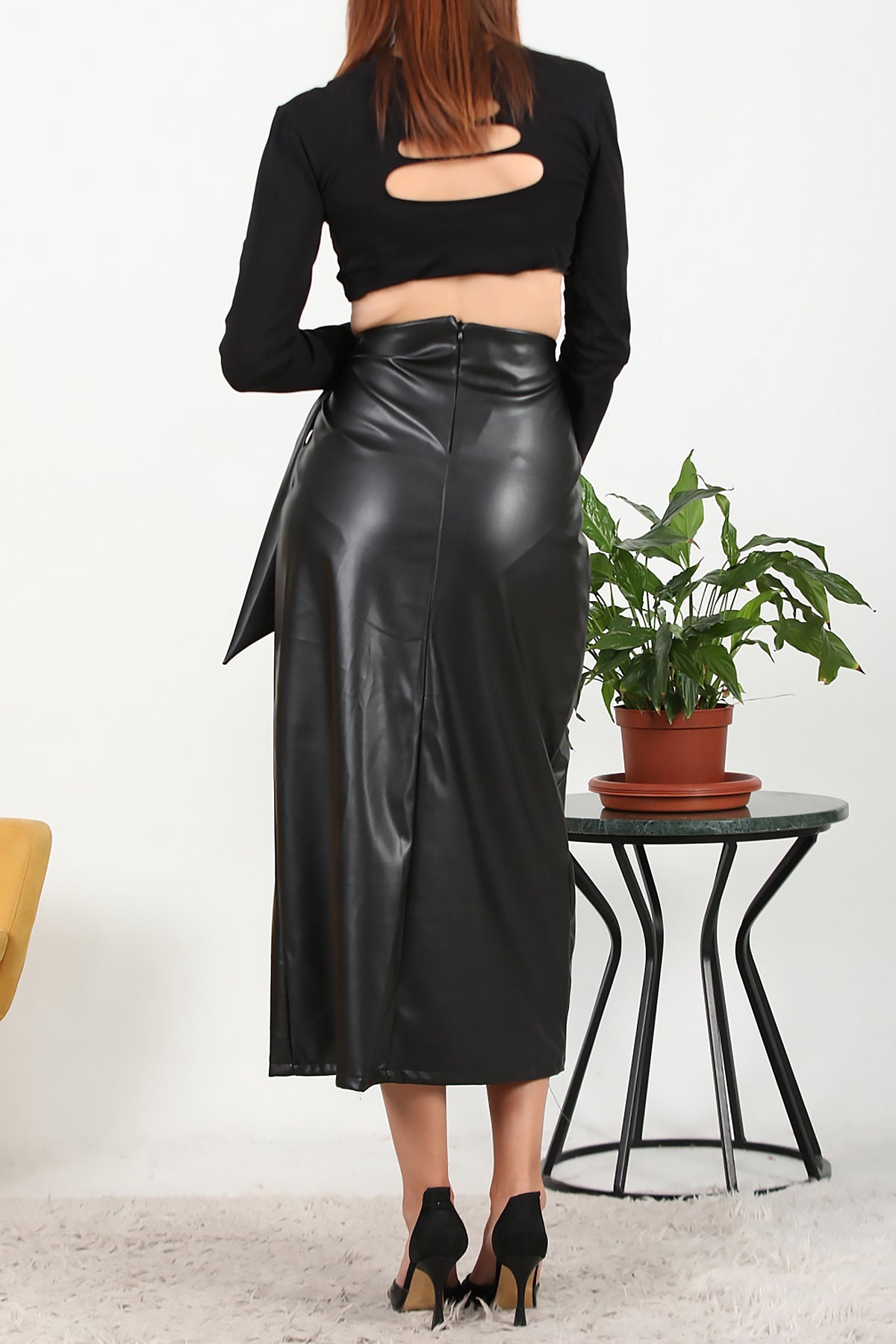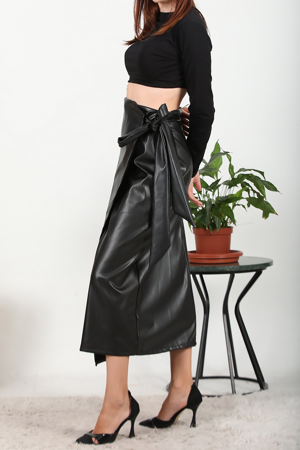 Kadın Yan Bağlamalı Deri Etek Siyah