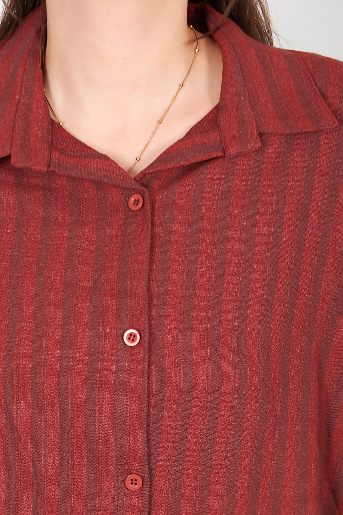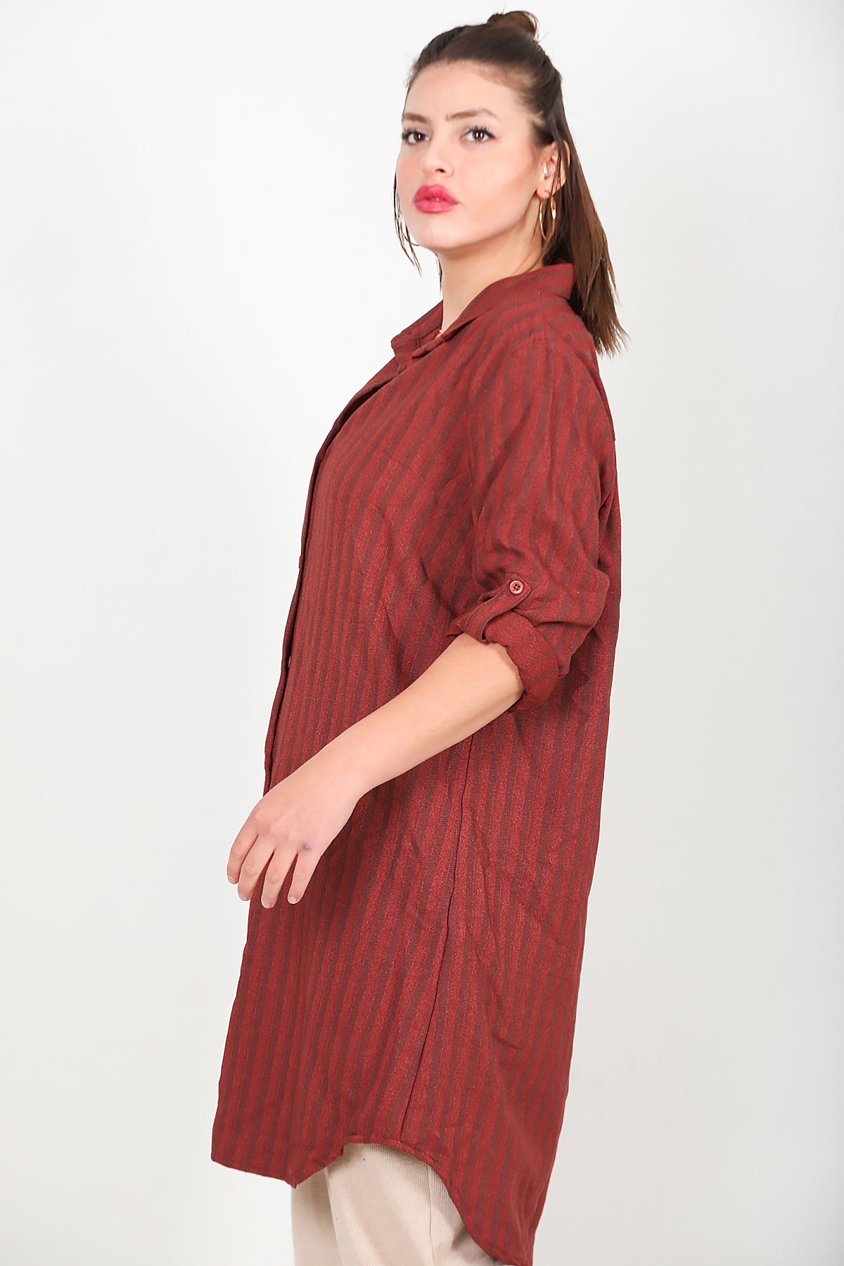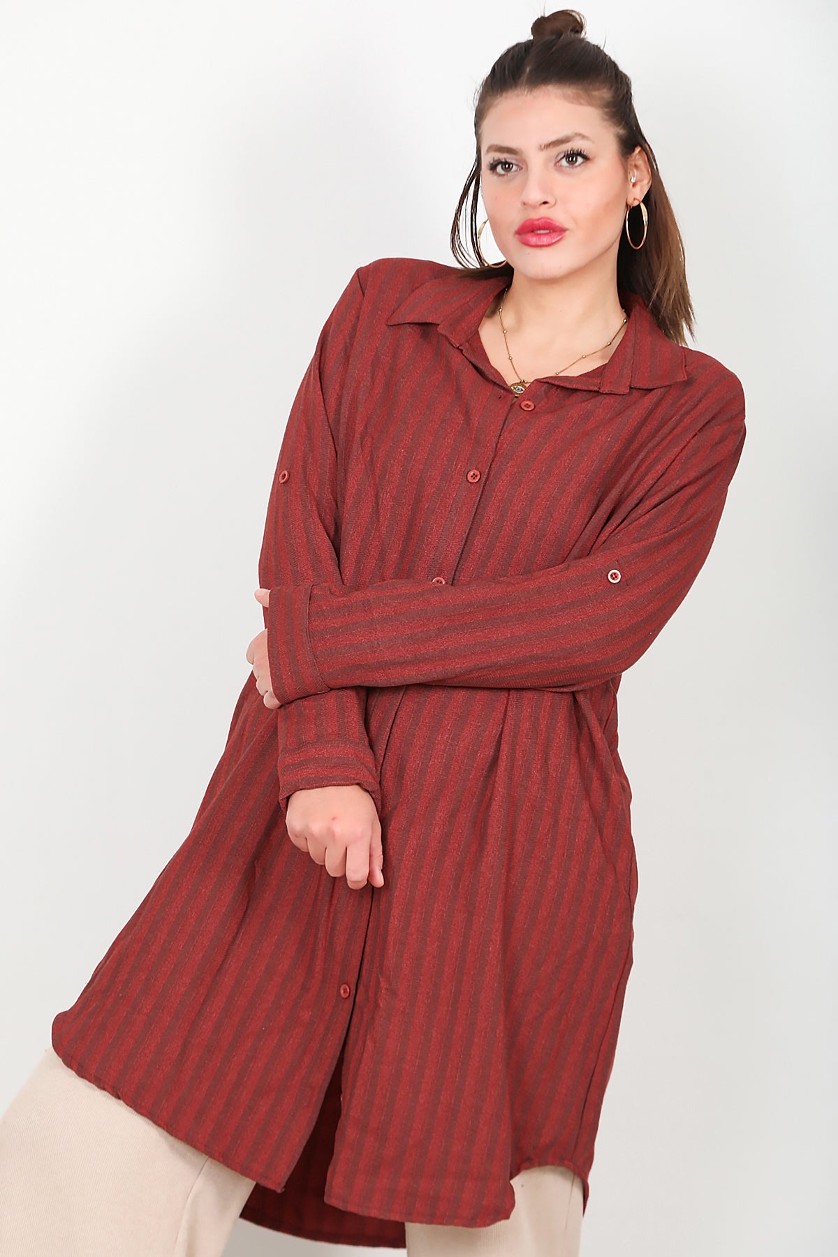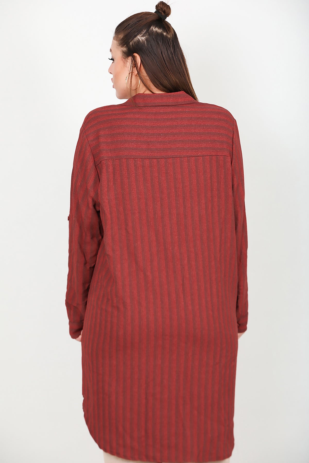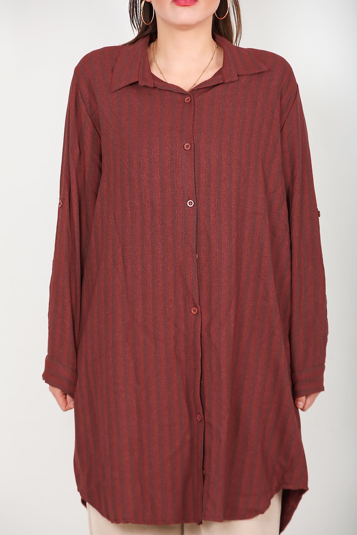 Büyük Beden Ön Düğmeli Kol Katlamalı Tunik Kiremit Kiremit