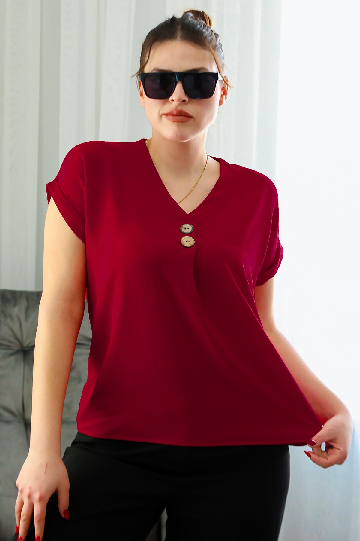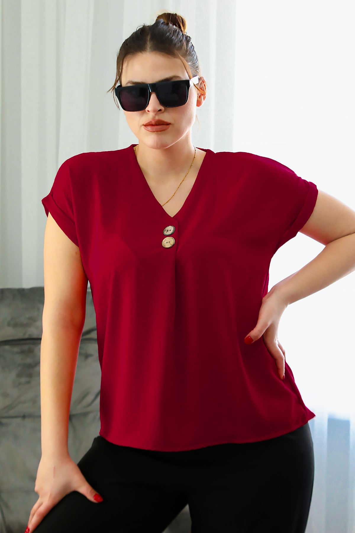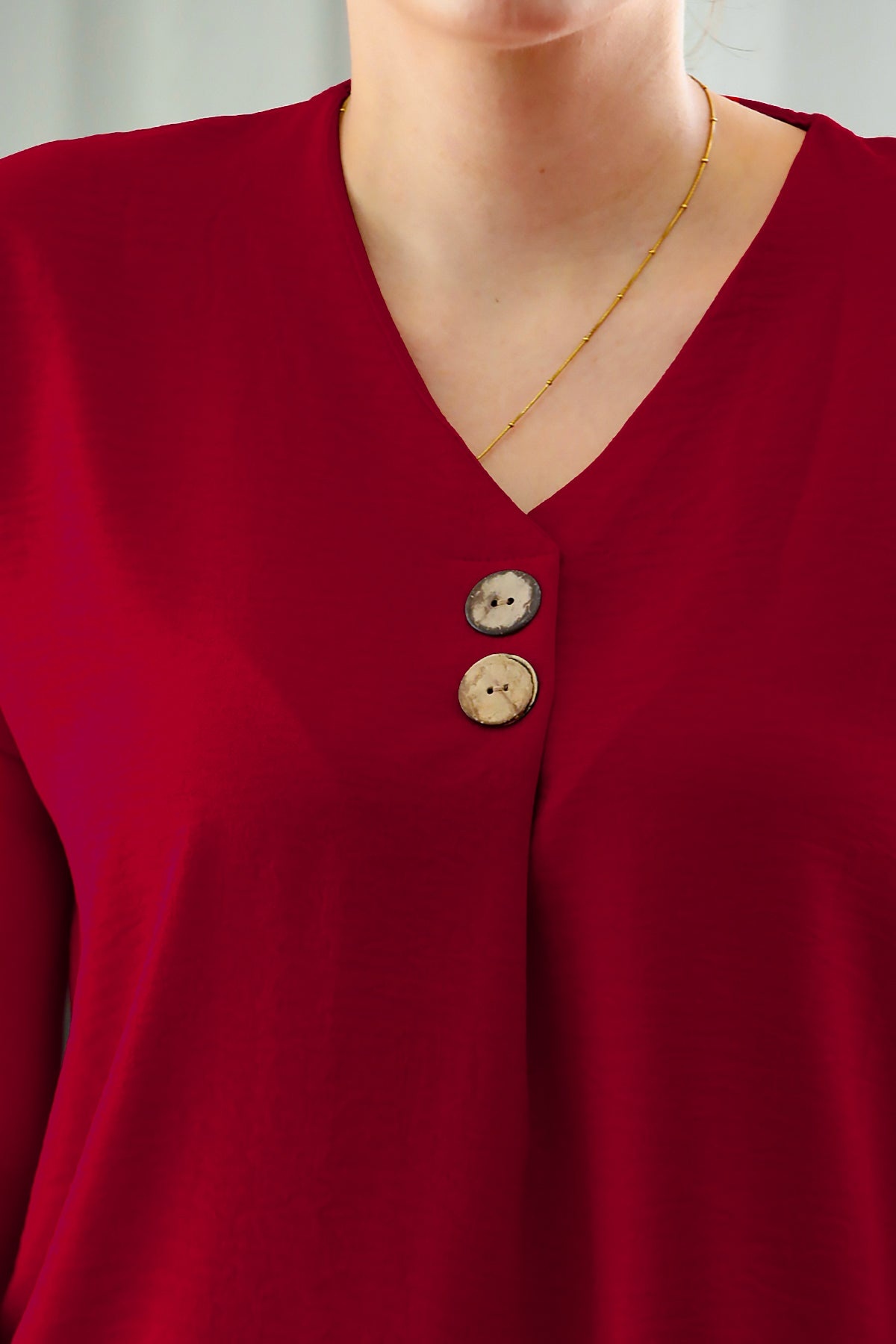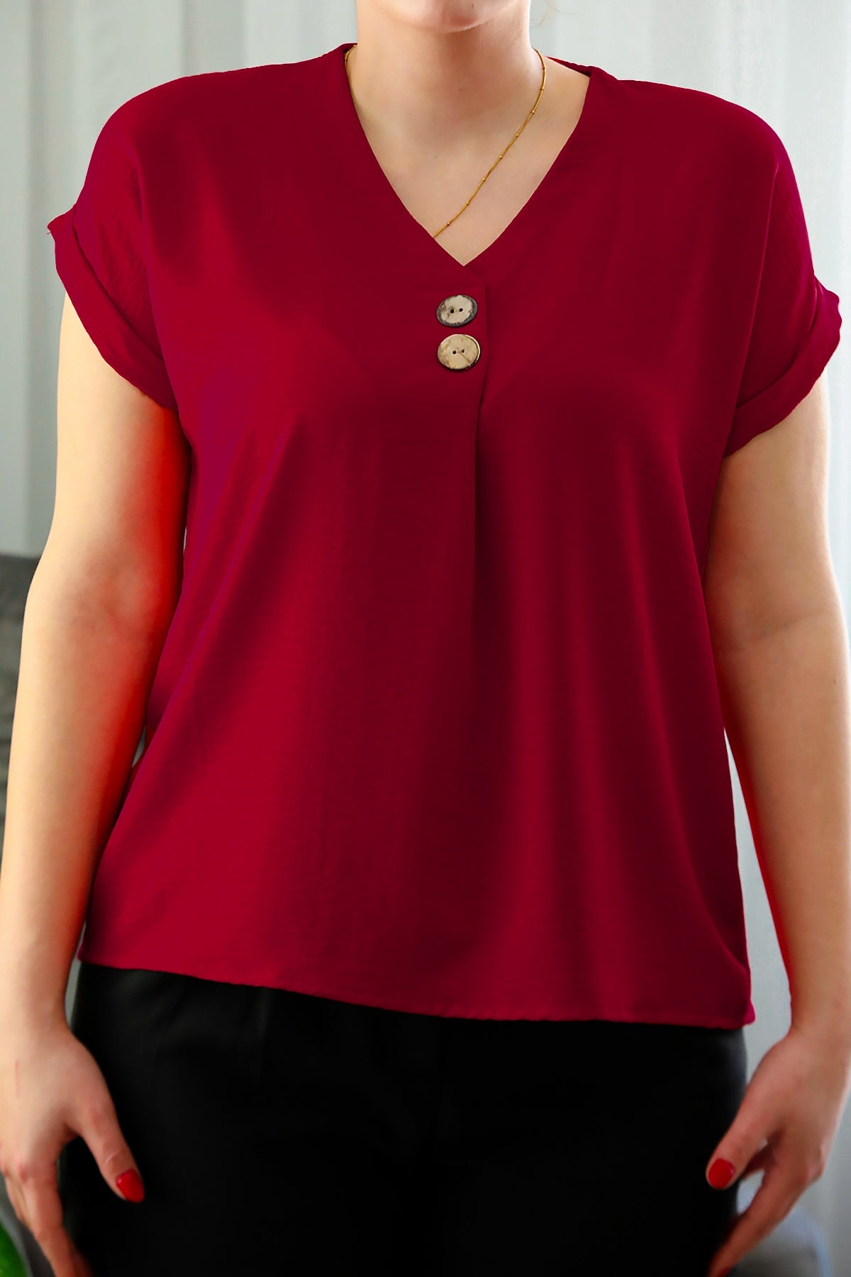 Büyük Beden V Yaka İki Düğmeli Bluz Kırmızı
