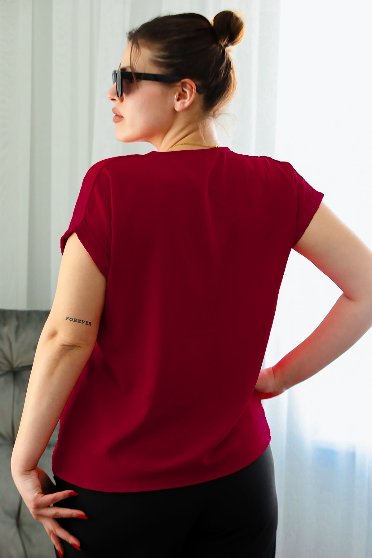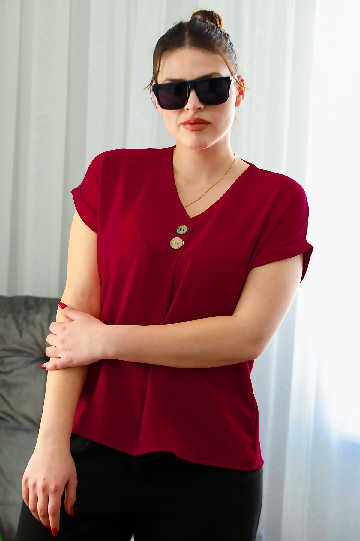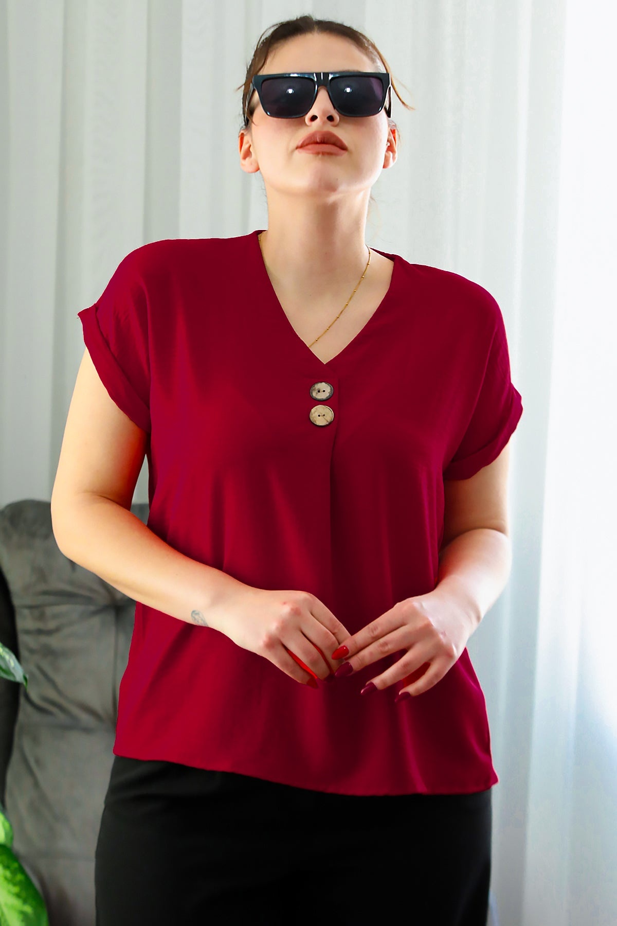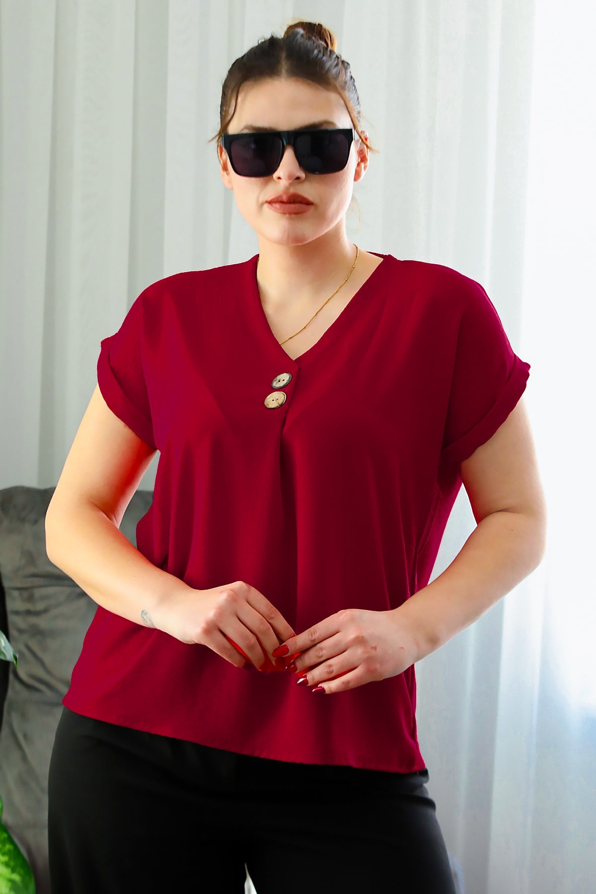 Büyük Beden V Yaka İki Düğmeli Bluz Kırmızı