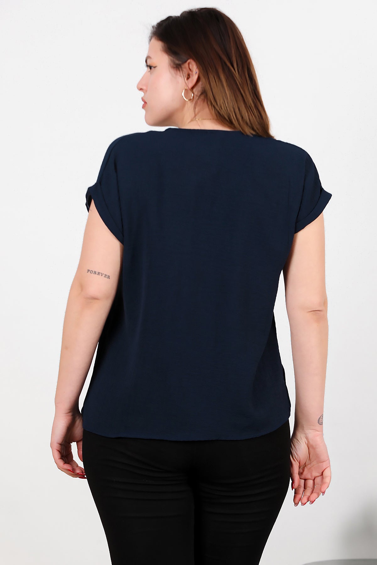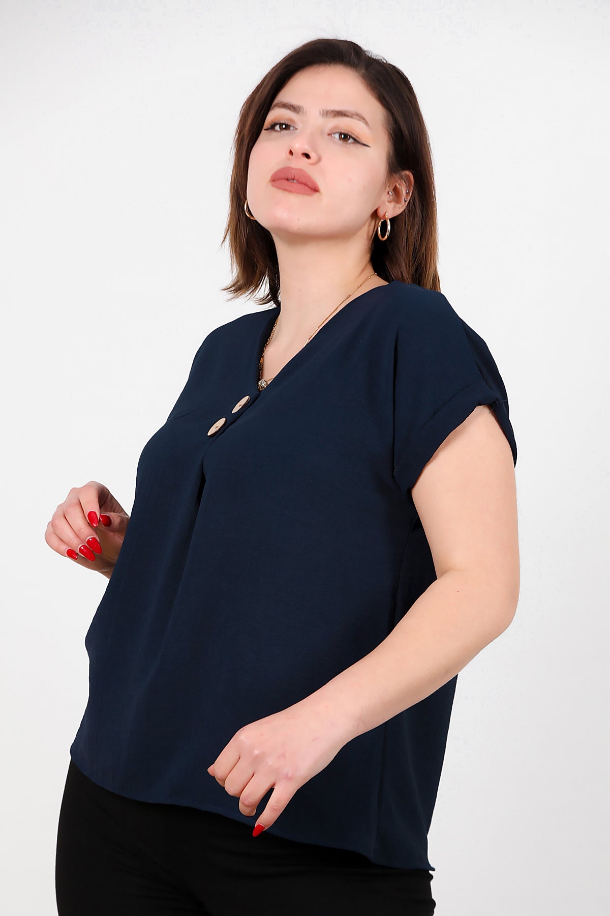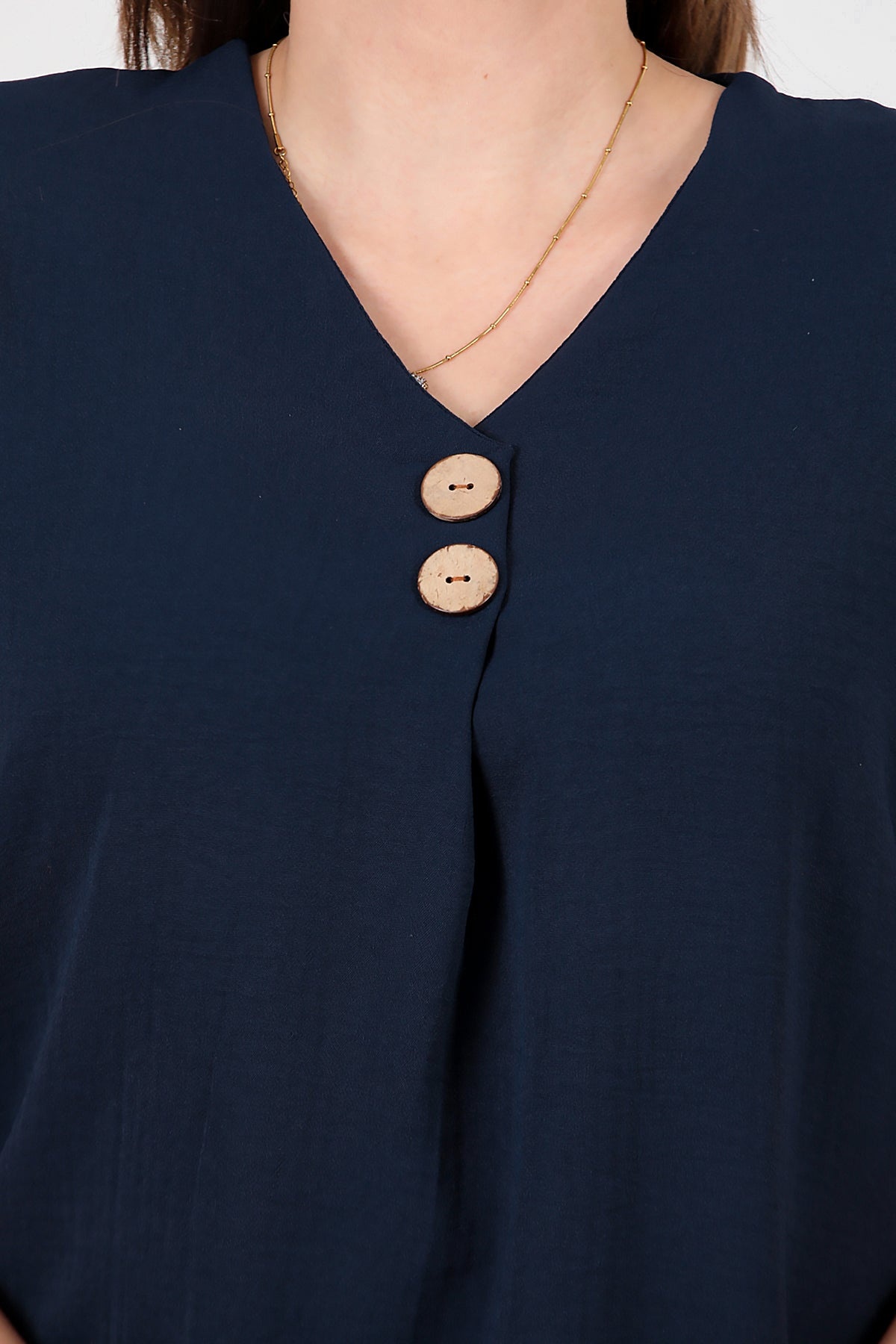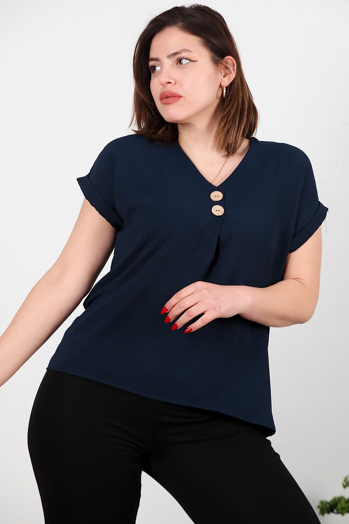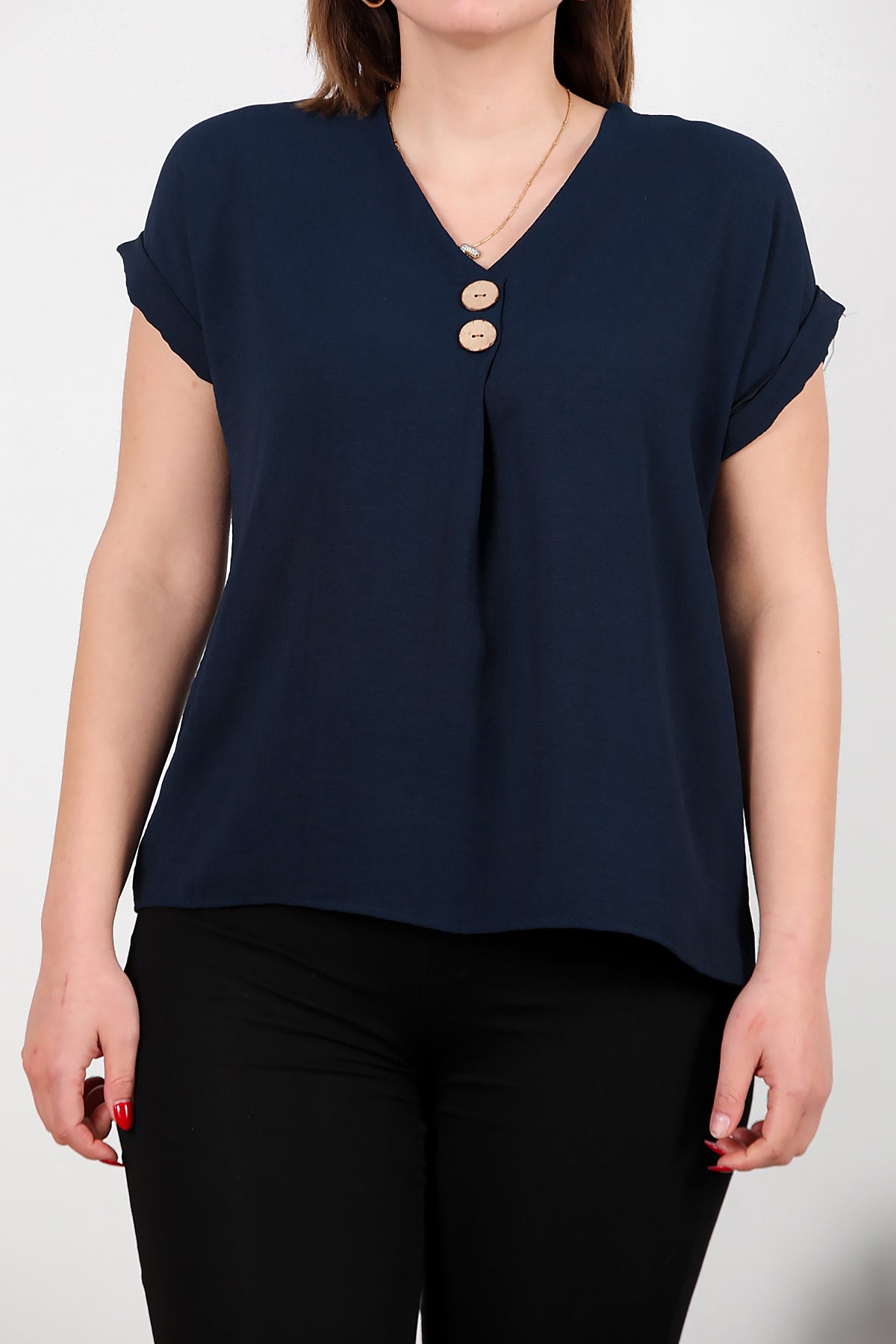 Büyük Beden V Yaka İki Düğmeli Bluz Lacivert