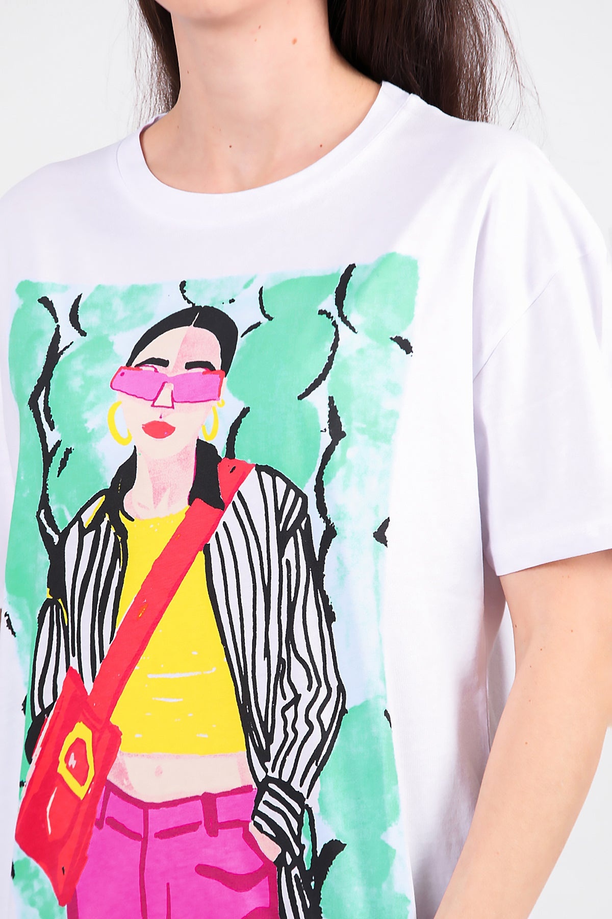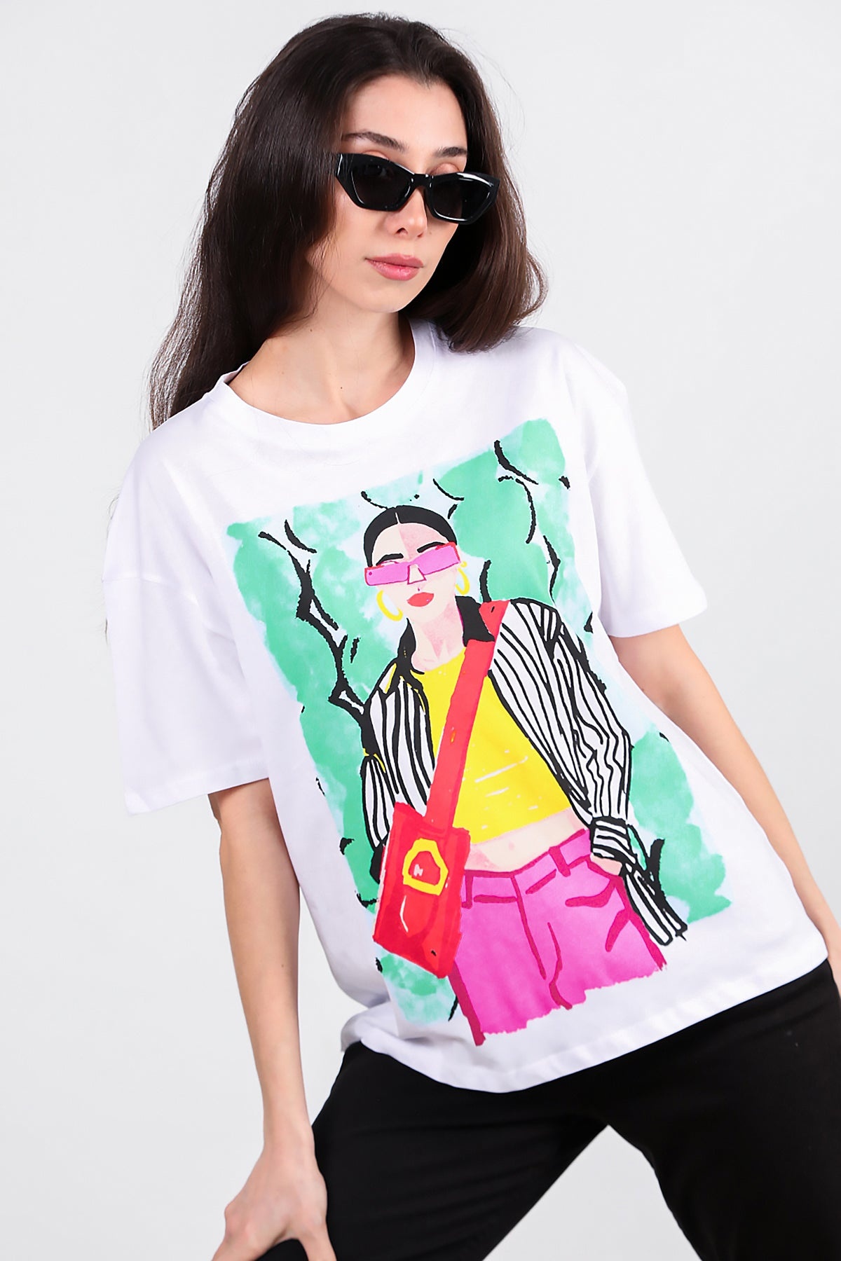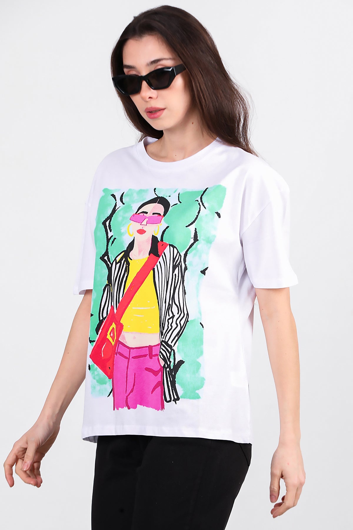 Kadın Baskılı Bisiklet Yaka Tshirt Ekru