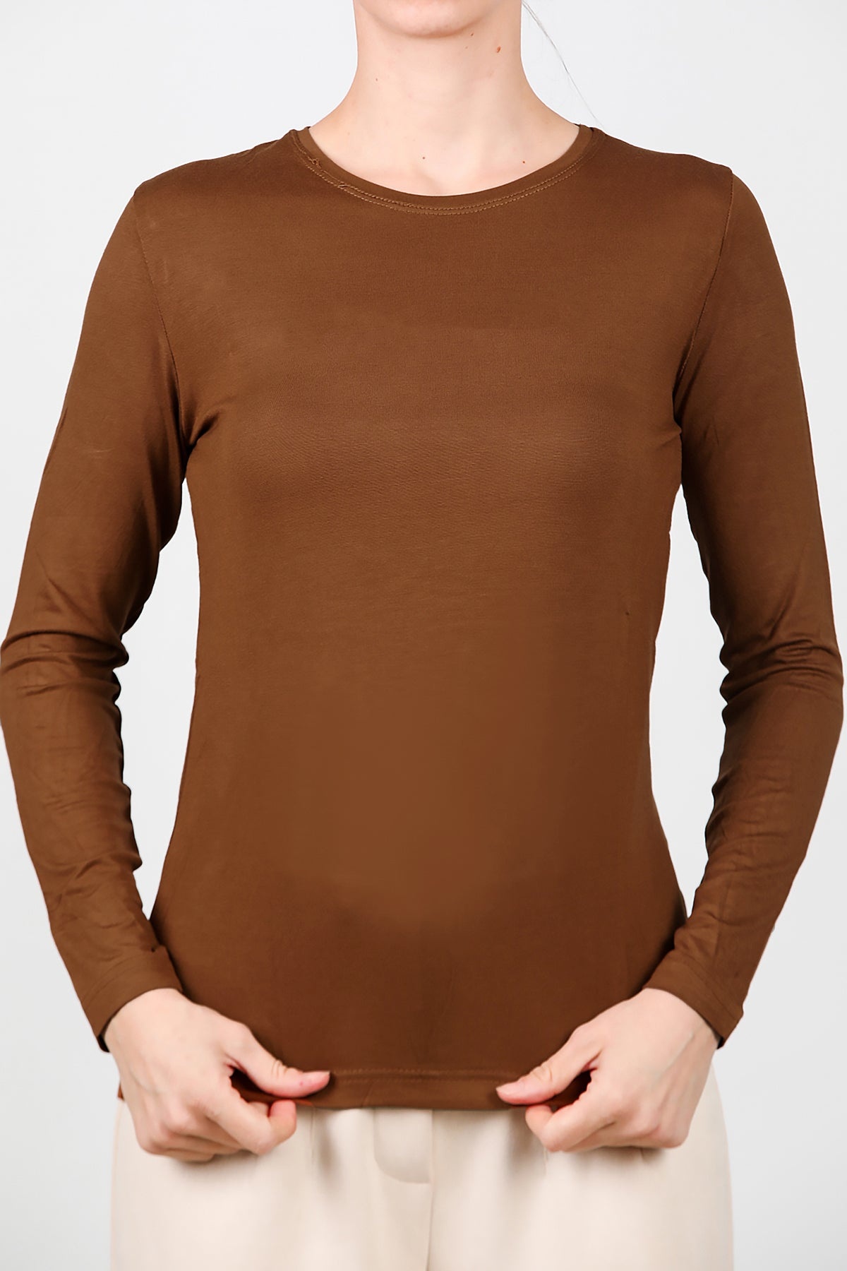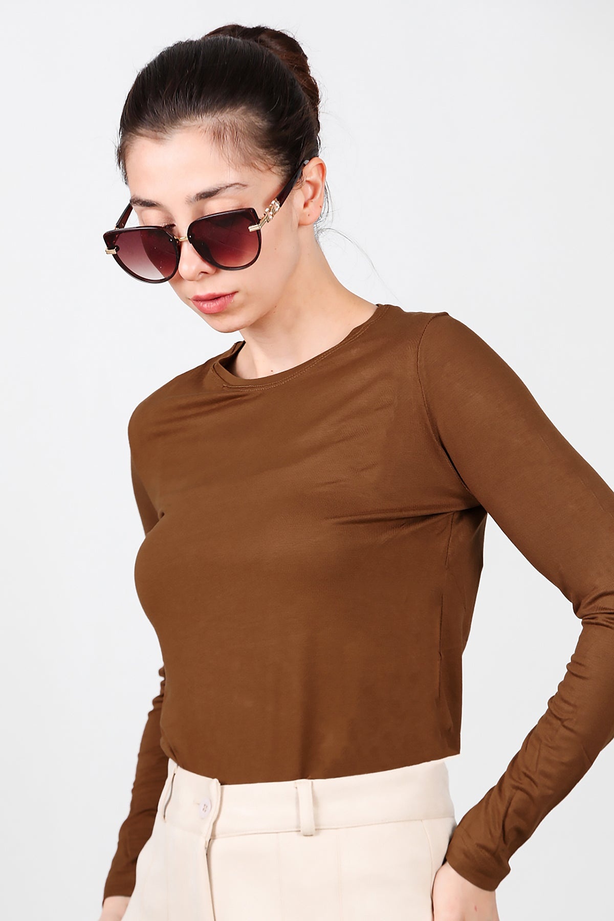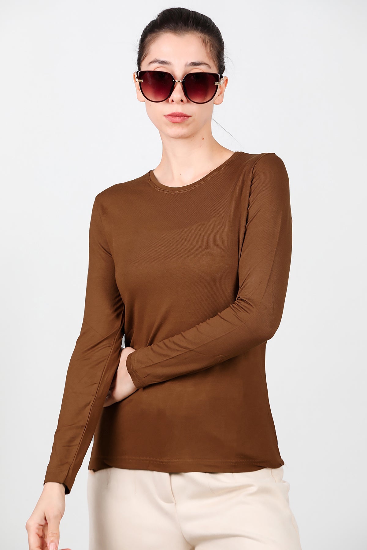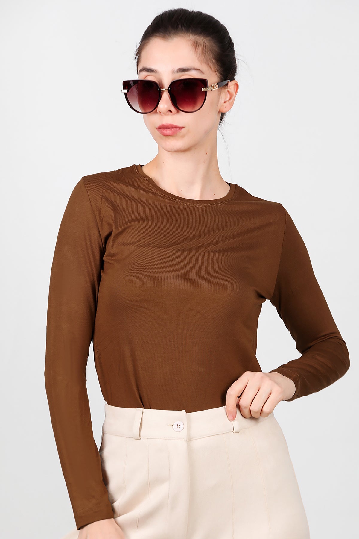 Kadın Bisiklet Yaka Uzun Kol Penye Bluz Kahverengi