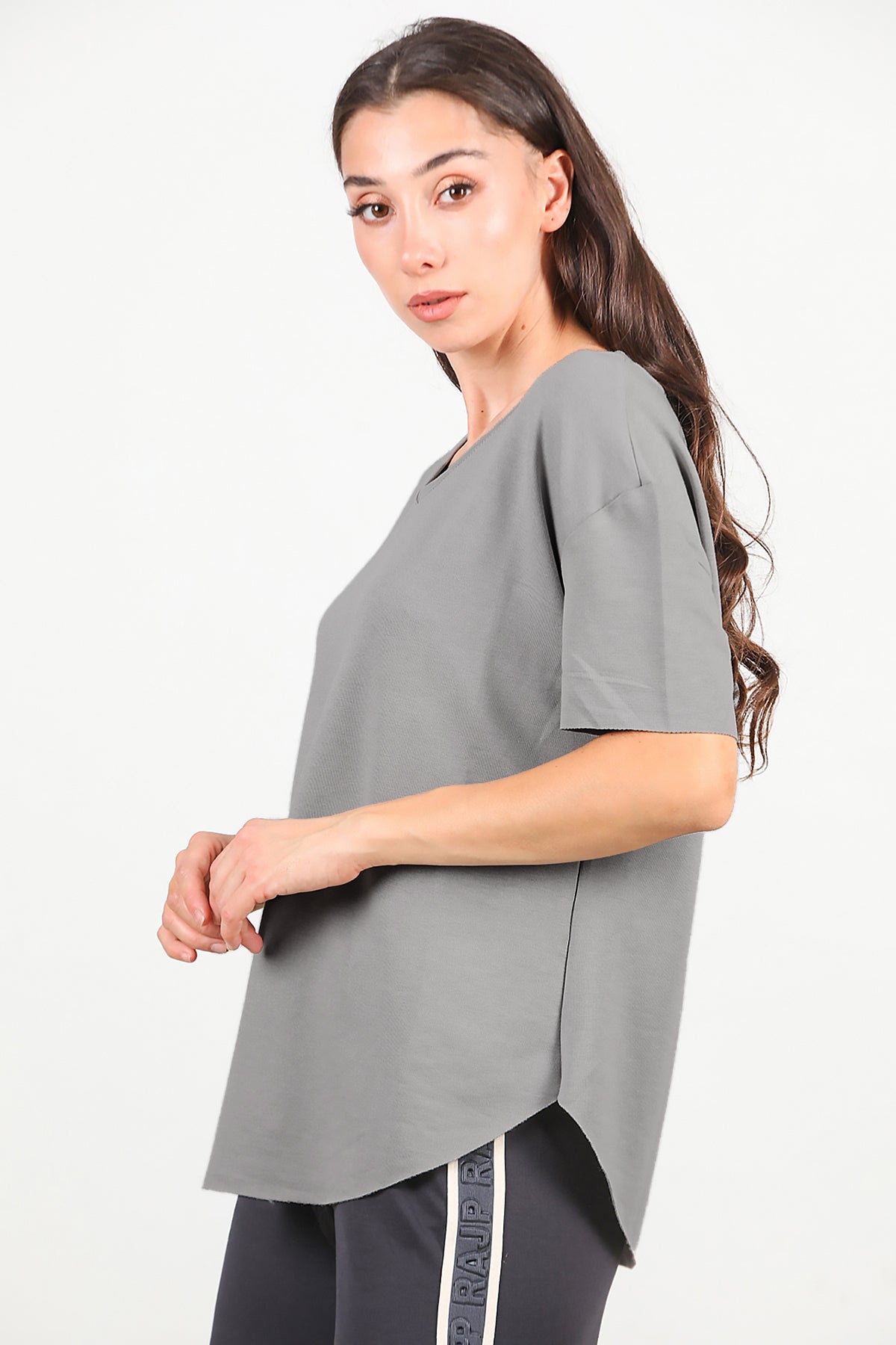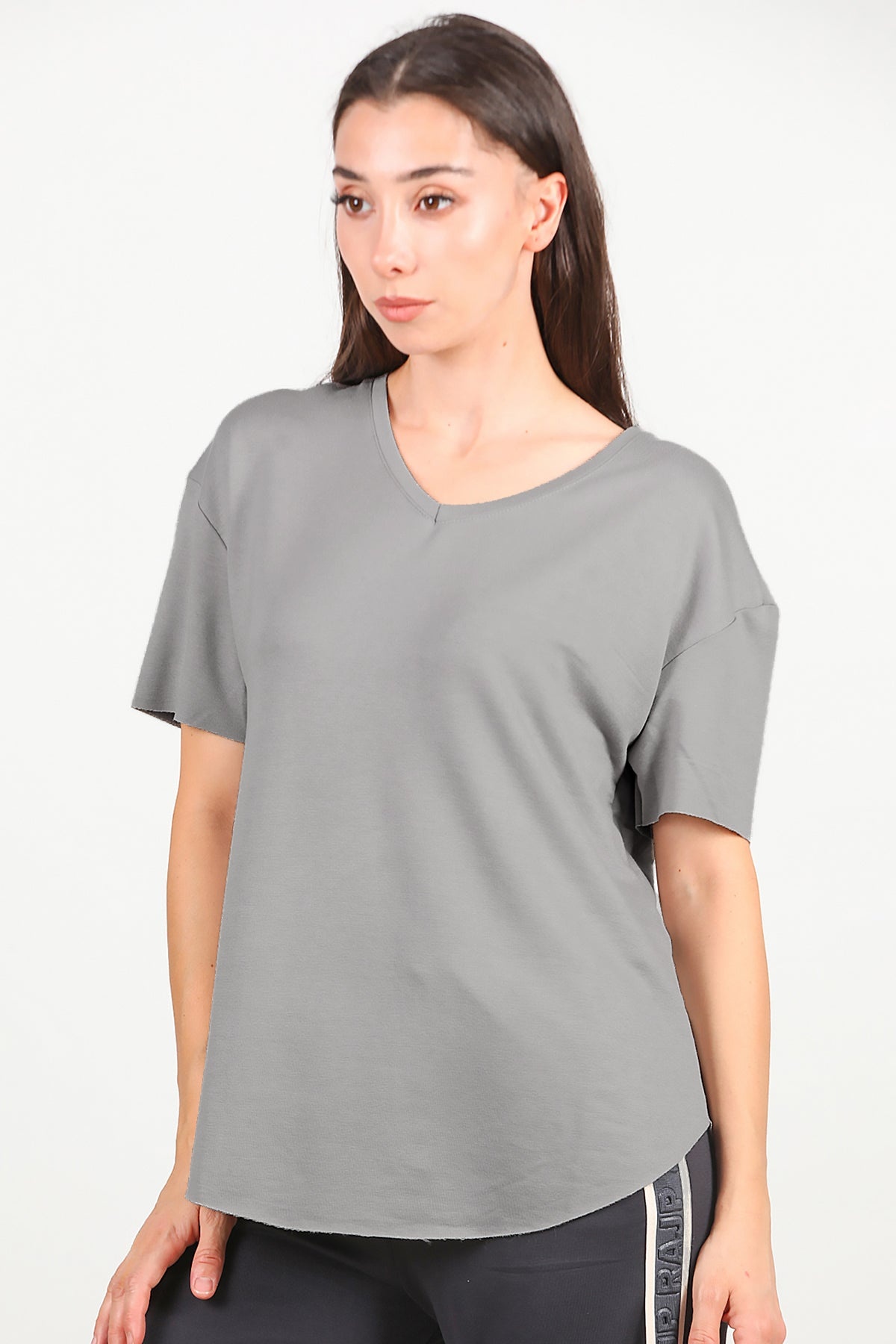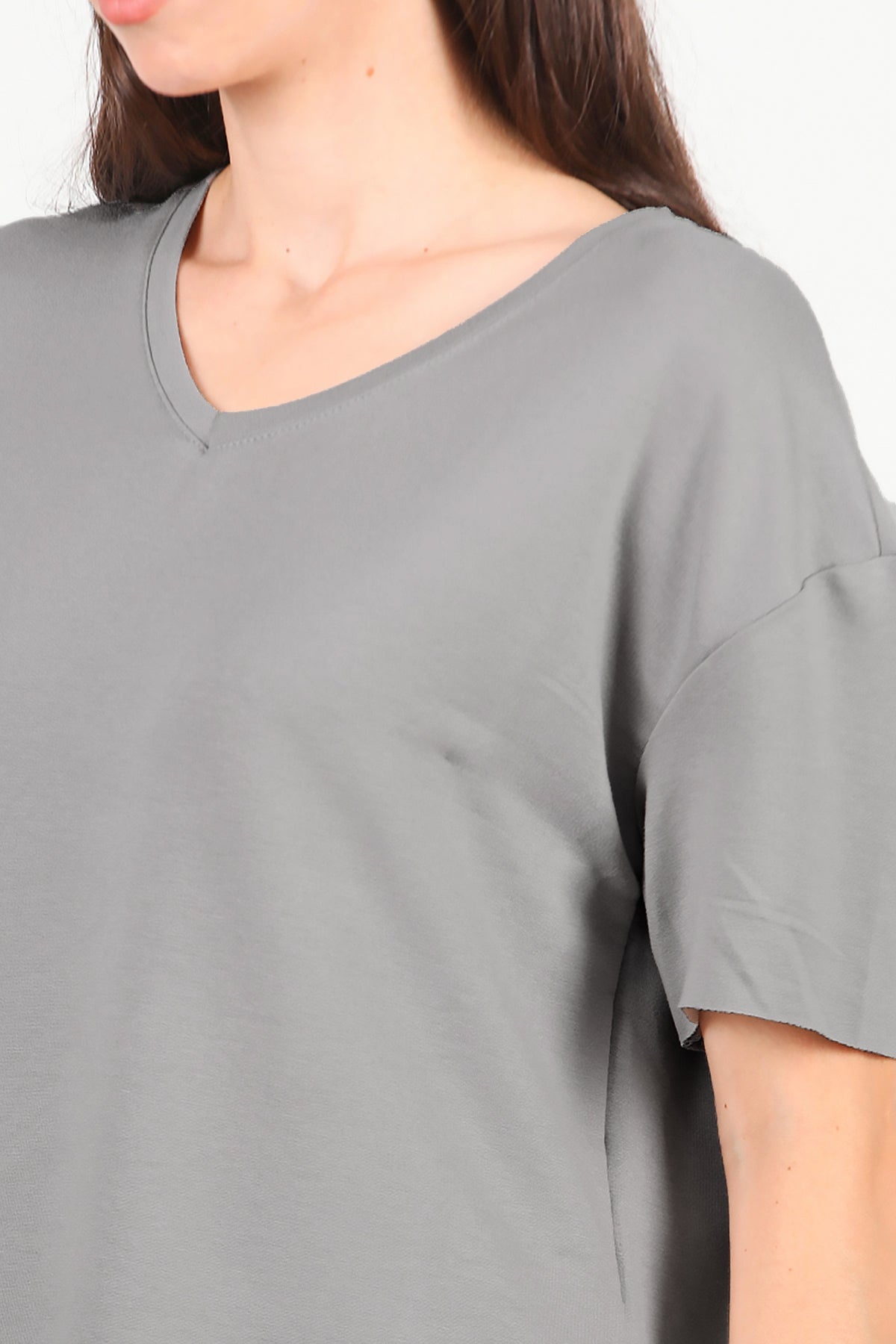 Kadın Eteği Oval V Yaka Tshırt Gri