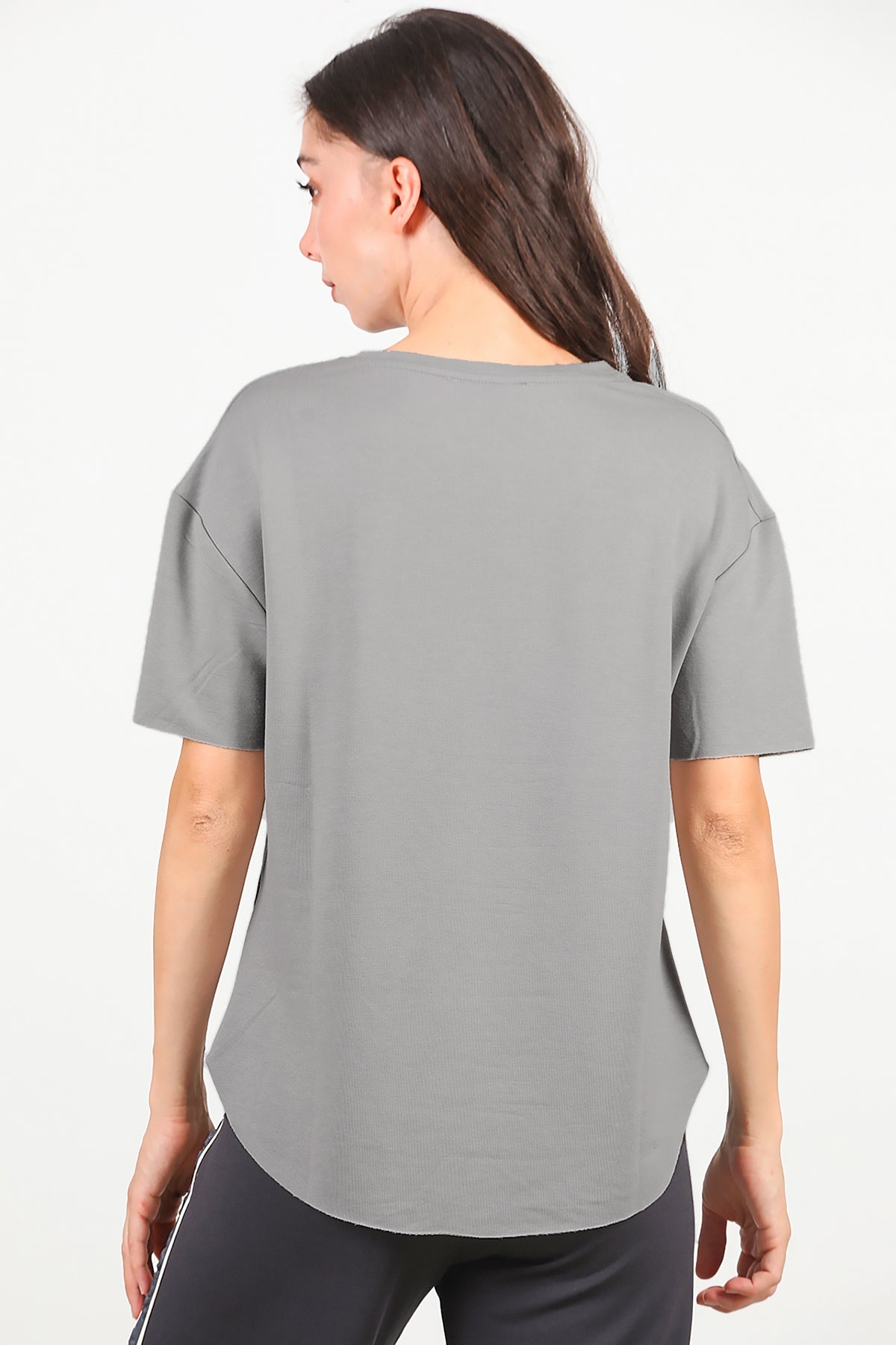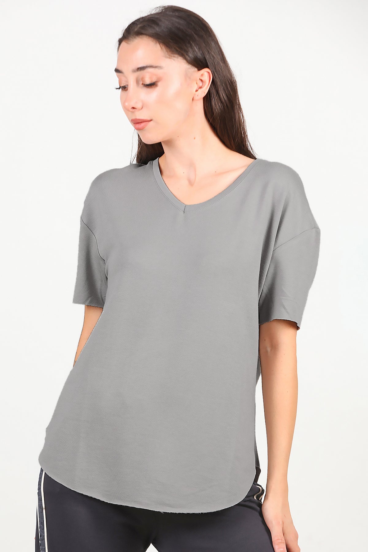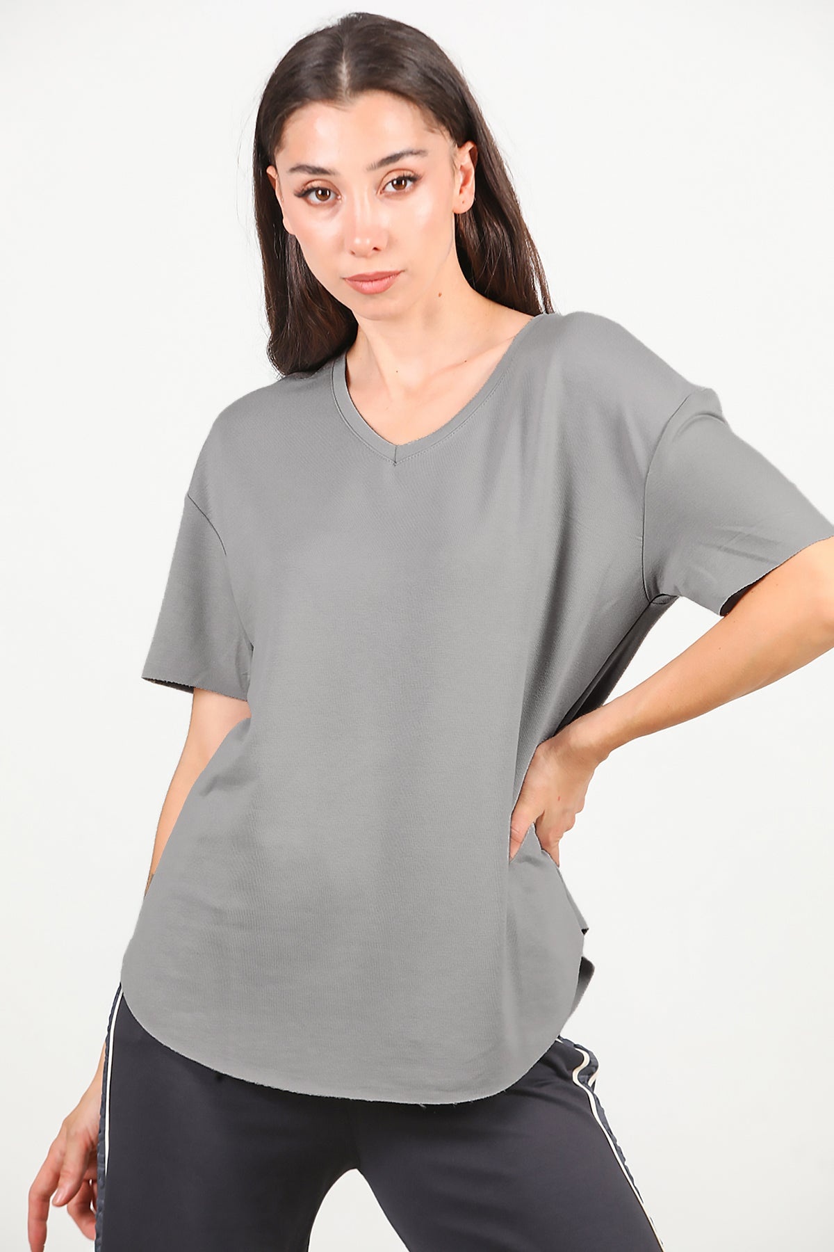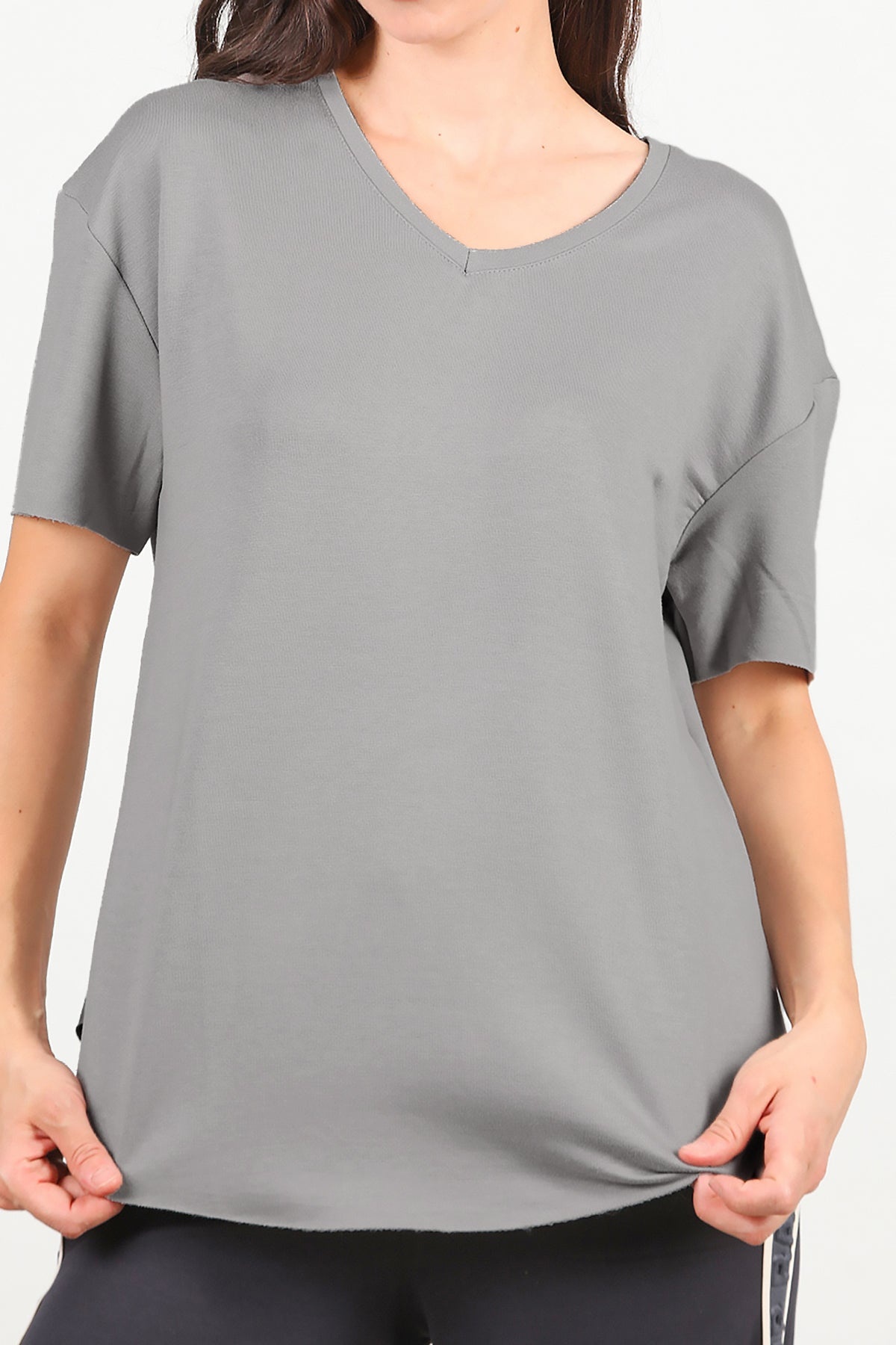 Kadın Eteği Oval V Yaka Tshırt Gri