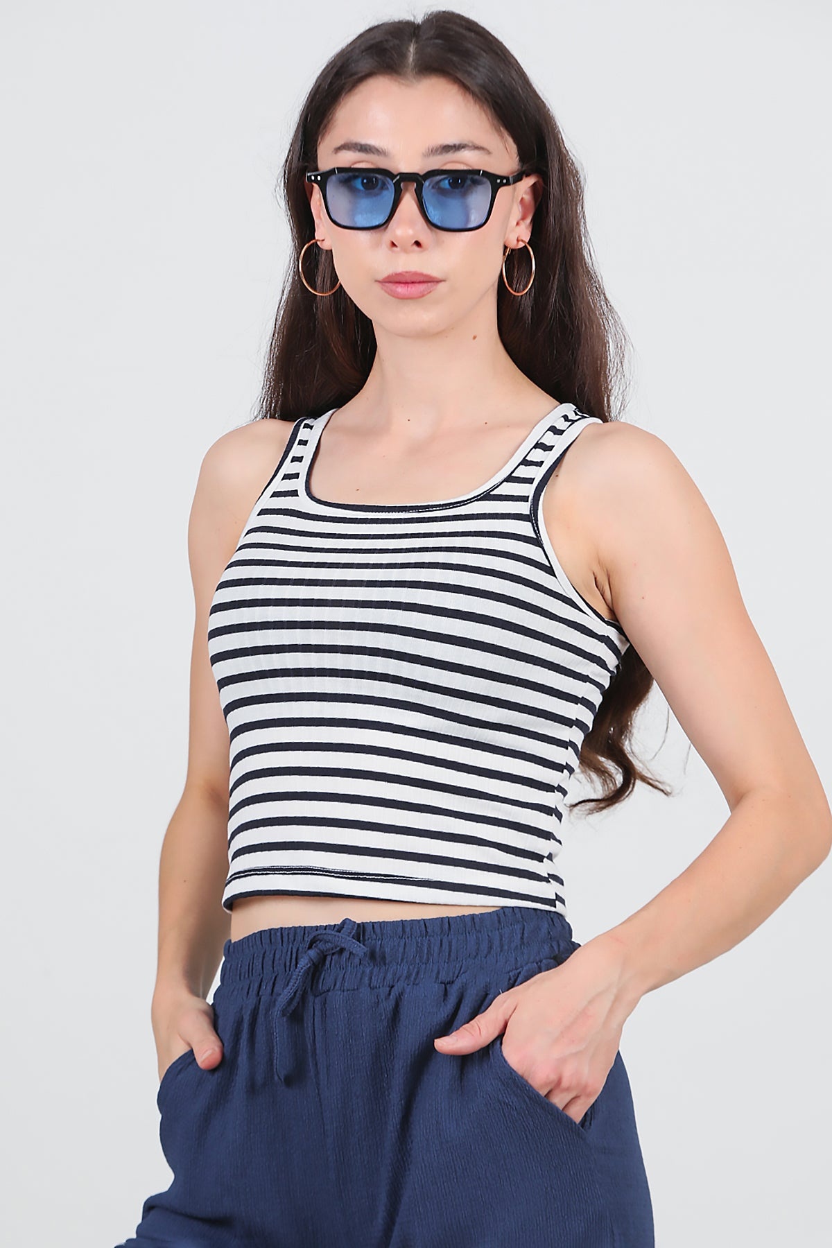 Kadın Kalın Çizgili Askılı Bluz Lacivert