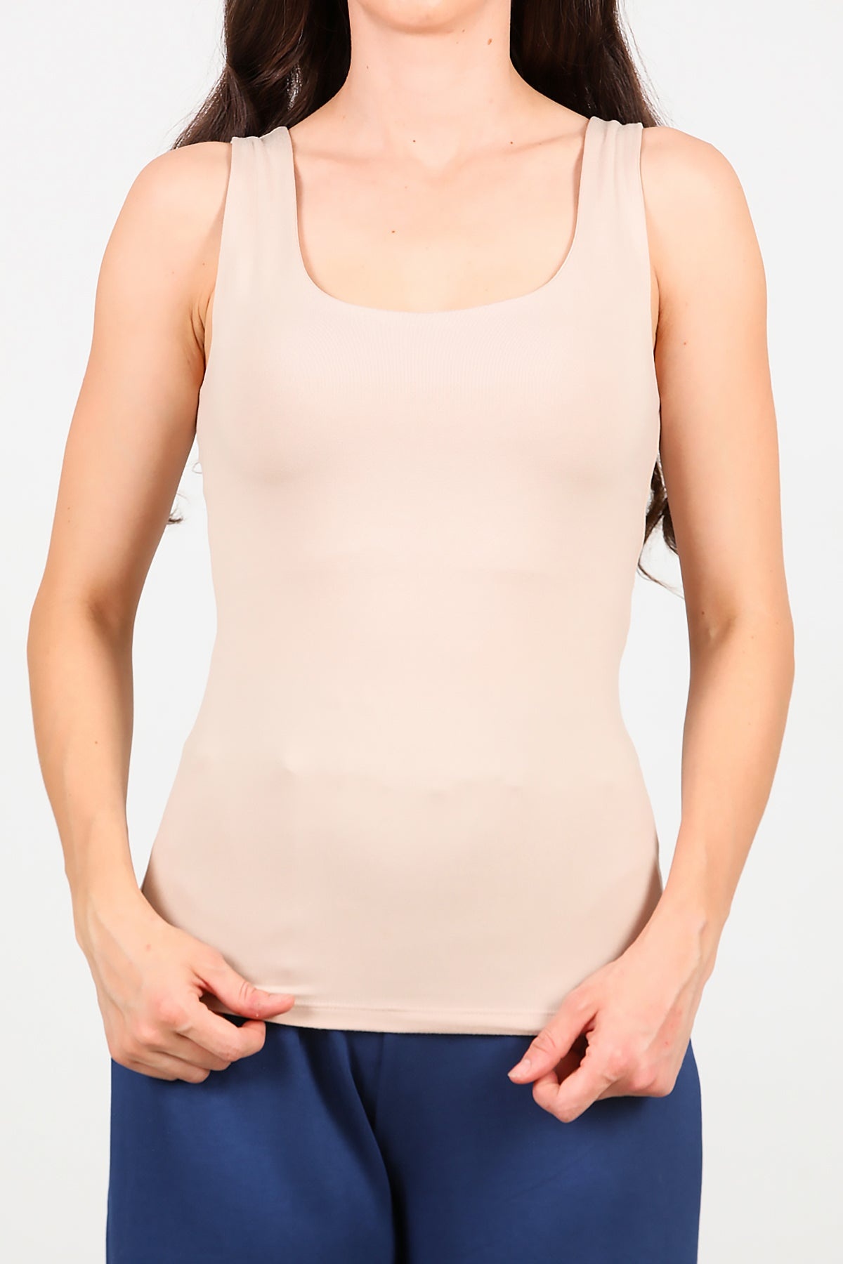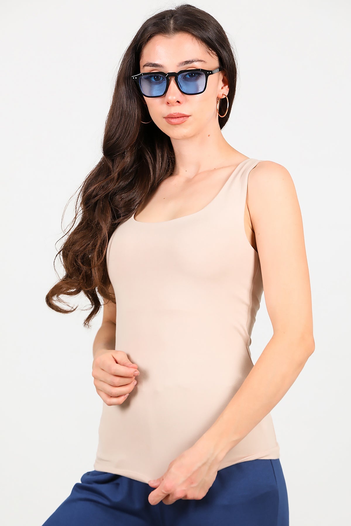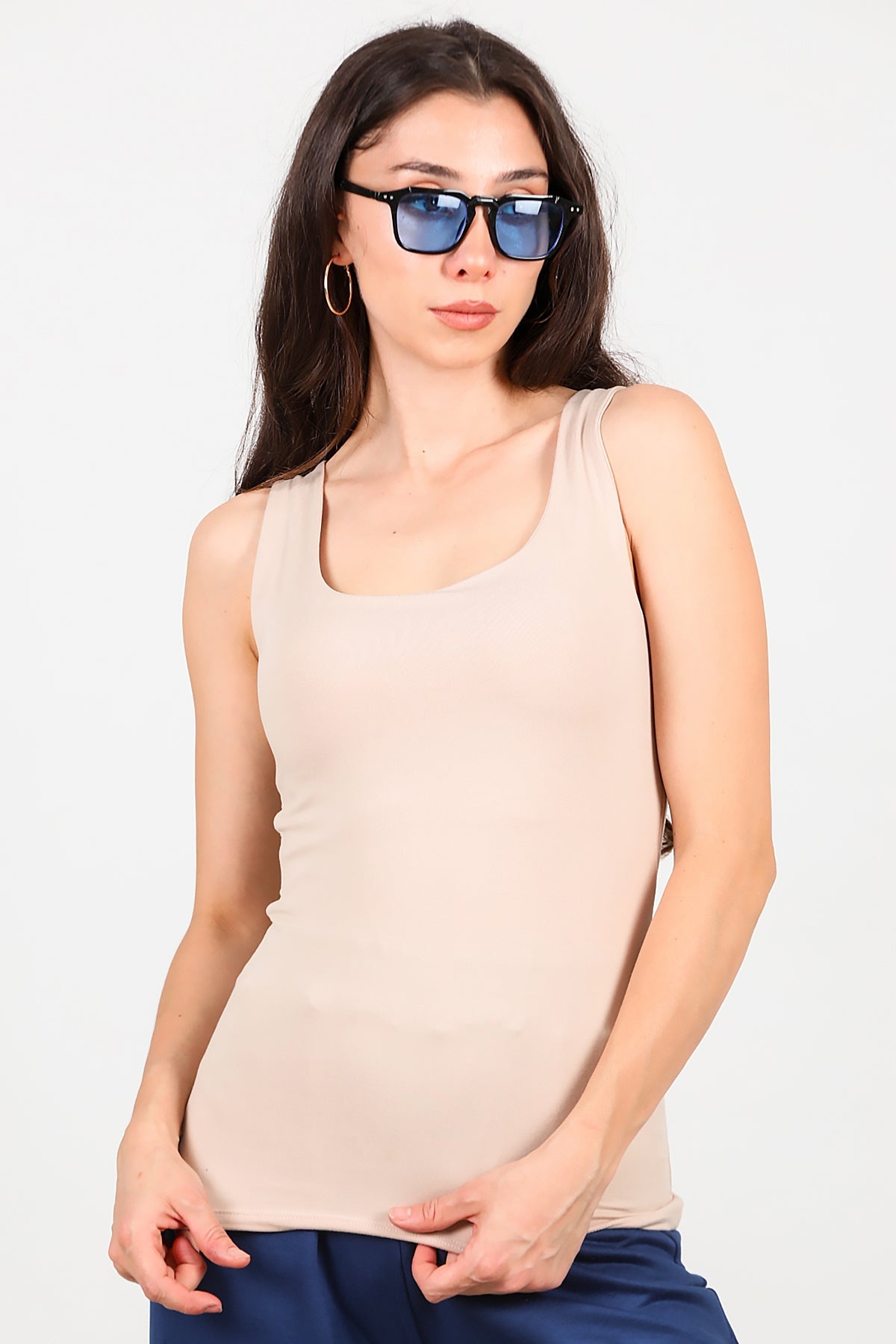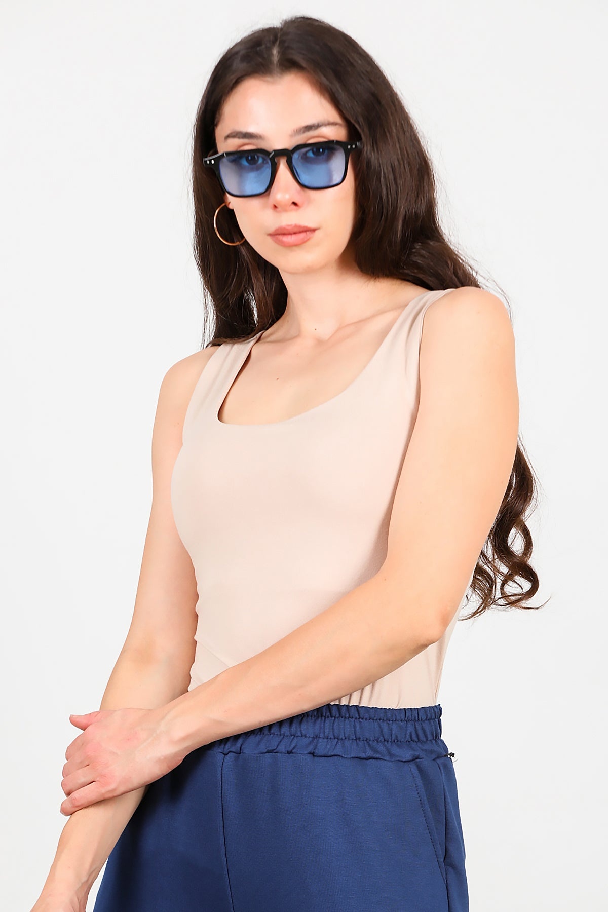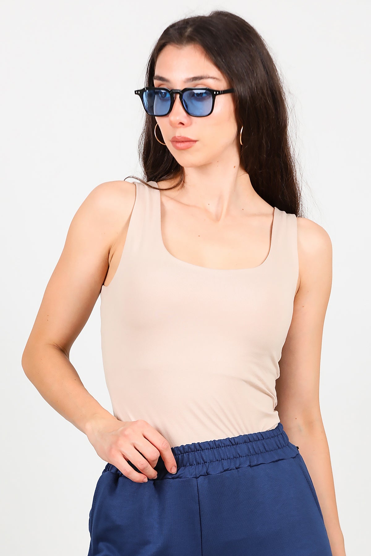 Kadın Kare Yaka Kolsuz Bluz Bej