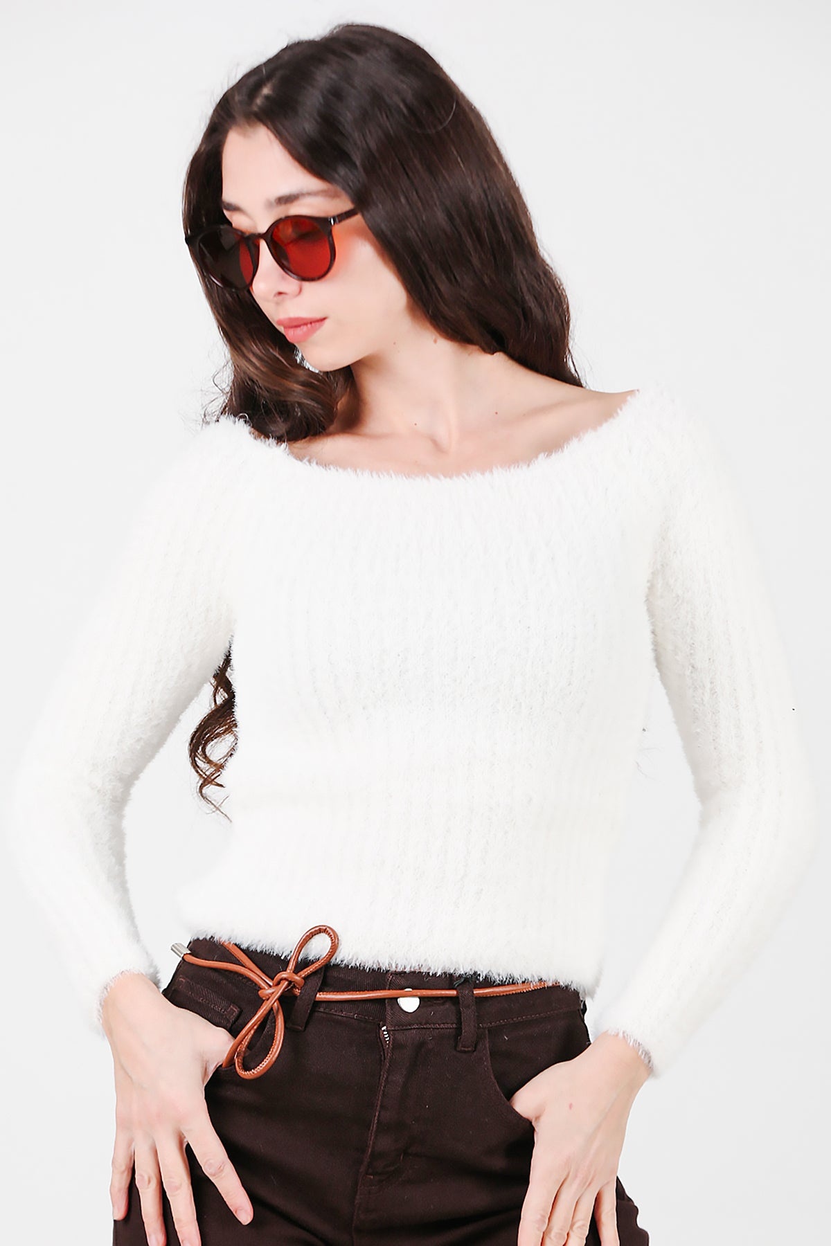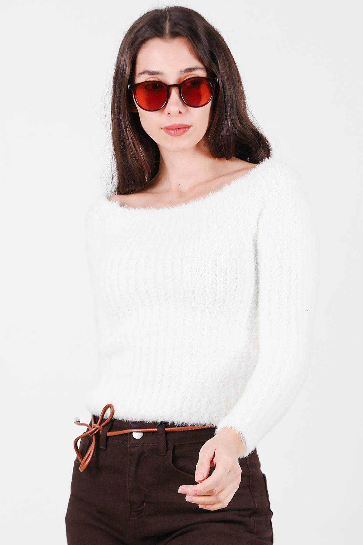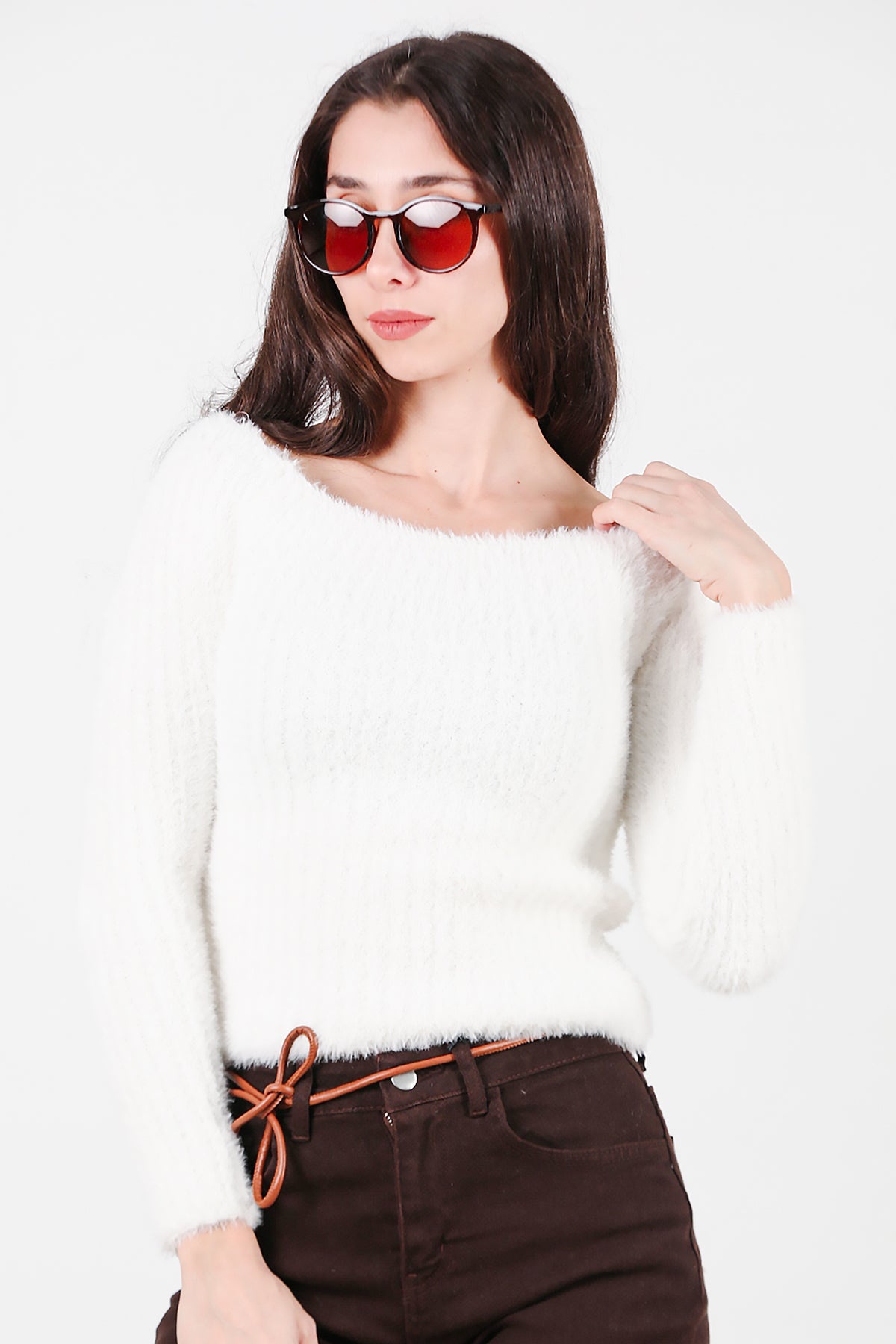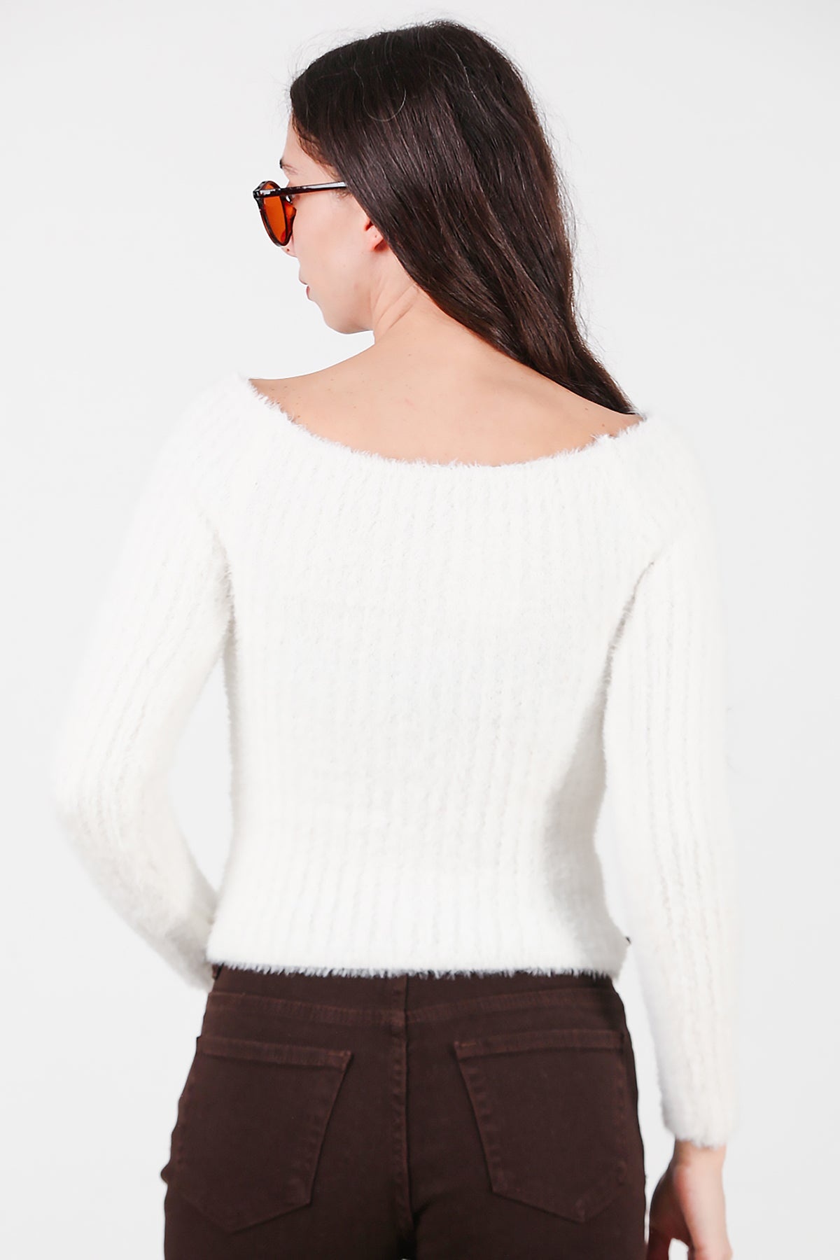 Kadın Kayık Yaka Sakallı Triko Kazak Beyaz