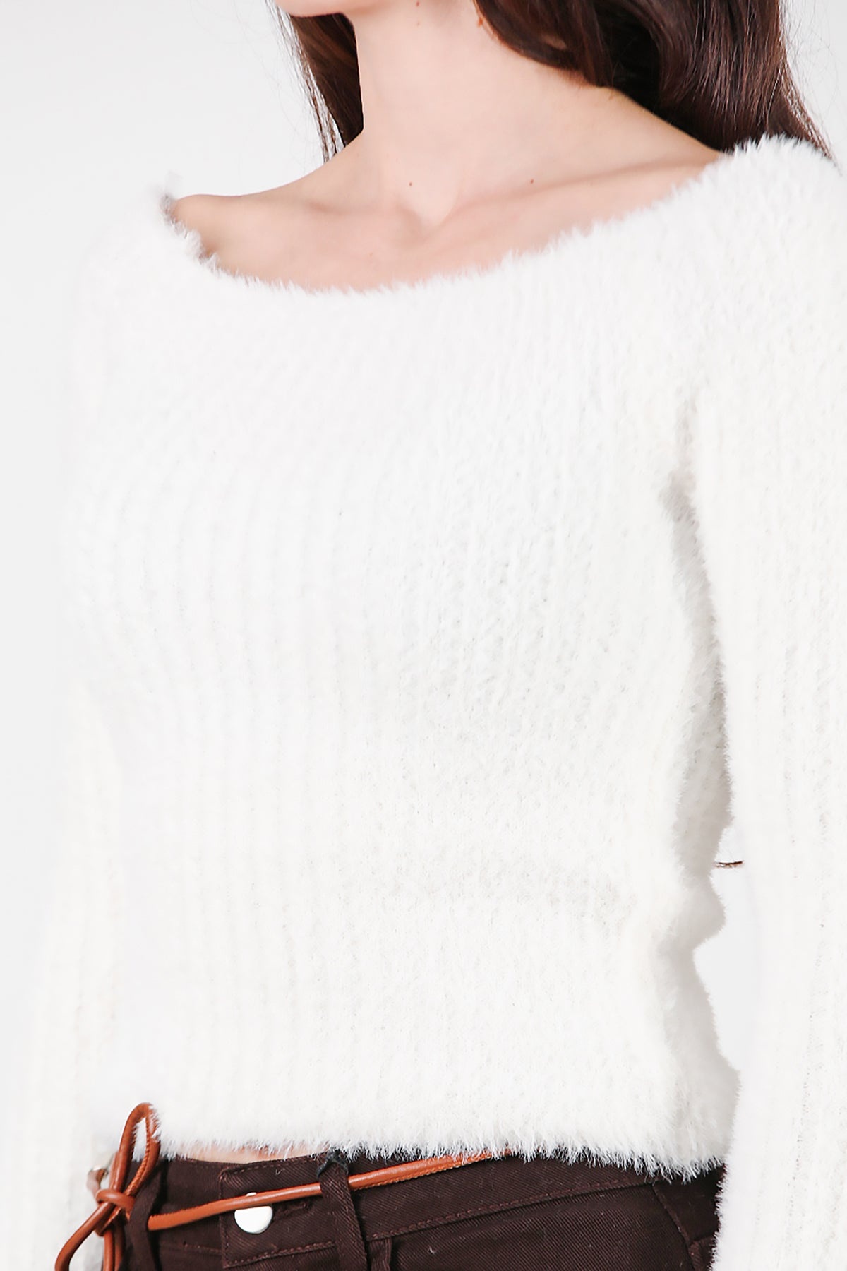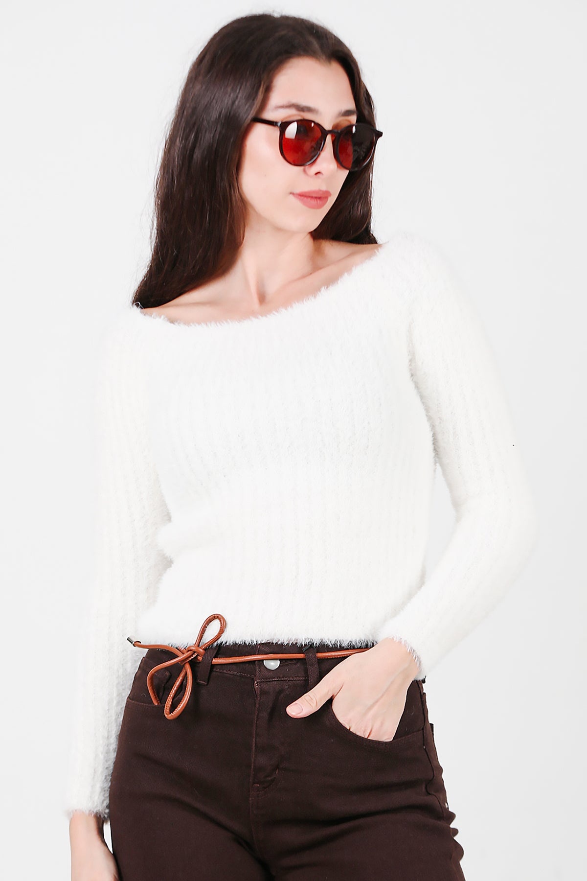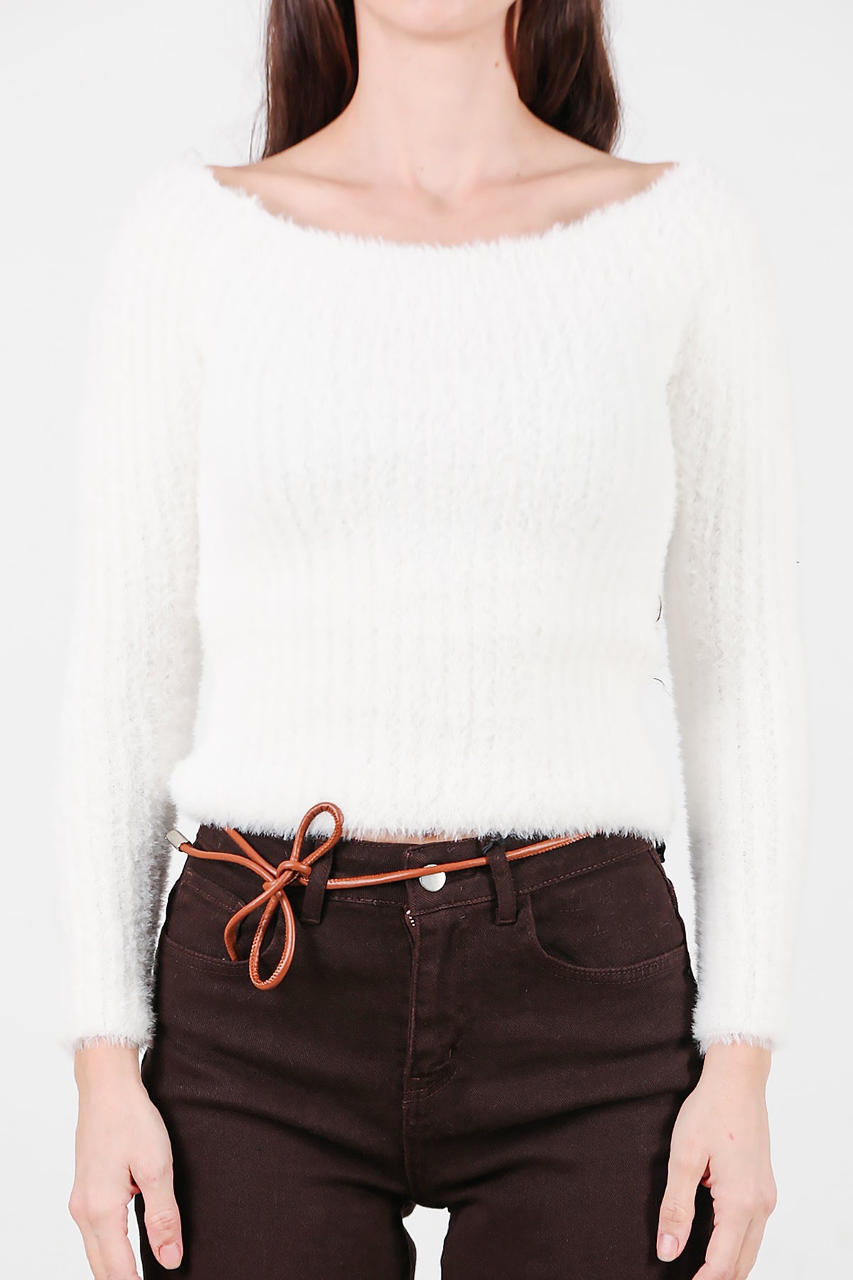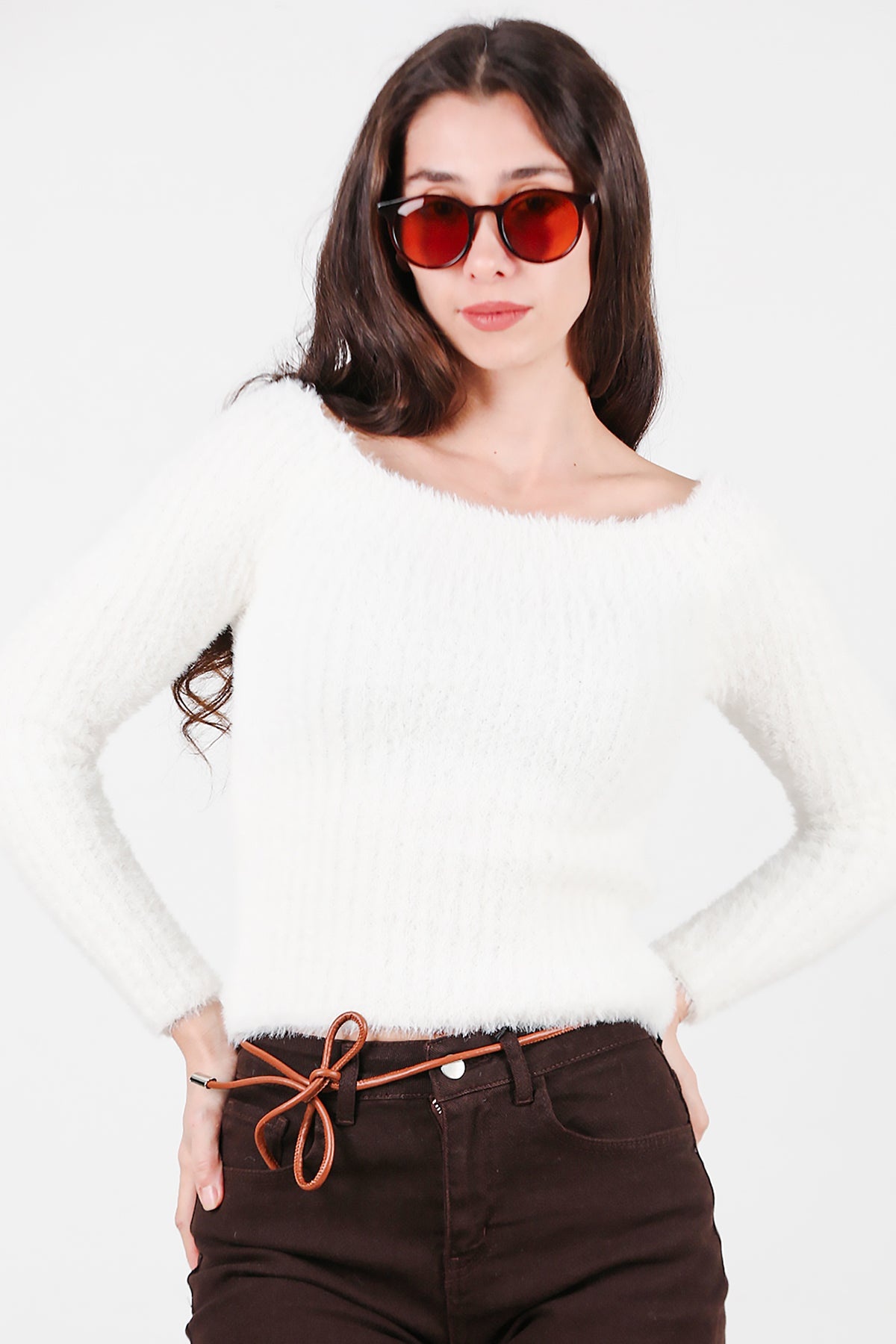 Kadın Kayık Yaka Sakallı Triko Kazak Beyaz