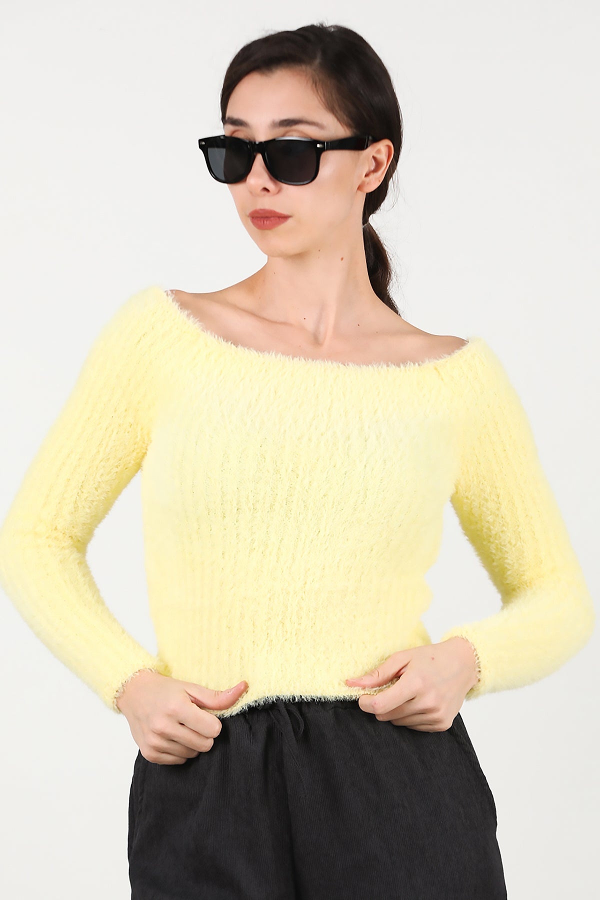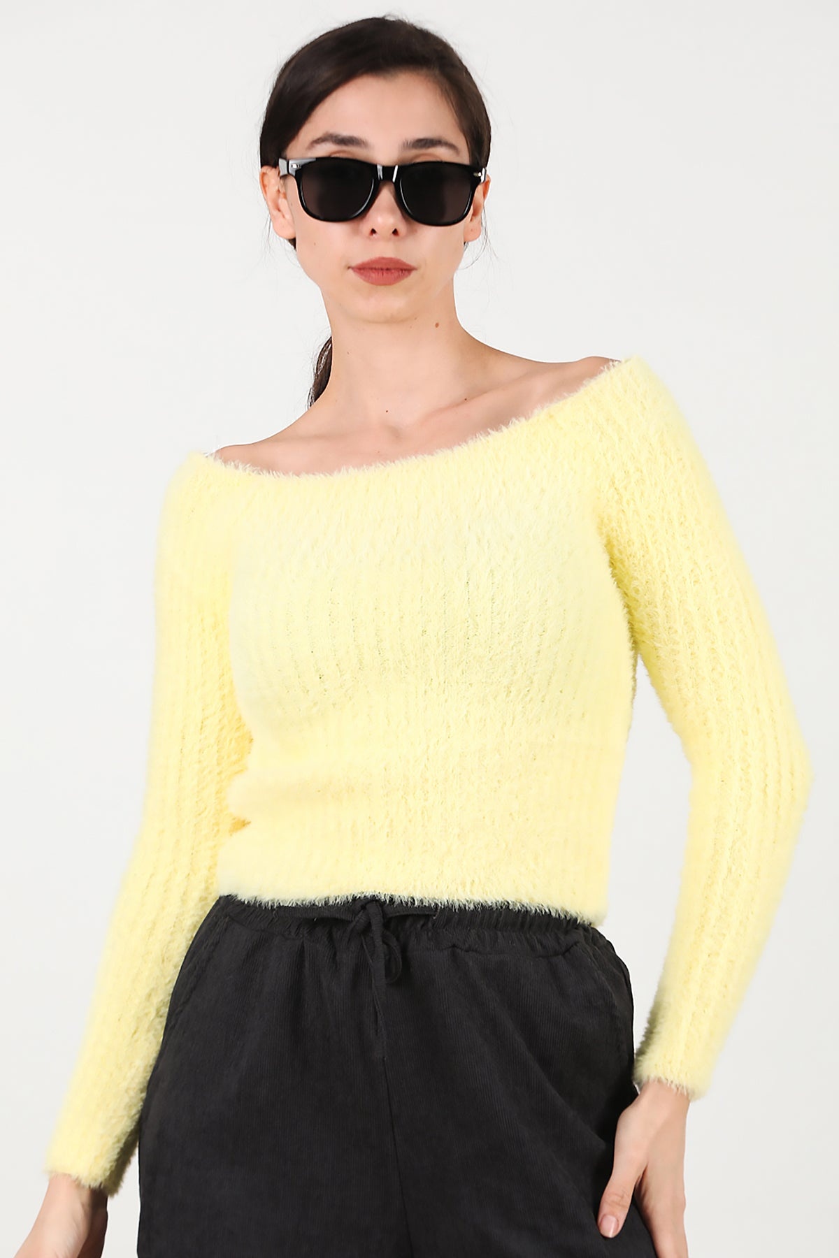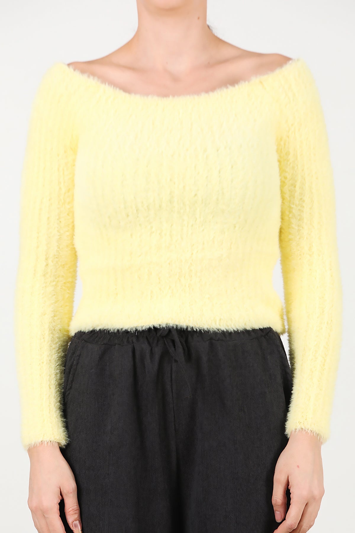 Kadın Kayık Yaka Sakallı Triko Kazak Sarı