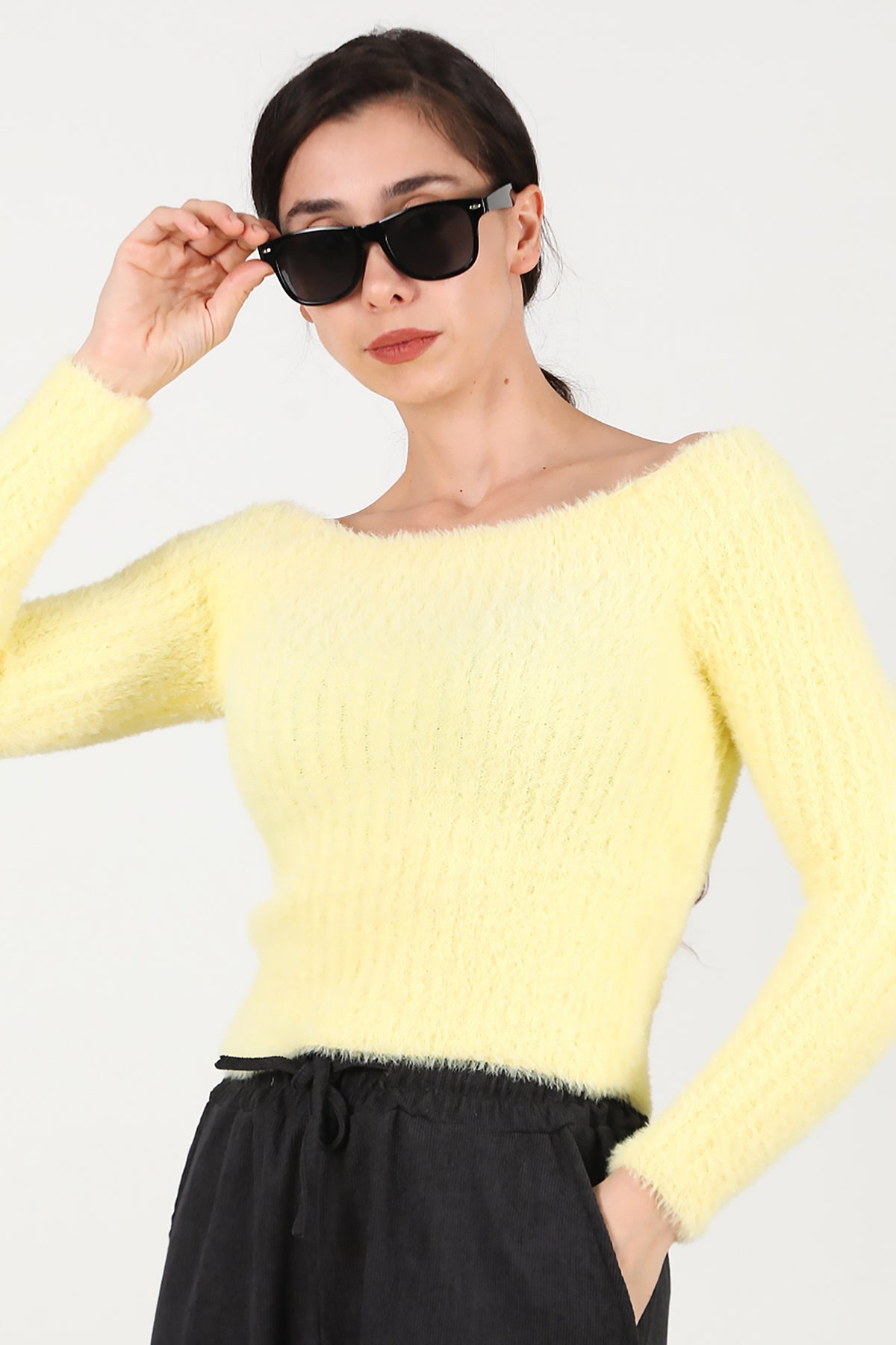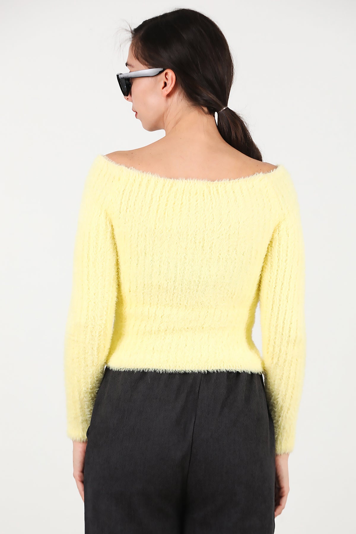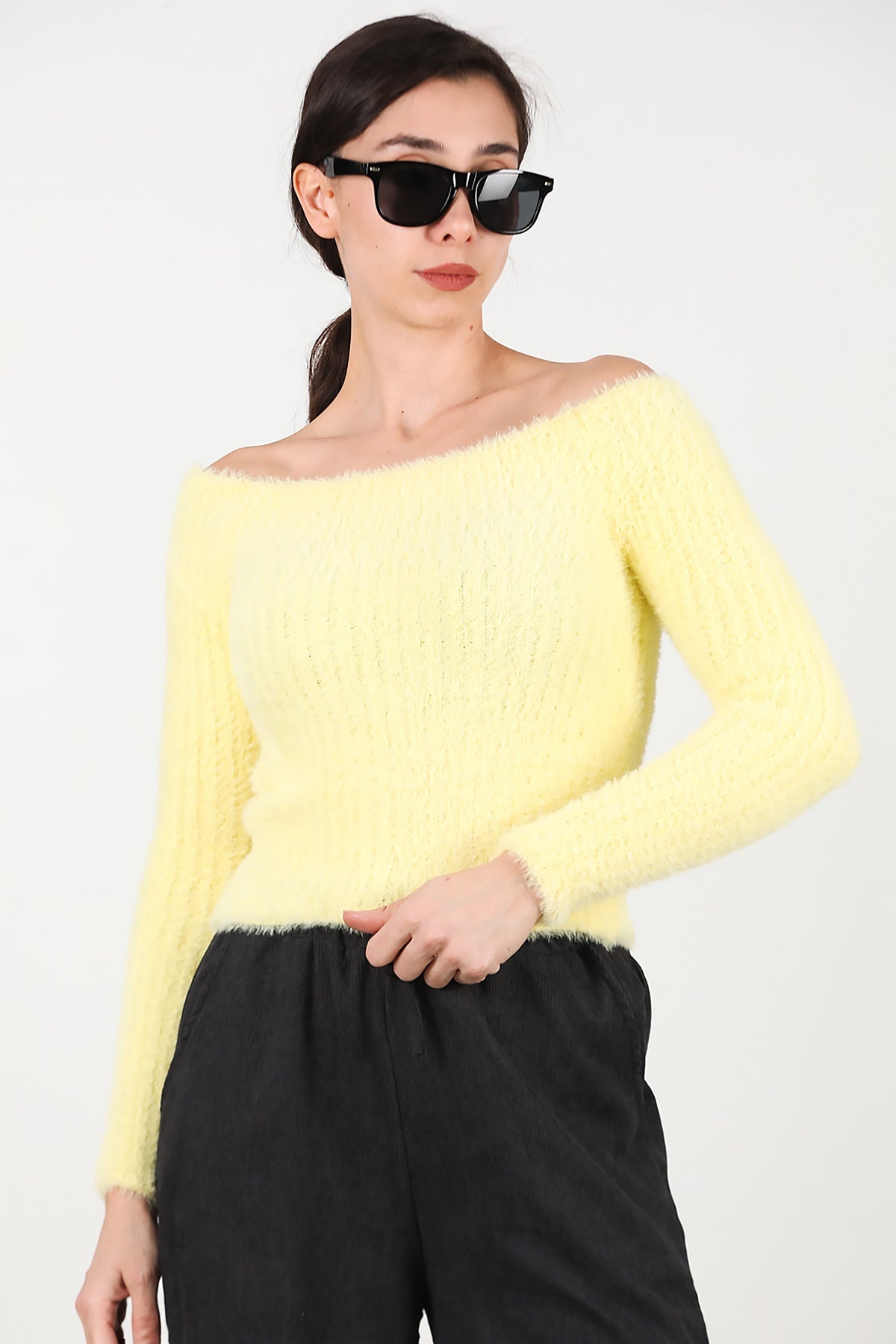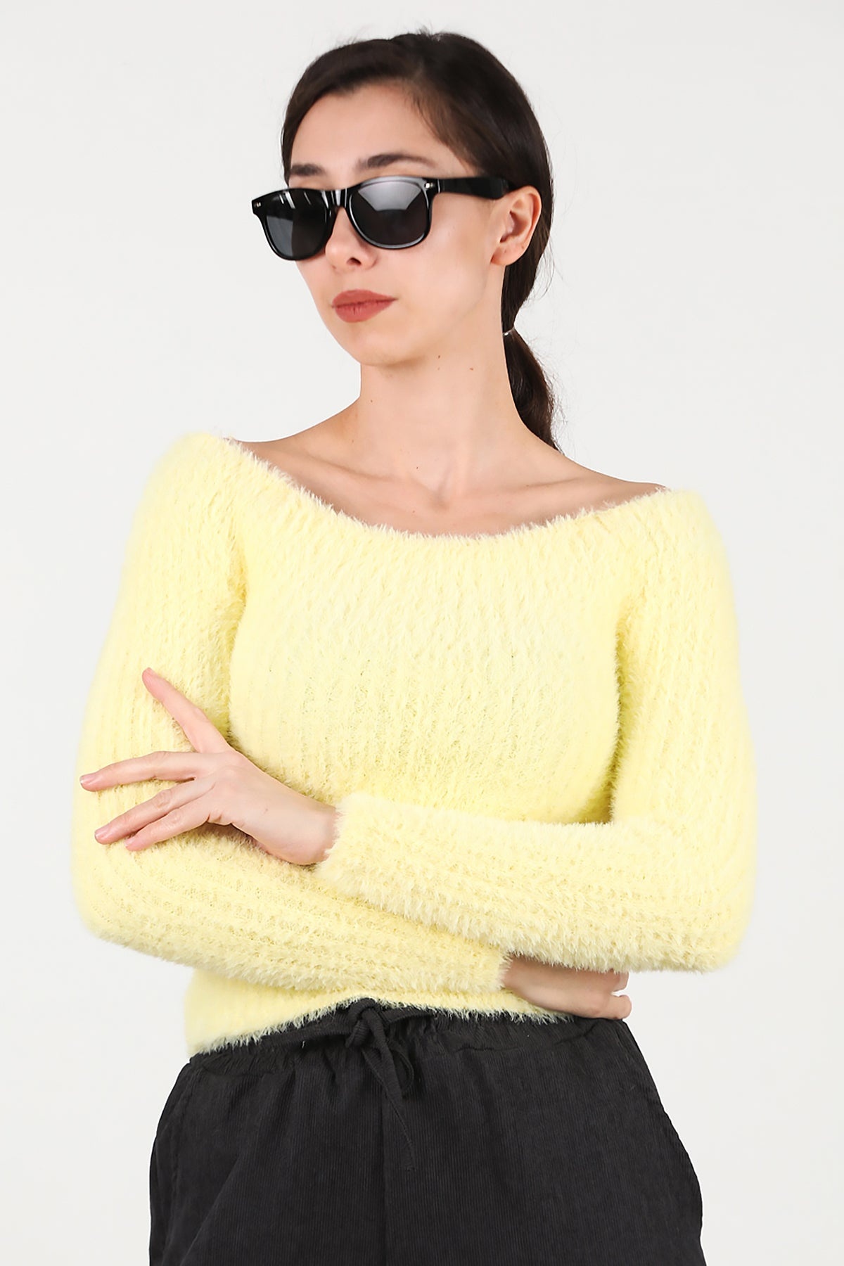 Kadın Kayık Yaka Sakallı Triko Kazak Sarı