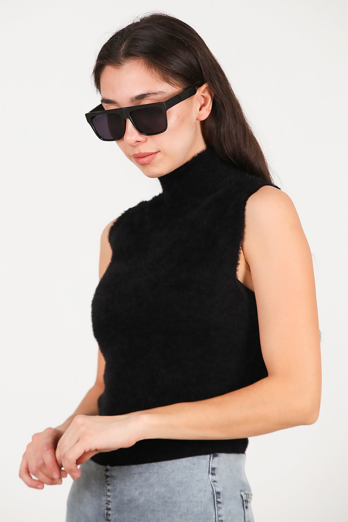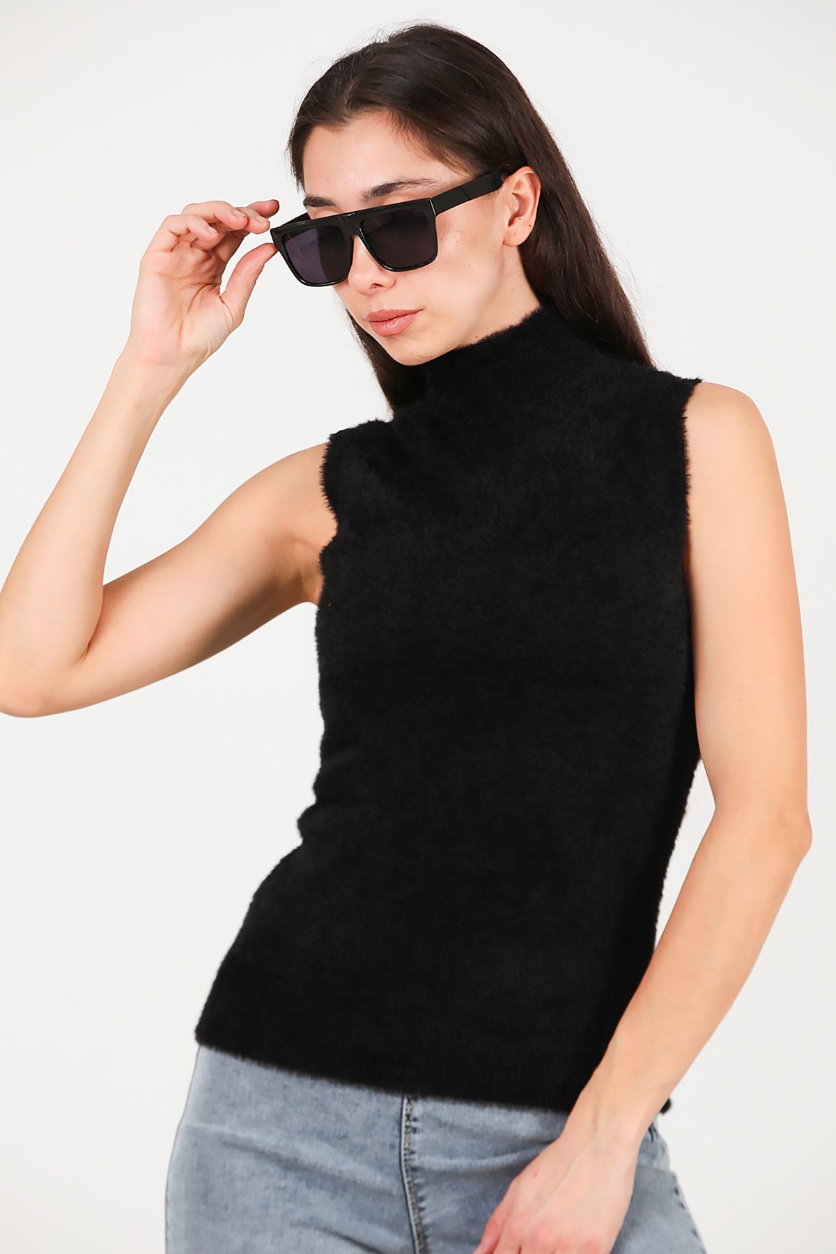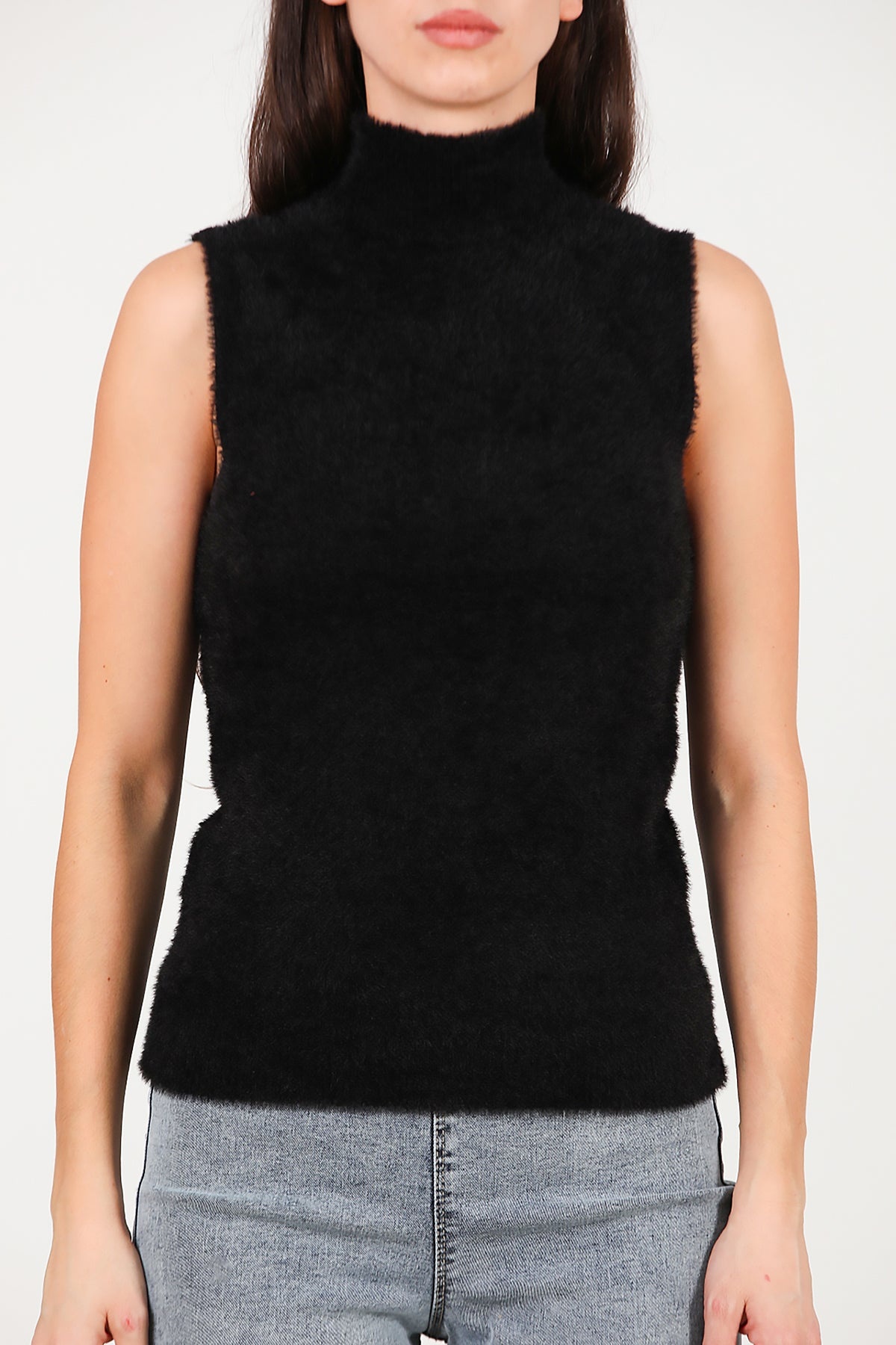 Kadın Kolsuz Balıkçı Yaka Sakallı Bluz Siyah