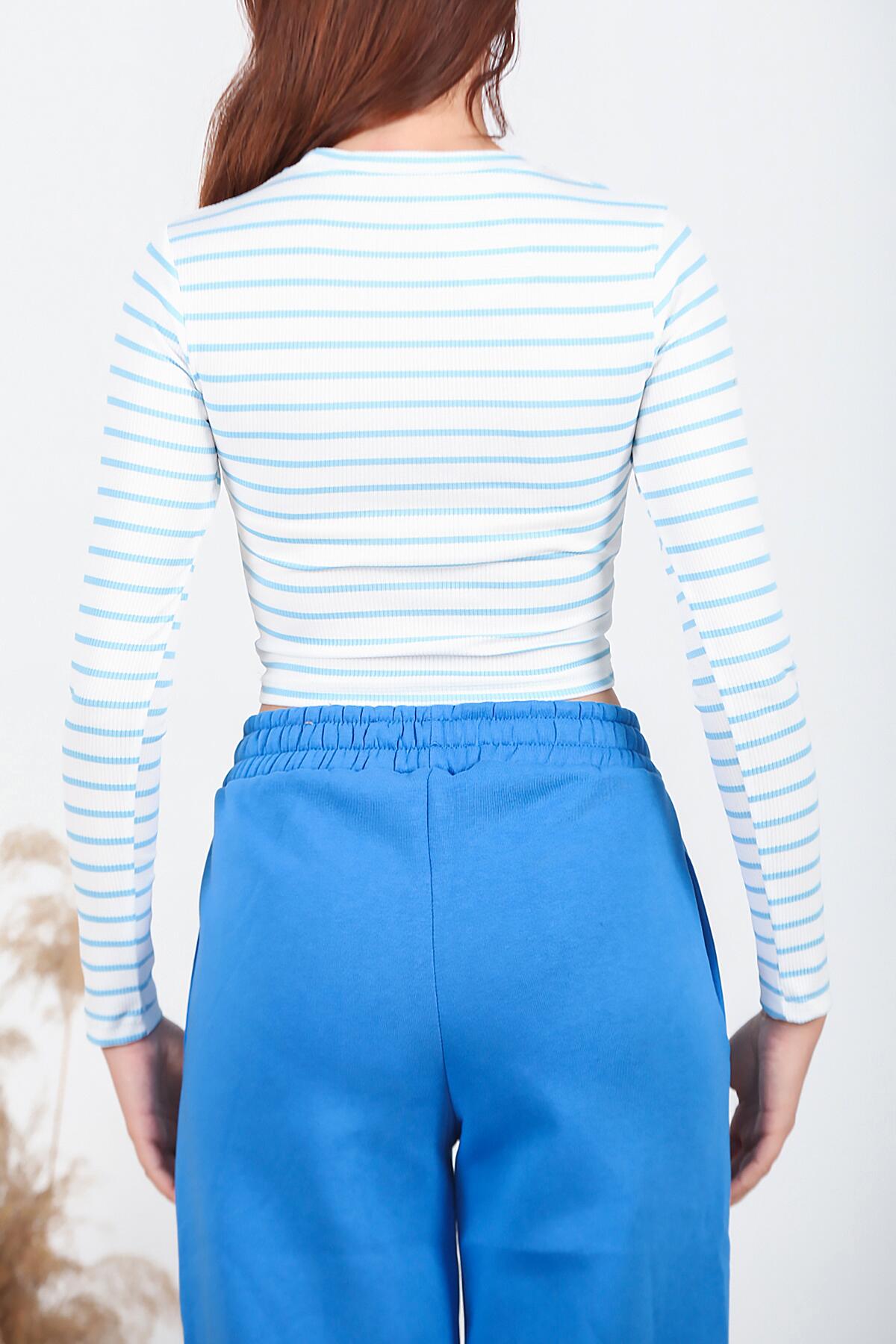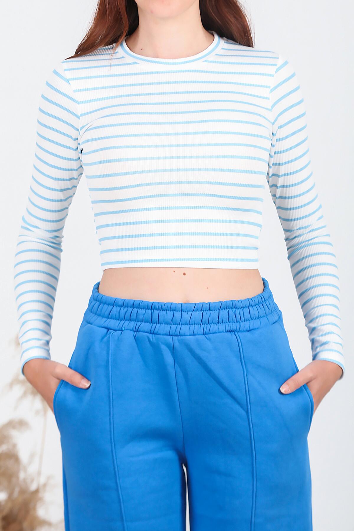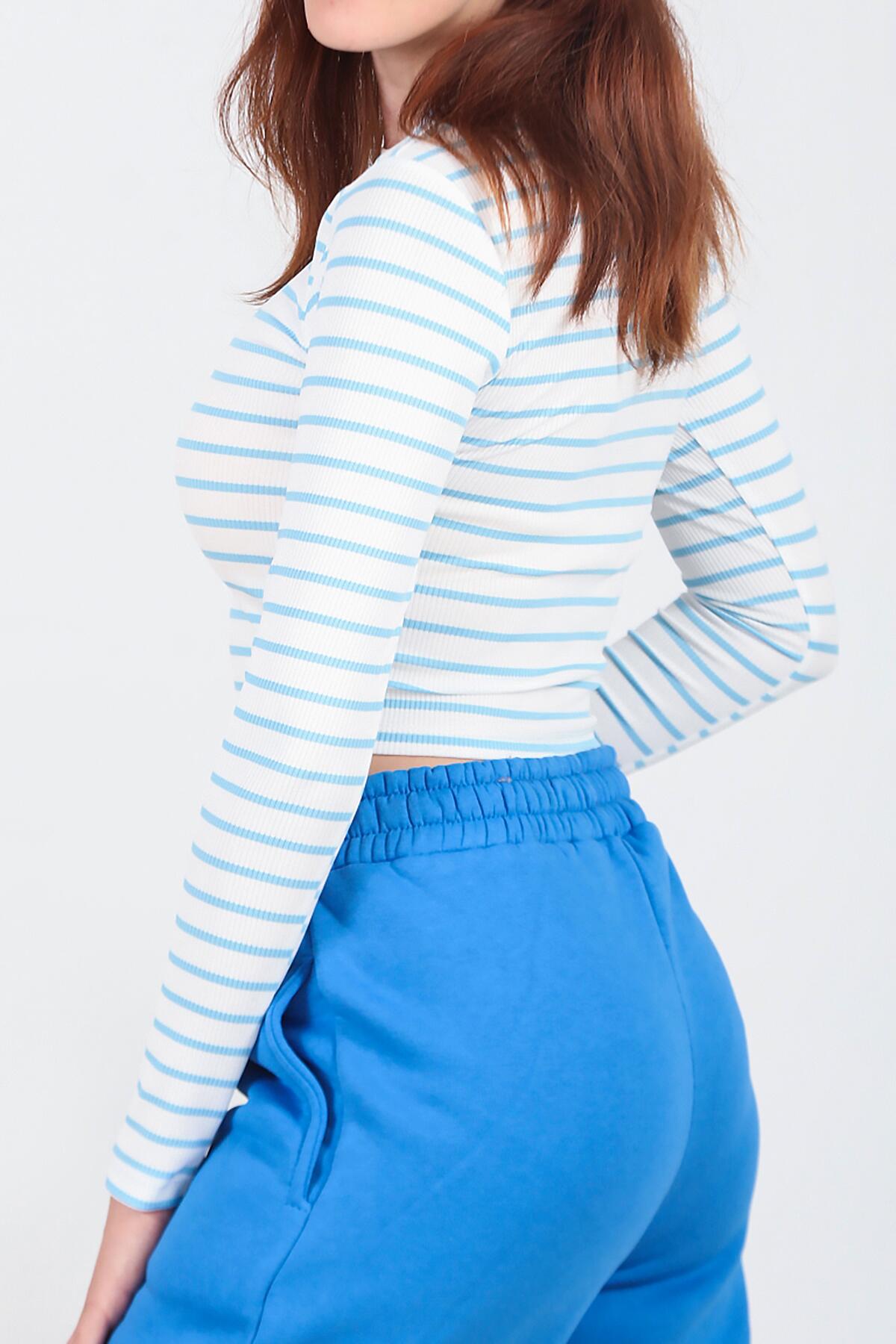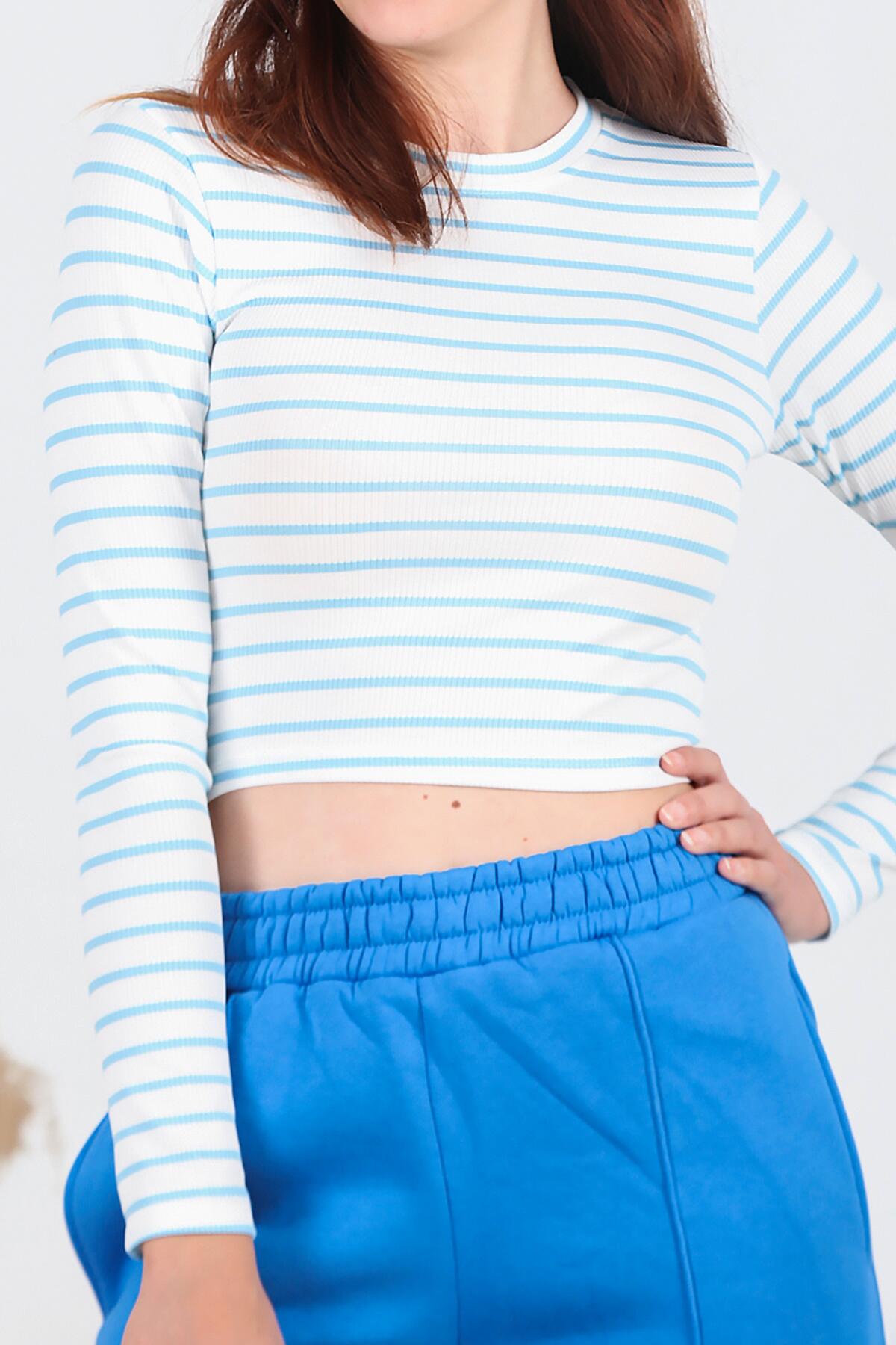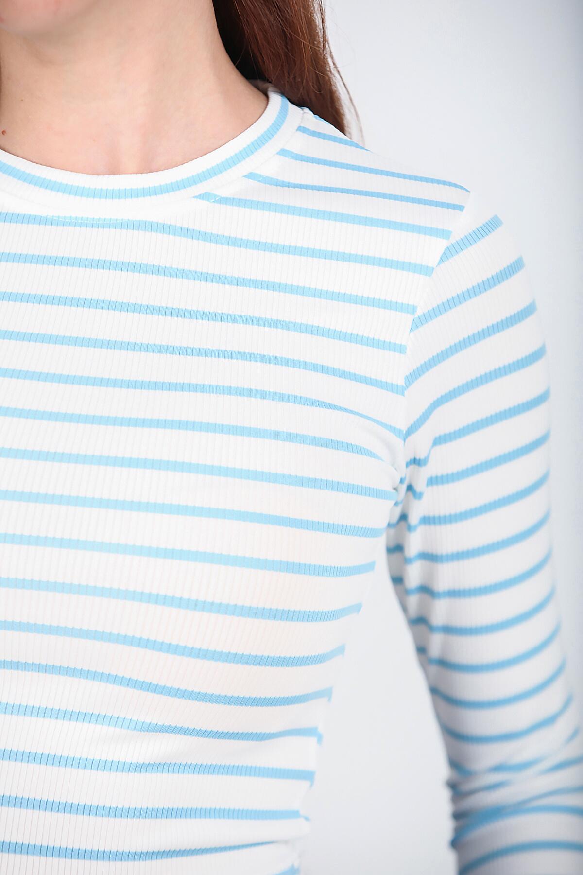 Kadın Sıfır Yaka Kaşkorse Çizgili Bluz Mavi
