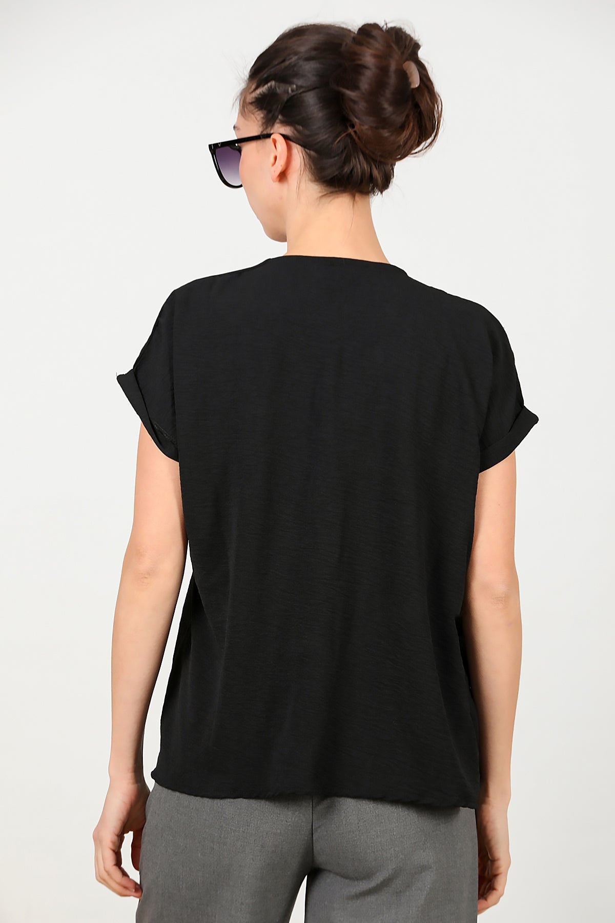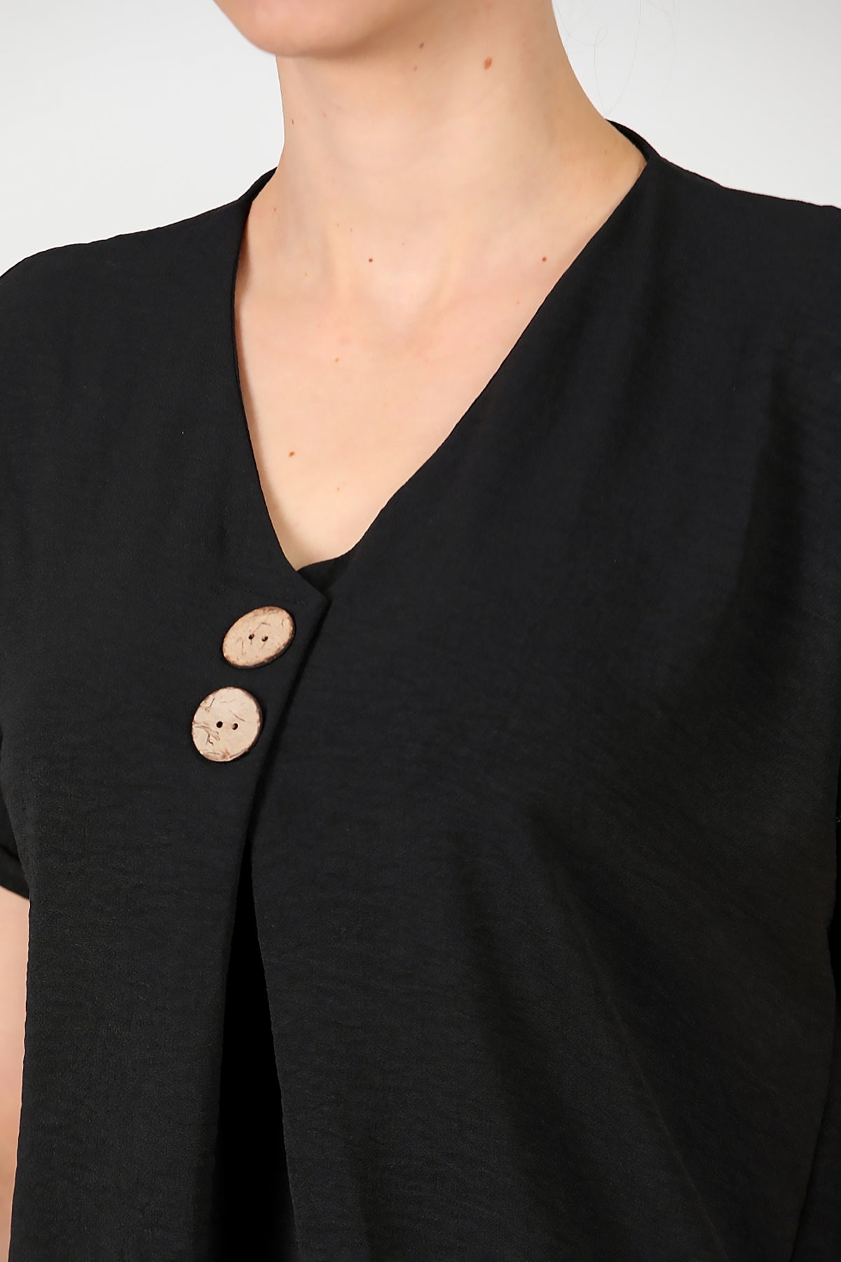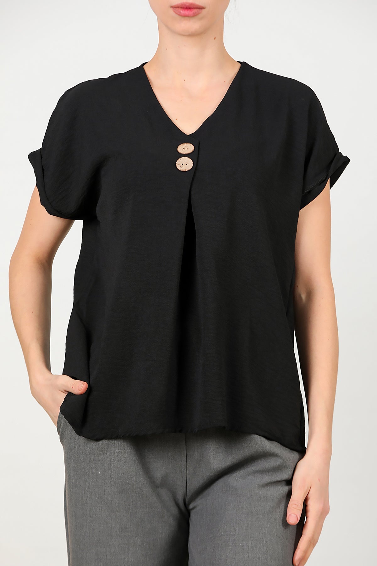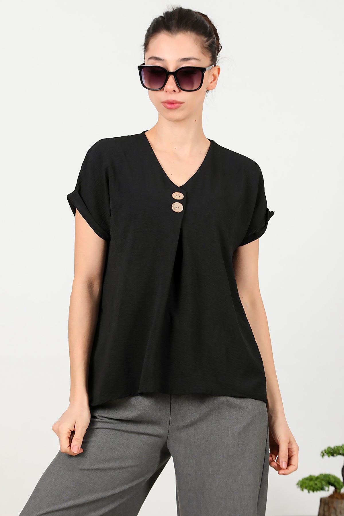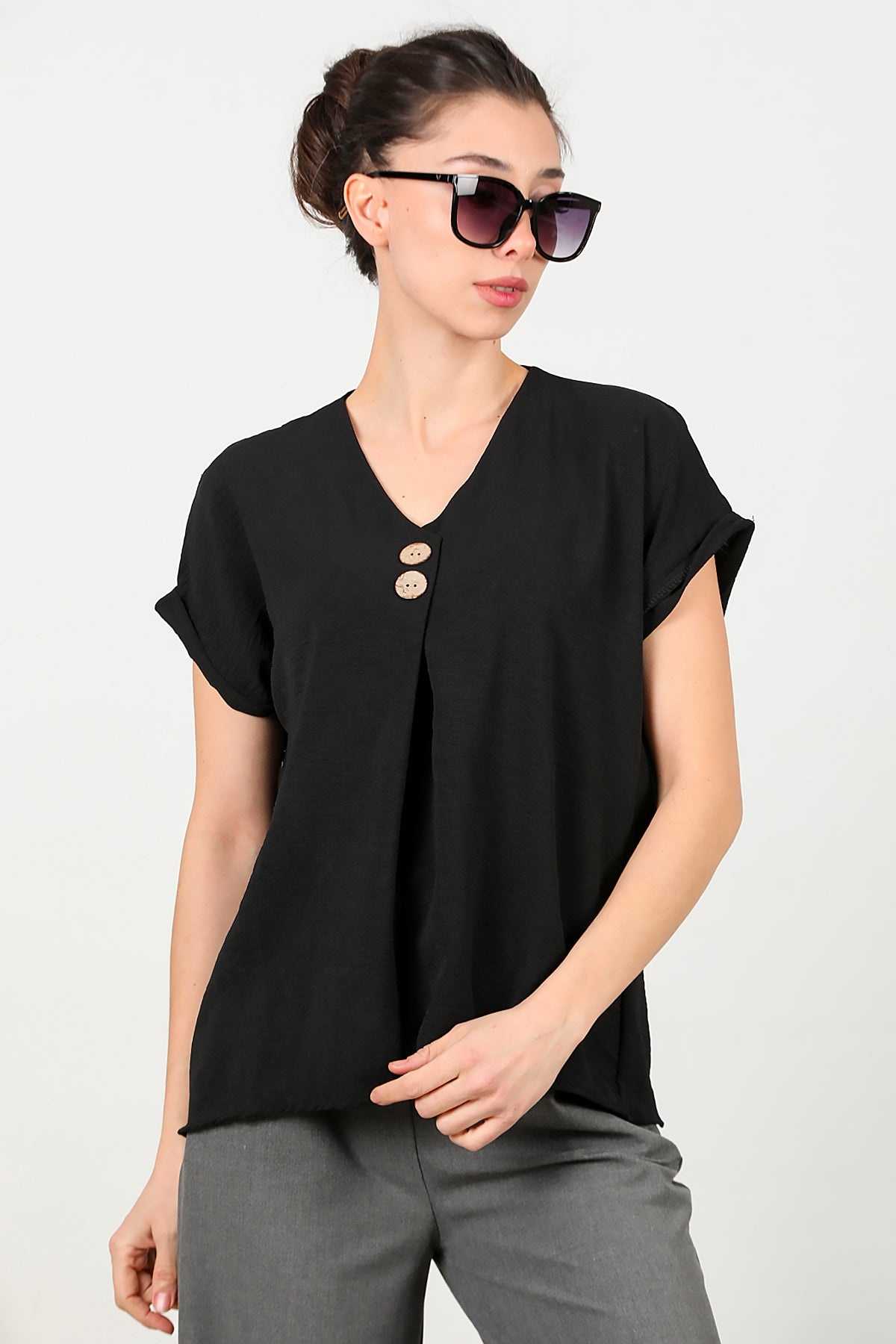 Kadın V Yaka İki Düğmeli Bluz Siyah