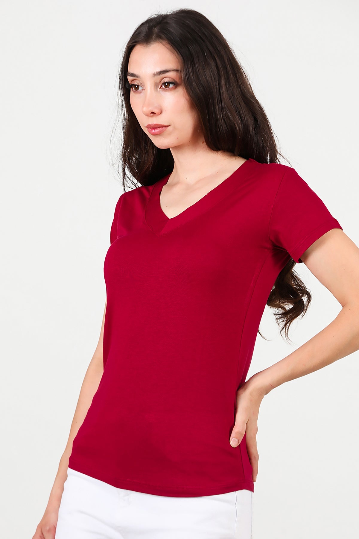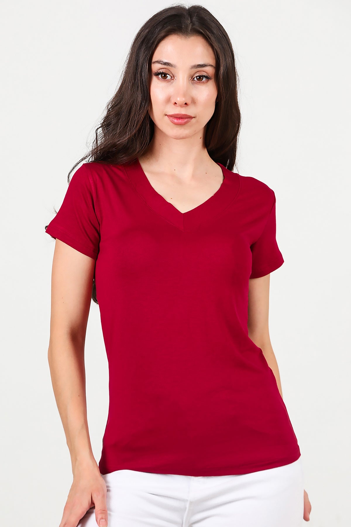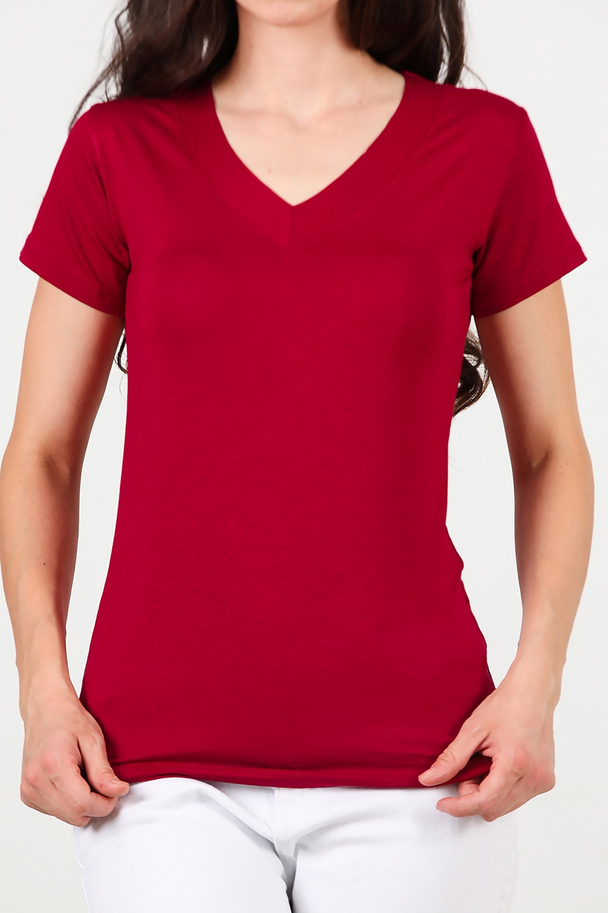 Kadın V Yaka T-shirt Bordo