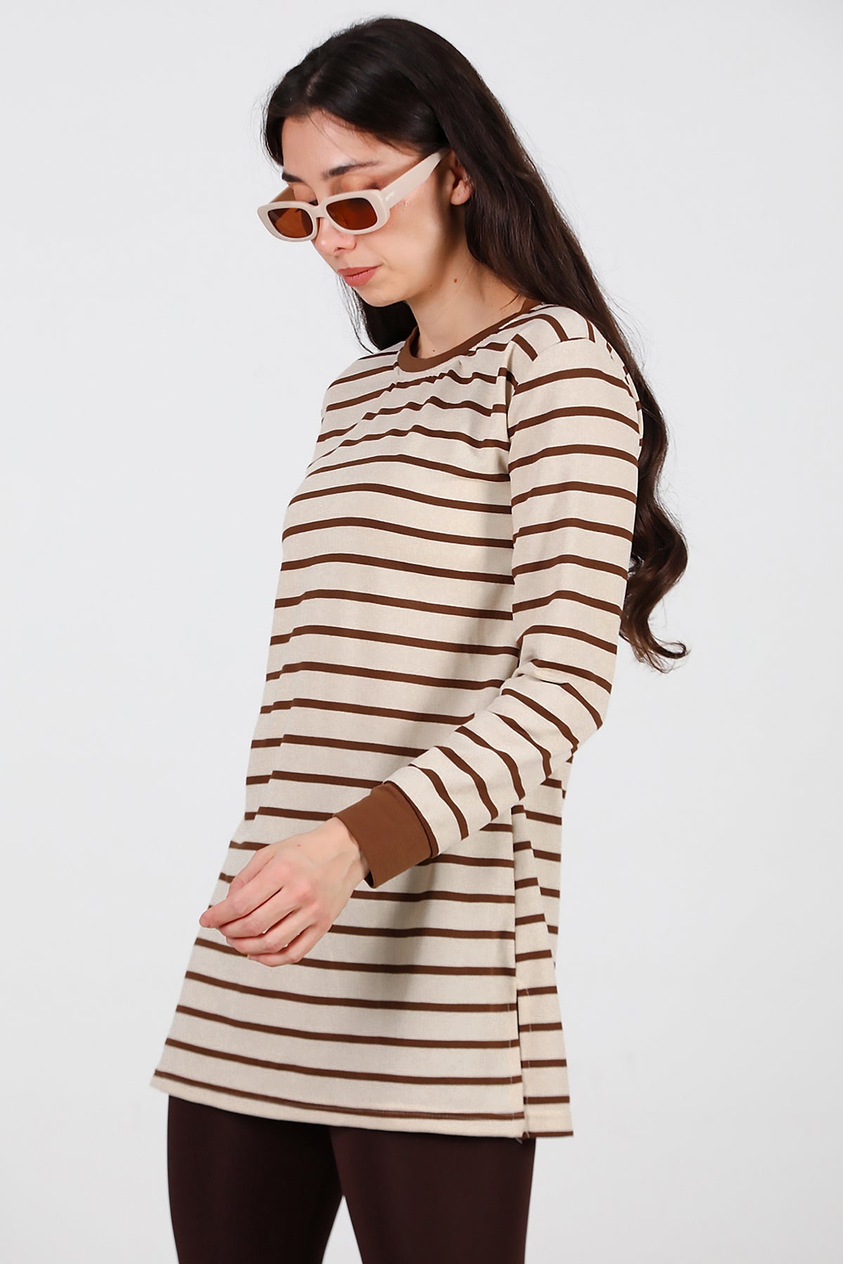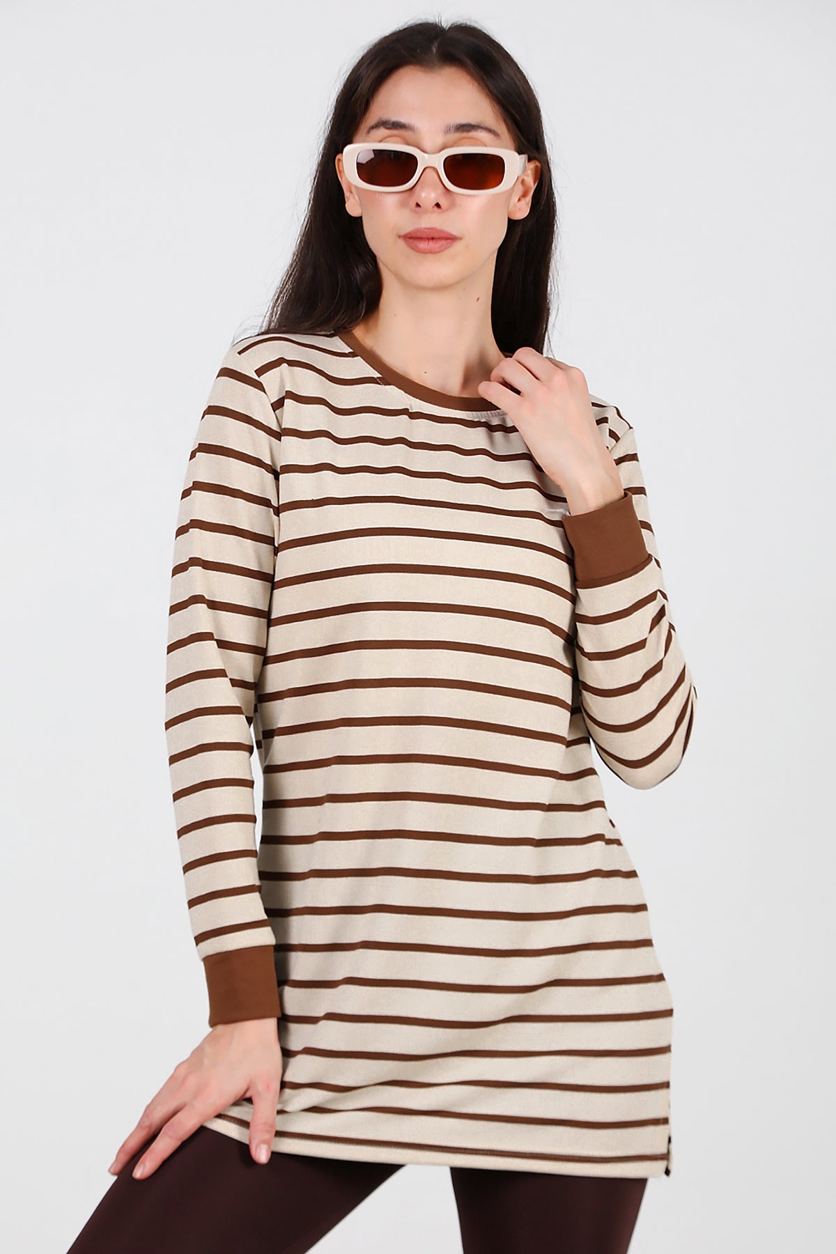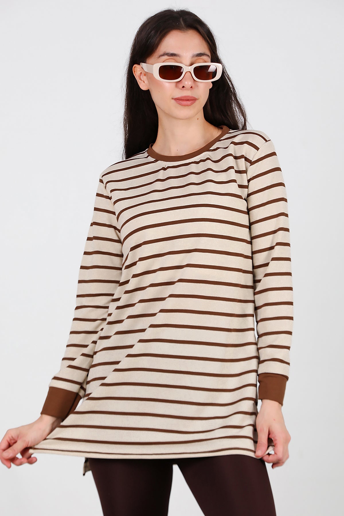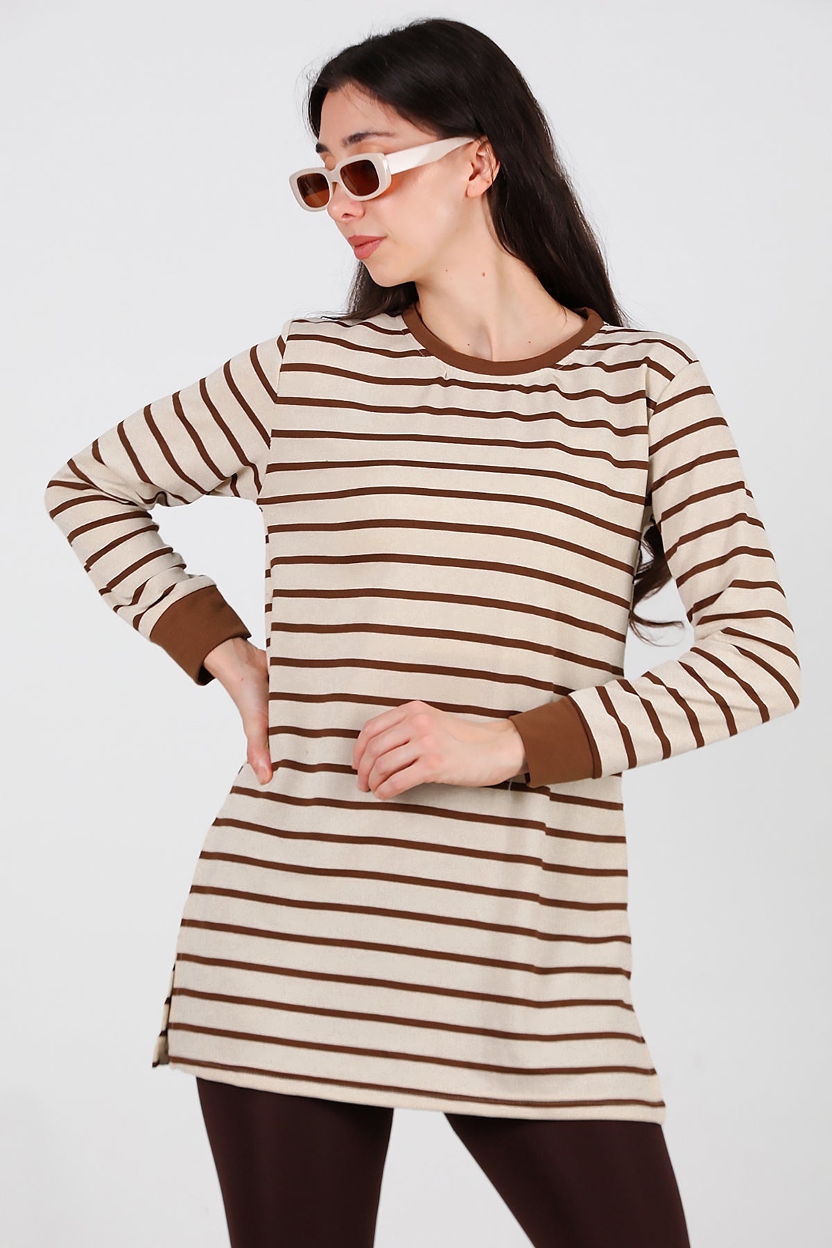 Kadın Yanı Yırtmaçlı Çizgili Tunik Kahverengi