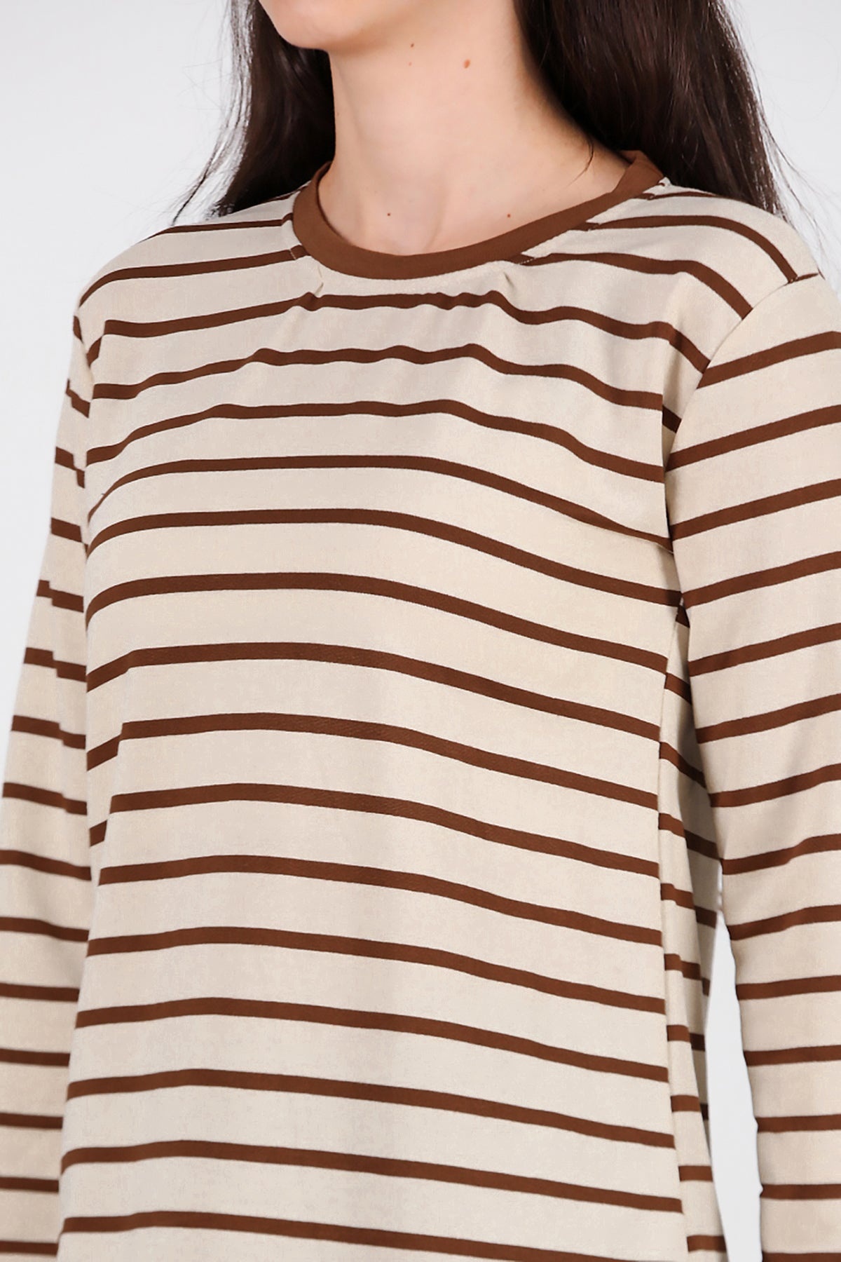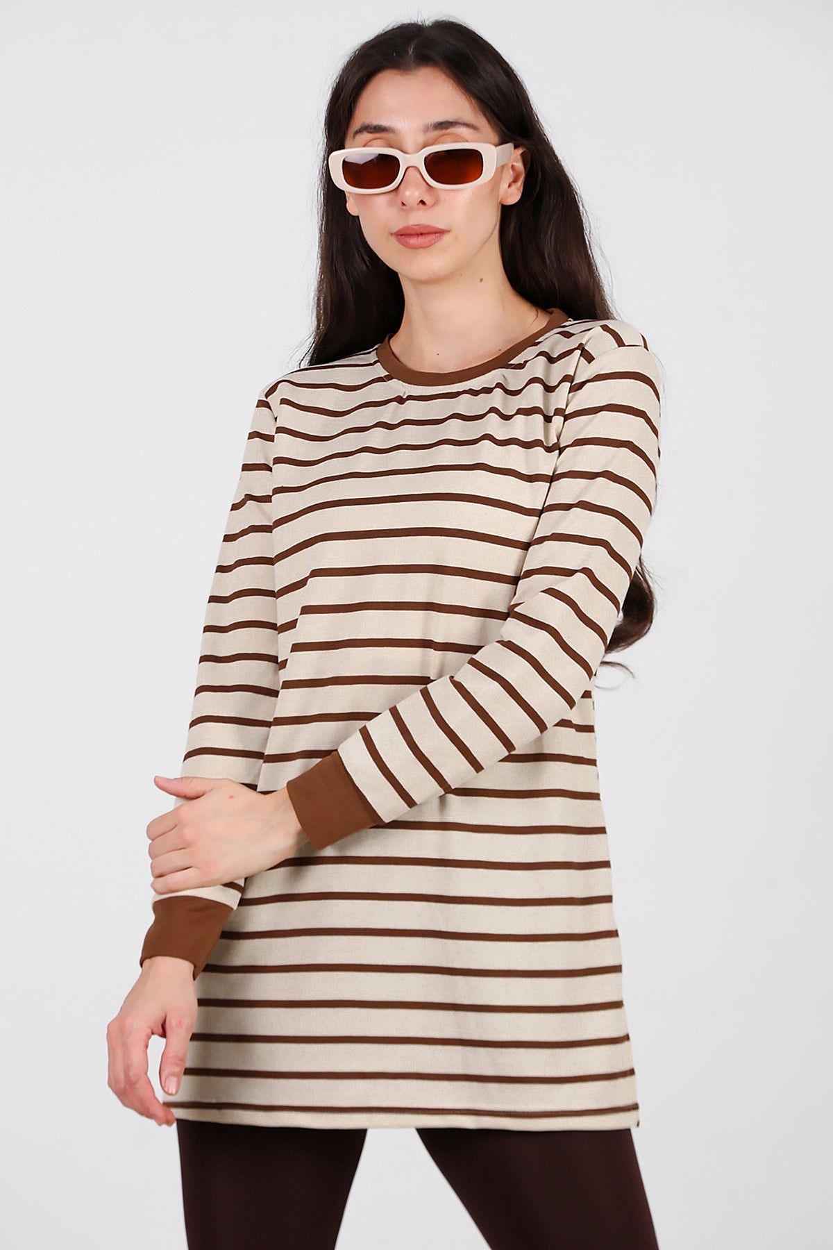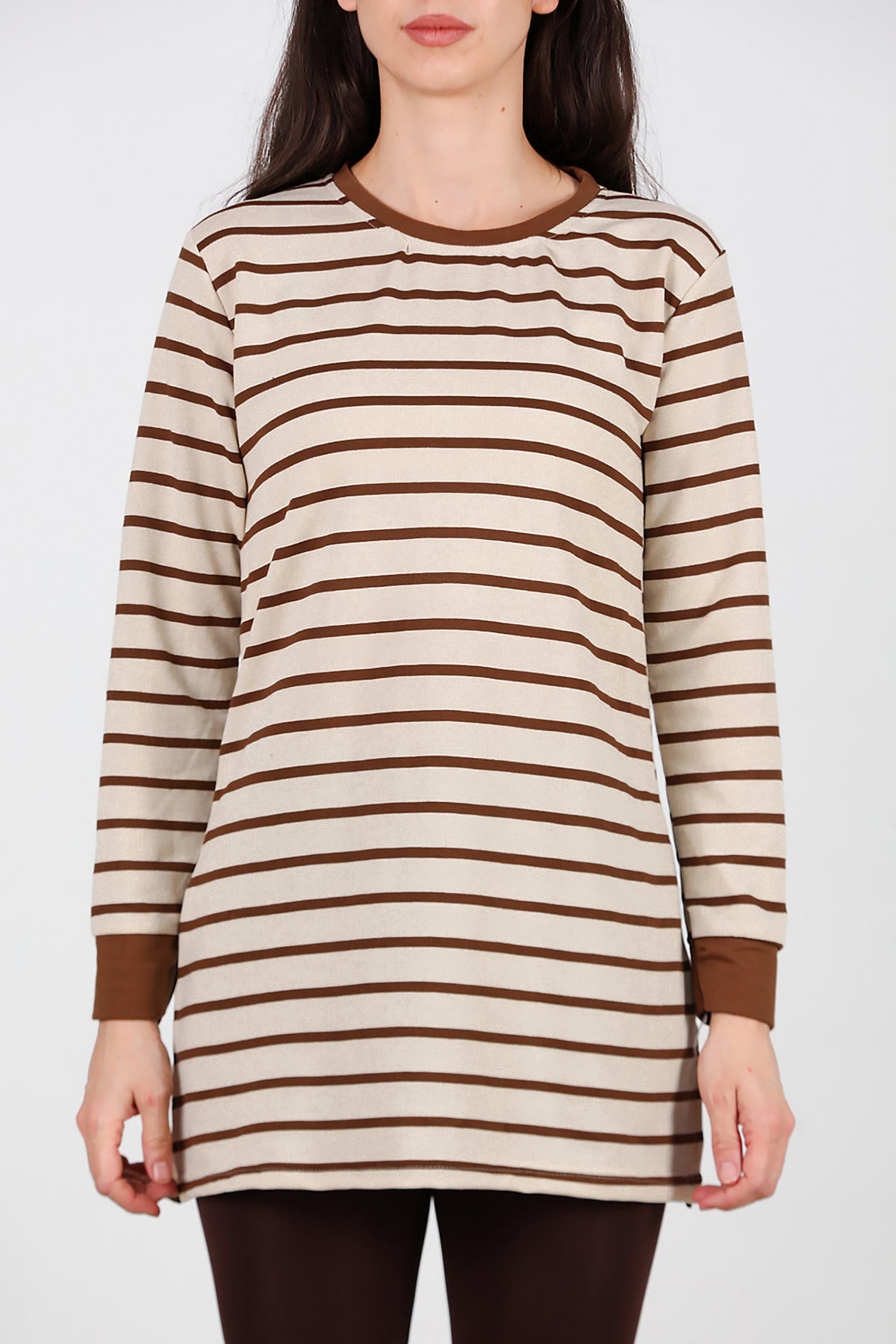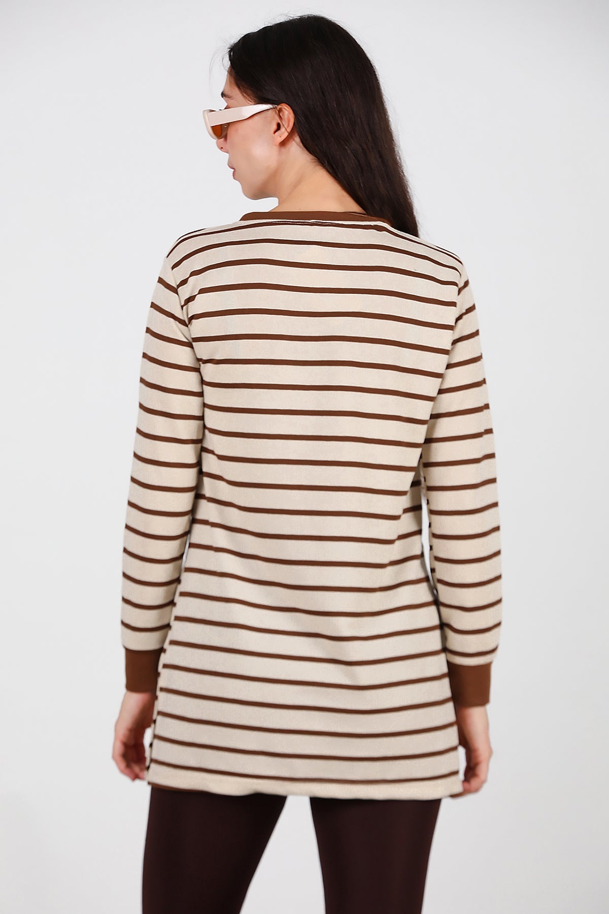 Kadın Yanı Yırtmaçlı Çizgili Tunik Kahverengi