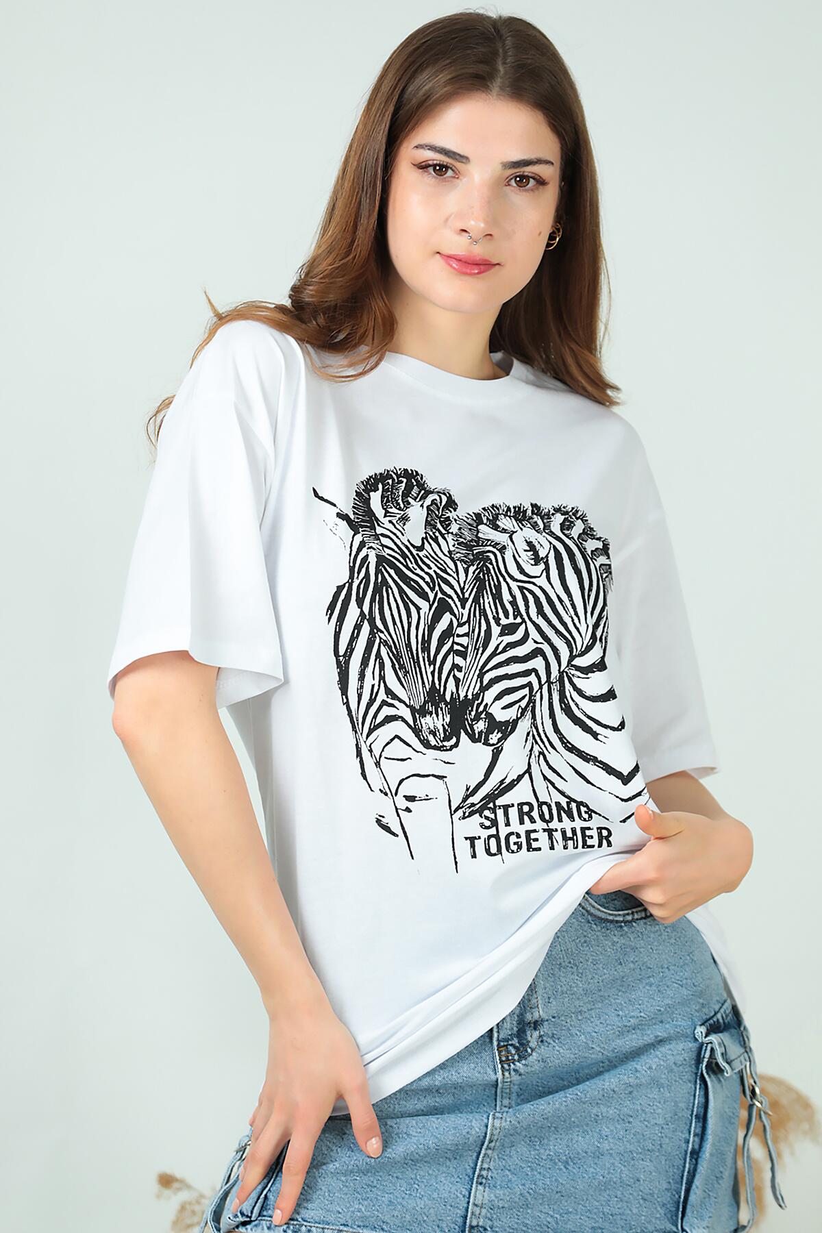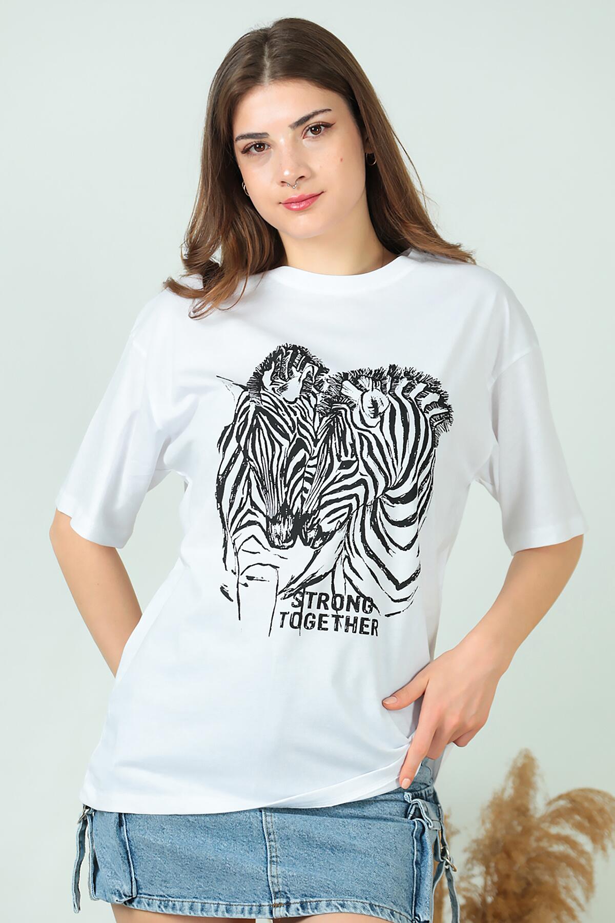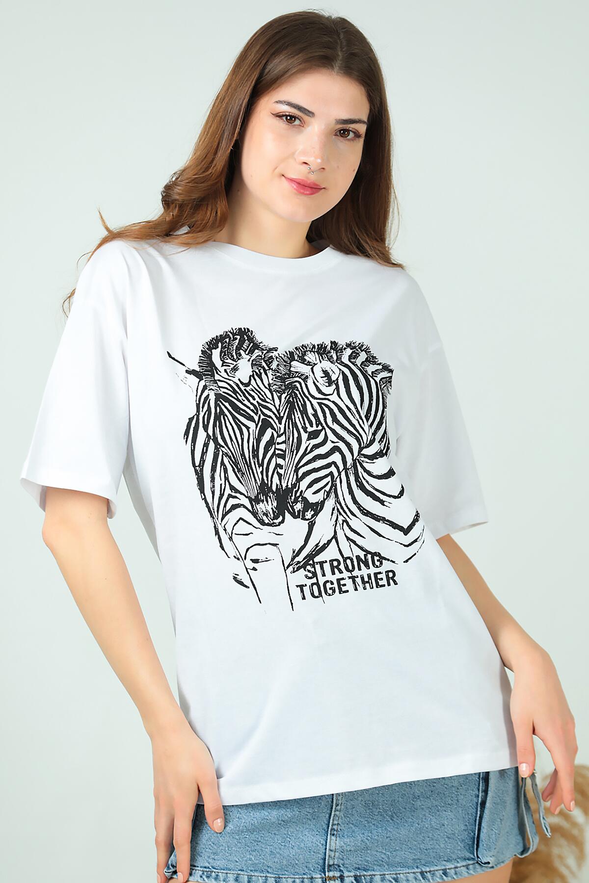 Kadın Zebra Baskılı T-shırt Beyaz