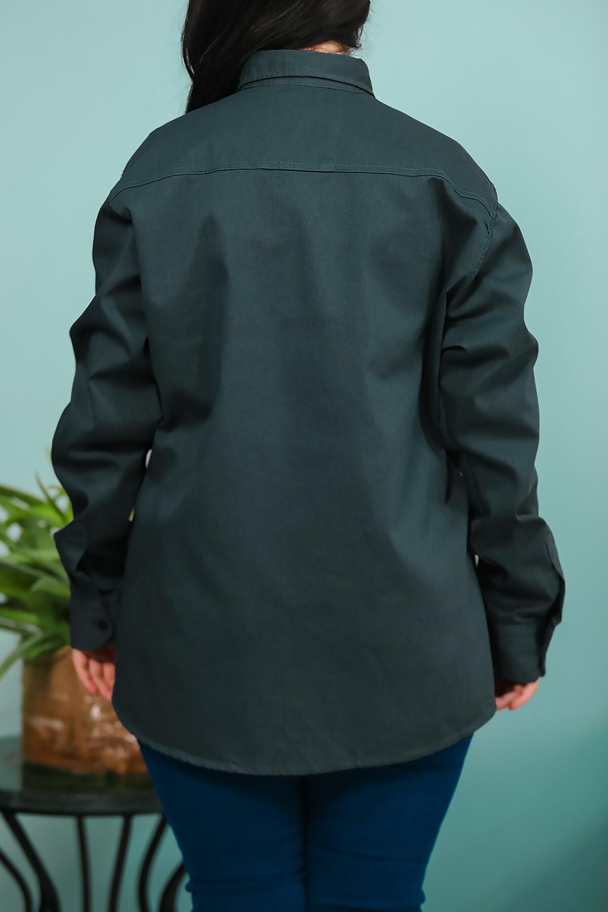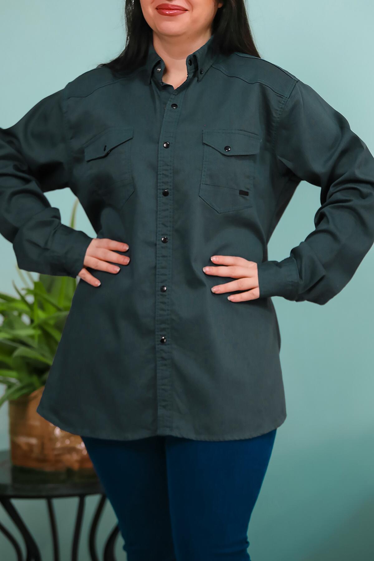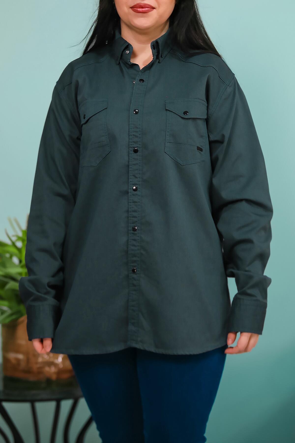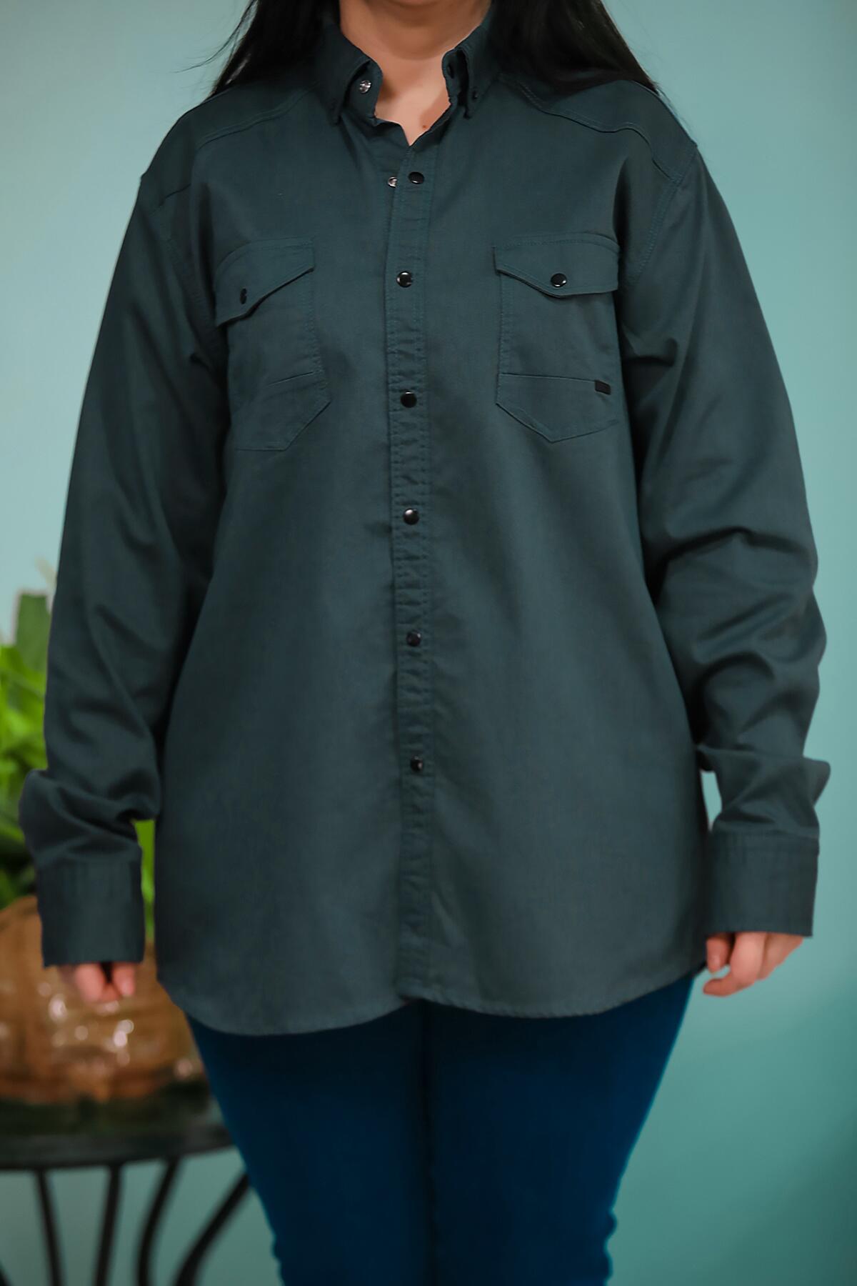 Numune Bedeni: 2XL Numune Boyu: 76 Cm Kumaş Tipi: %97 Pamuk %3 Elestan Kol: Uzun Kol Ürün Özelliği: Çıt Çıt Düğmeli , Önden İki Cepli Gömlek