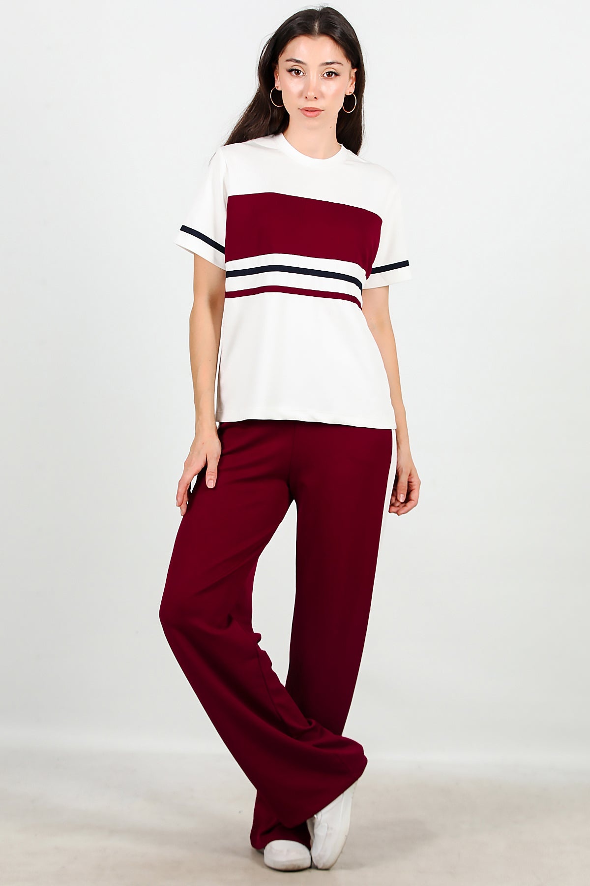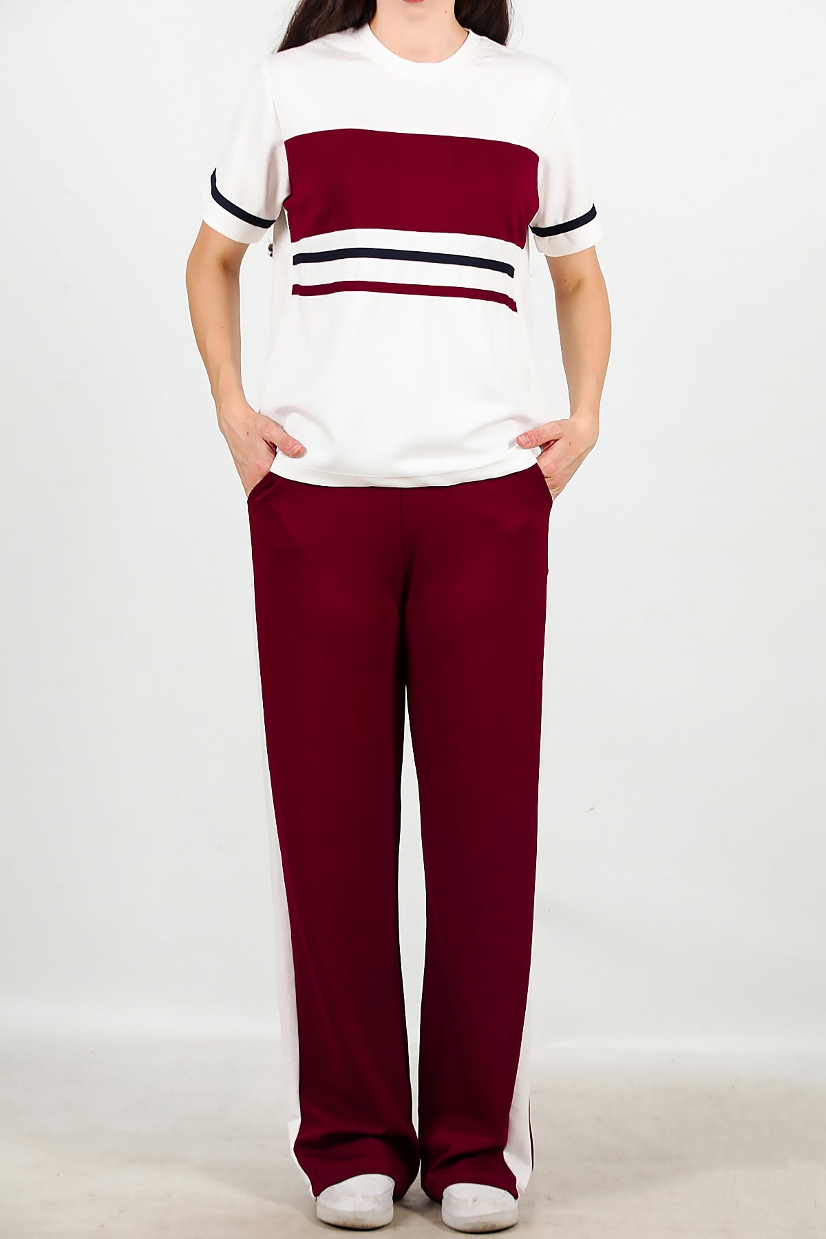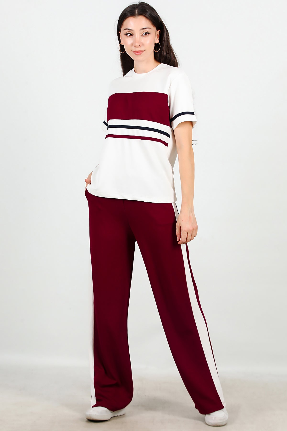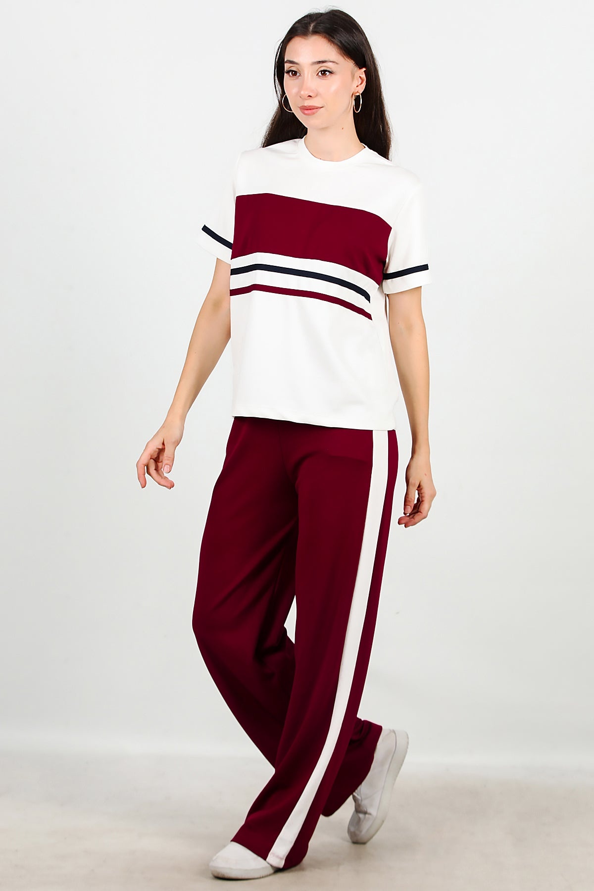 Kadın Çizgili Eşofmanlı Takım Bordo