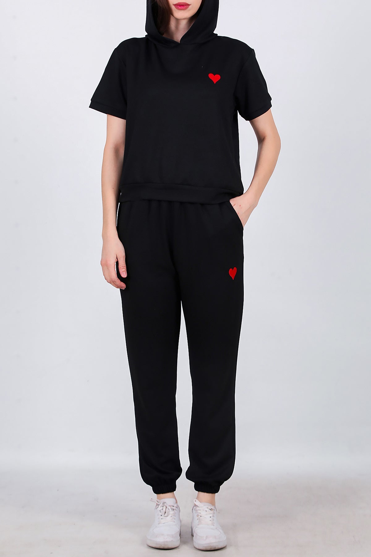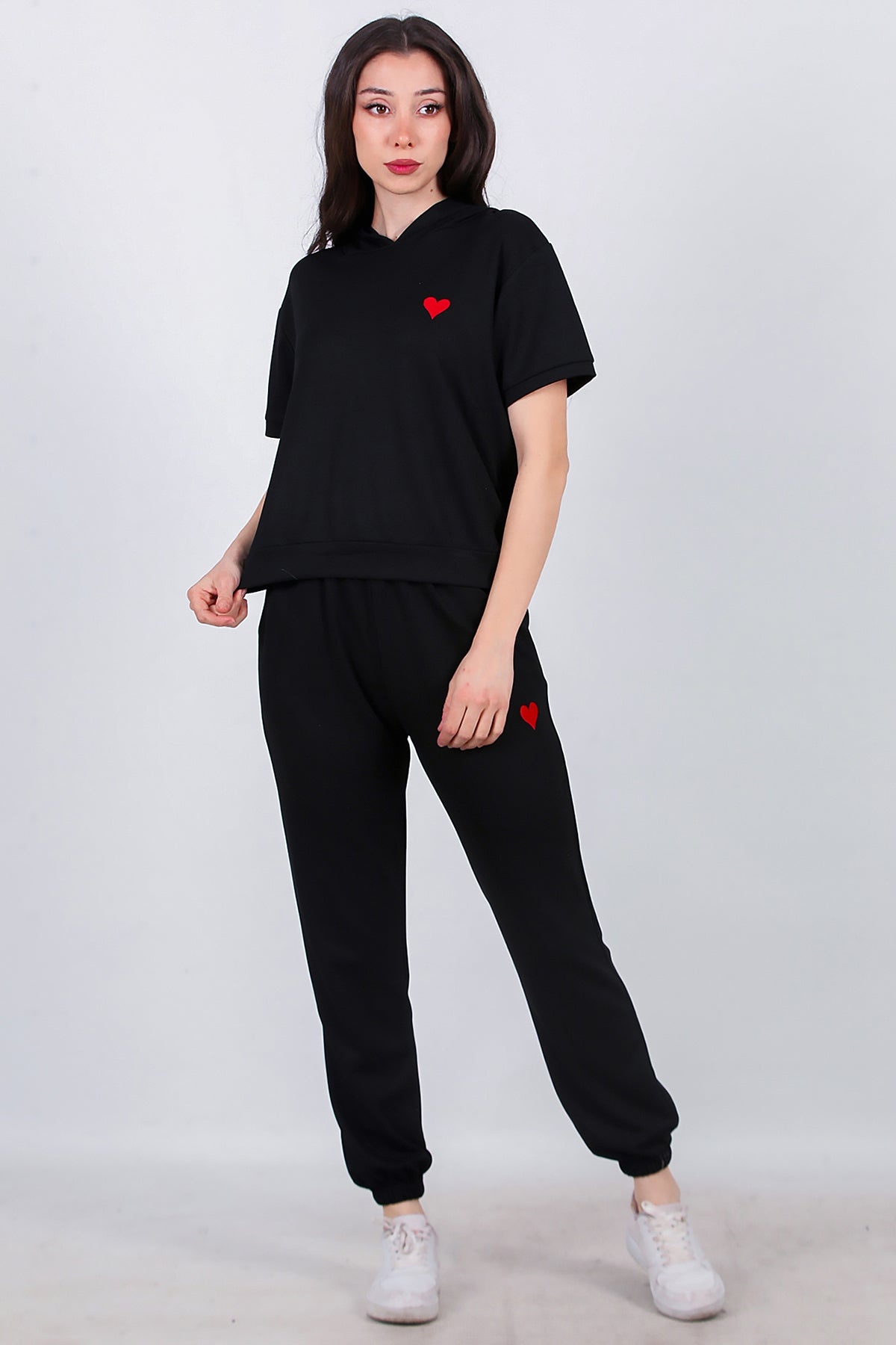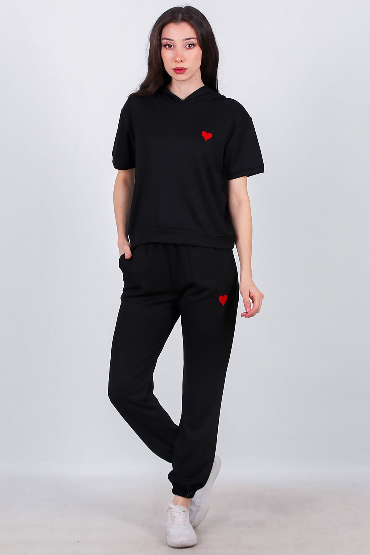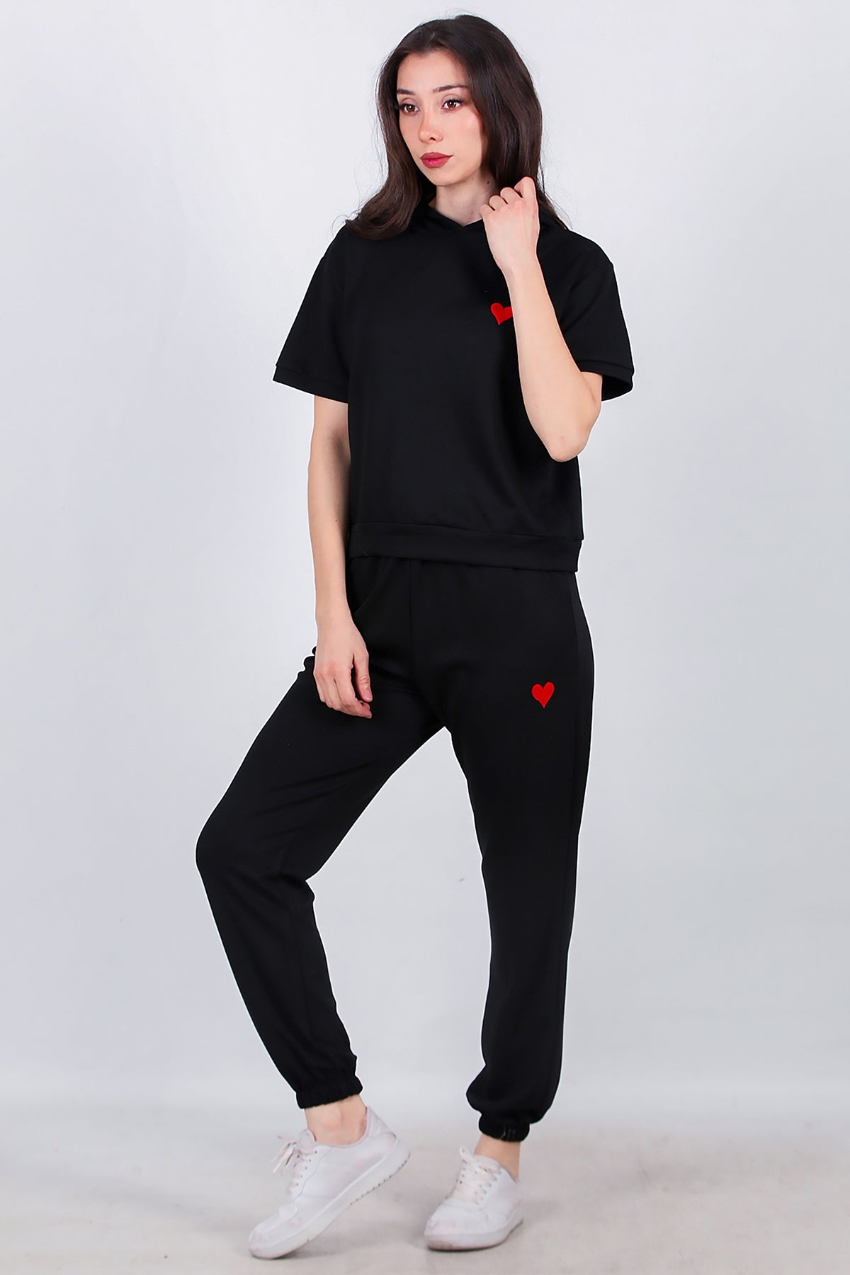 Kadın Kalp Nakışlı İkili Takım Siyah